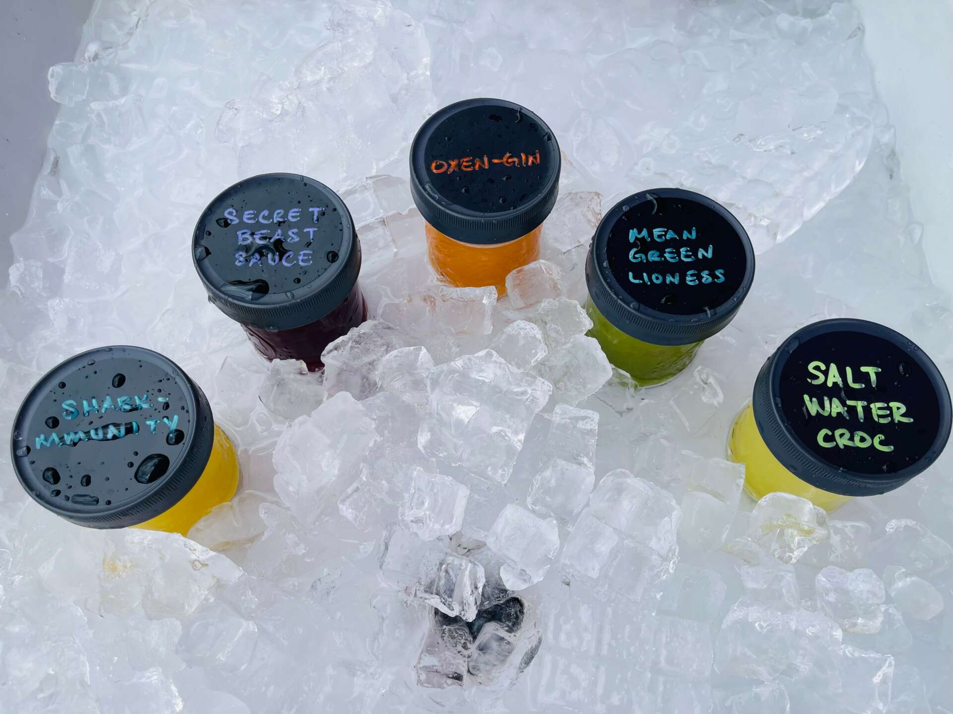 — I originally created these option for myself, whether i’m at an event, hosting an event, at the gym or riding around Houston, you can probably catch me with a mason jar filled with my Drip of choice, the option depends on what’s needed for the day. For example I start my day with some C-MOSS & Syrup of the Elders, I start my workout with Secret Beast Sauce. If I feel like my throat is scratchy, not feeling 100% or just feeling bit sluggish in that moment I’ll have a Shark-Mmunity or Oxen-Gin as a pick me up. If my stomach is acting a little funny Mean Green Lioness is THE CHOICE for the tummy reset.