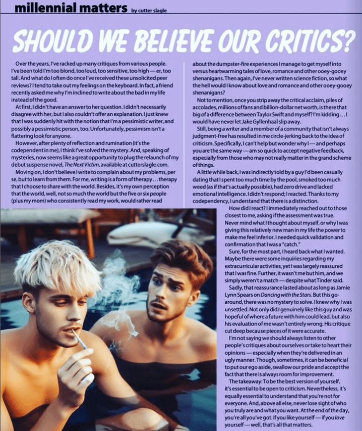My name is Cutter Slagle, and I’m a writer. I write a column for an LGBTQ+ magazine, as well as crime fiction novels. I started writing my first novel when I was 12 years old, and I think a couple of different things led to me becoming an author, specifically an author in the crime fiction space. First, I grew up in the suburbs of Ohio. I was blessed to live on a cul-de-sac with lots of other kids. As such, we were always outside, making up games, creating our own fun. In my mind (which can be a scary place!), my childhood was very much like The Goonies or an episode of Stranger Things, giving me a passion for mystery. Additionally, my mom introduced the joy of reading to me at a young age, beginning with R.L. Stine’s Goosebump novels, The Boxcar Children, Nancy Drew, and the Hardy Boys. I officially finished the first draft of my first novel in high school, and then when it came time to go to college and choose a major, I knew I wanted to pursue writing. I had an amazing professor my freshman year of college at The Ohio State University, and he helped guide me the next four years, making me not just a better writer, but a storyteller. After having a handful of short stories published for various online publications and self-publishing a murder-mystery anthology, a traditional, small press publishing house picked up my first novel (the one I started drafting when I was 12) in 2015. That same publisher published my second crime fiction novel, ‘Til Death, in 2016. Once my contract expired, I decided to re-release these two novels myself in 2023 and 2024 via Kindle Direct Publishing, which can be viewed on my website: cutterslagle.com. Today, I’m working on a new novel, one that leans towards psychological suspense. When it comes to writing, be it a column, blog article, or novel, my main goal is to entertain people. I just want readers to be able to escape their lives for a bit.