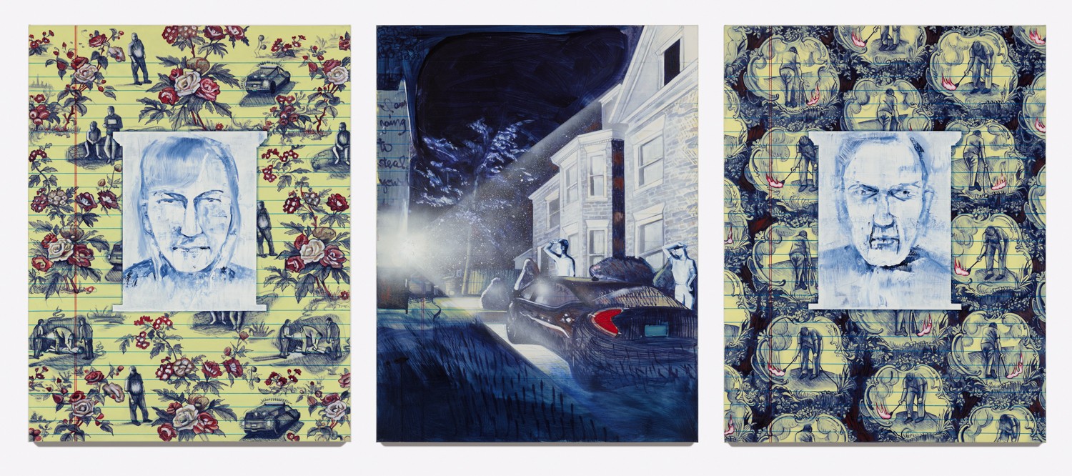 The circumstances are, that during the pandemic, for two years, my husband and I were relentlessly stalked and harassed by our next door neighbors, until we had no choice but to sell our home of eleven years and move away. I had just completed a series of paintings about my neighborhood, and was beginning to feel quite rooted when this happened. This sudden upheaval and change caused me to reflect on my identity as an artist. I was also coming back to Brooklyn, a city I lived in for fourteen years and then moved away, and everything is different. In addition to this, my situation is a mirror of my grandparents and my mother who were displaced after WWII. My paintings have a rigid formal structure and within that I experiment with content and painting applications. They are trompe l’oeil renditions of enlarged notepad drawings. The basis for this is the diary I kept to catalog the neighbor harassment. They are a specific scale, and have a color palette informed by office supplies. There could be memories of a story my uncle told me or my own memories. And the paint is applied in different ways that refer back to all my lives as a painter: muralist, graffiti artist, sign painter, house painter, studio painter. The palette refers to my lives as an administrative professional. So it’s not so much about experiencing an external place that I am in, but directly experiencing my internal life and history as an artist.