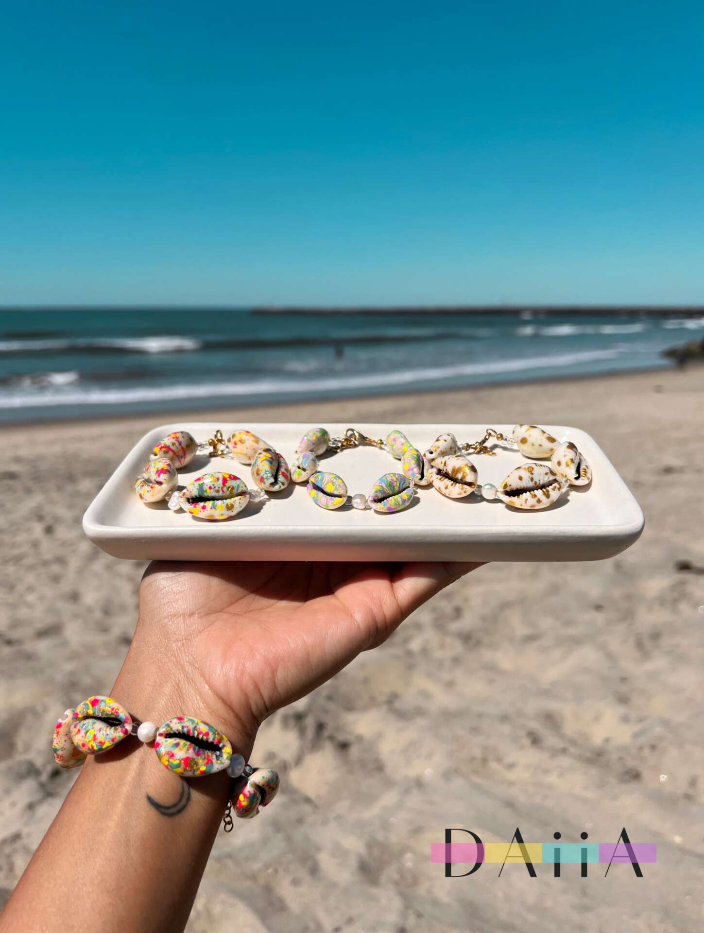 DAiiA is jewelry that also honors the ocean and those who love it. The first piece I created, is a hand-painted shell bracelet which inspired our purpose statement. Legend says cowrie shells represent the goddess of protection connected to the strength & power of the ocean. The colorful hand-painted splatters are a humble reminder that we are but a tiny speckle existing on Mother Earth, yet, we are beautiful & important. Cowrie shells also promote prosperity. The feminine pearl accents are a symbol and reminder that you are perfect because you are you.