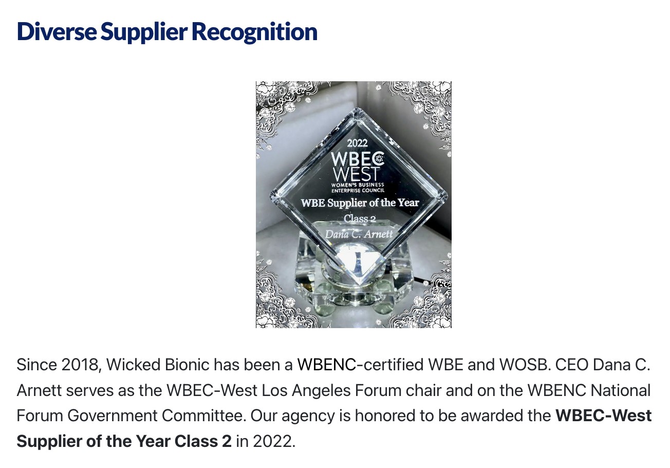 It’s every business owner’s challenge to find and convert new clients, especially in the beginning. Wicked Bionic is solidly in the government space now after eight years in business. We are working on more corporate partnerships in 2023. I am in charge of business development for the company, and we are always looking for whales as our clients. We started out working with other small businesses, but after two years, we needed to grow to a larger market segment to support us and our growing team. My strategy is a long-term play – relationship building. I think this is something necessary for any business owner no matter where they are in their journey.