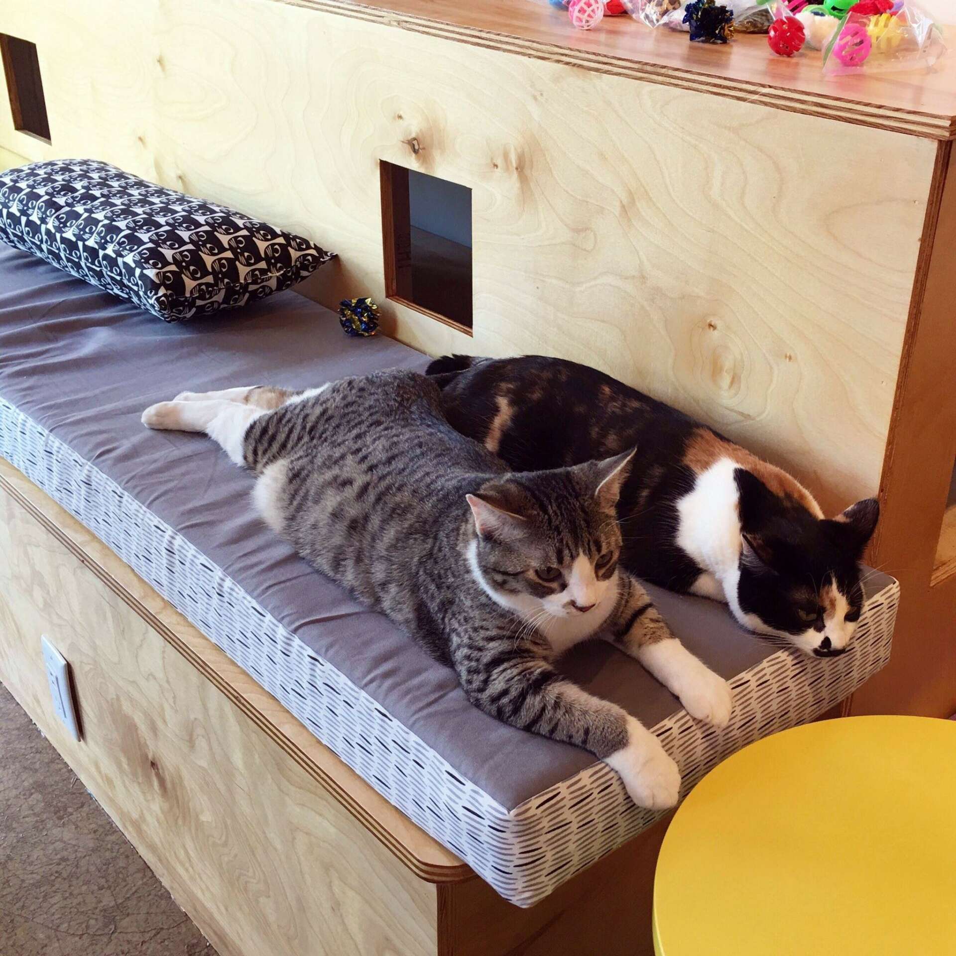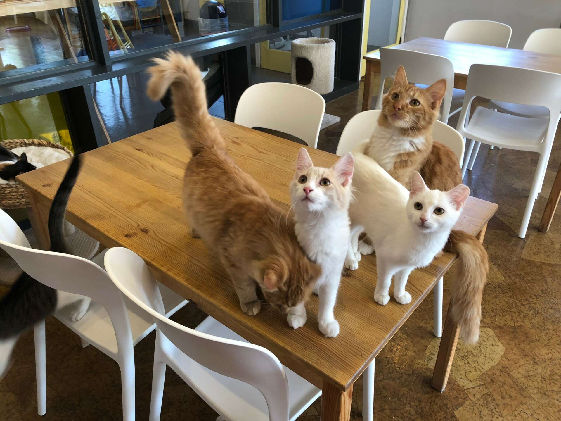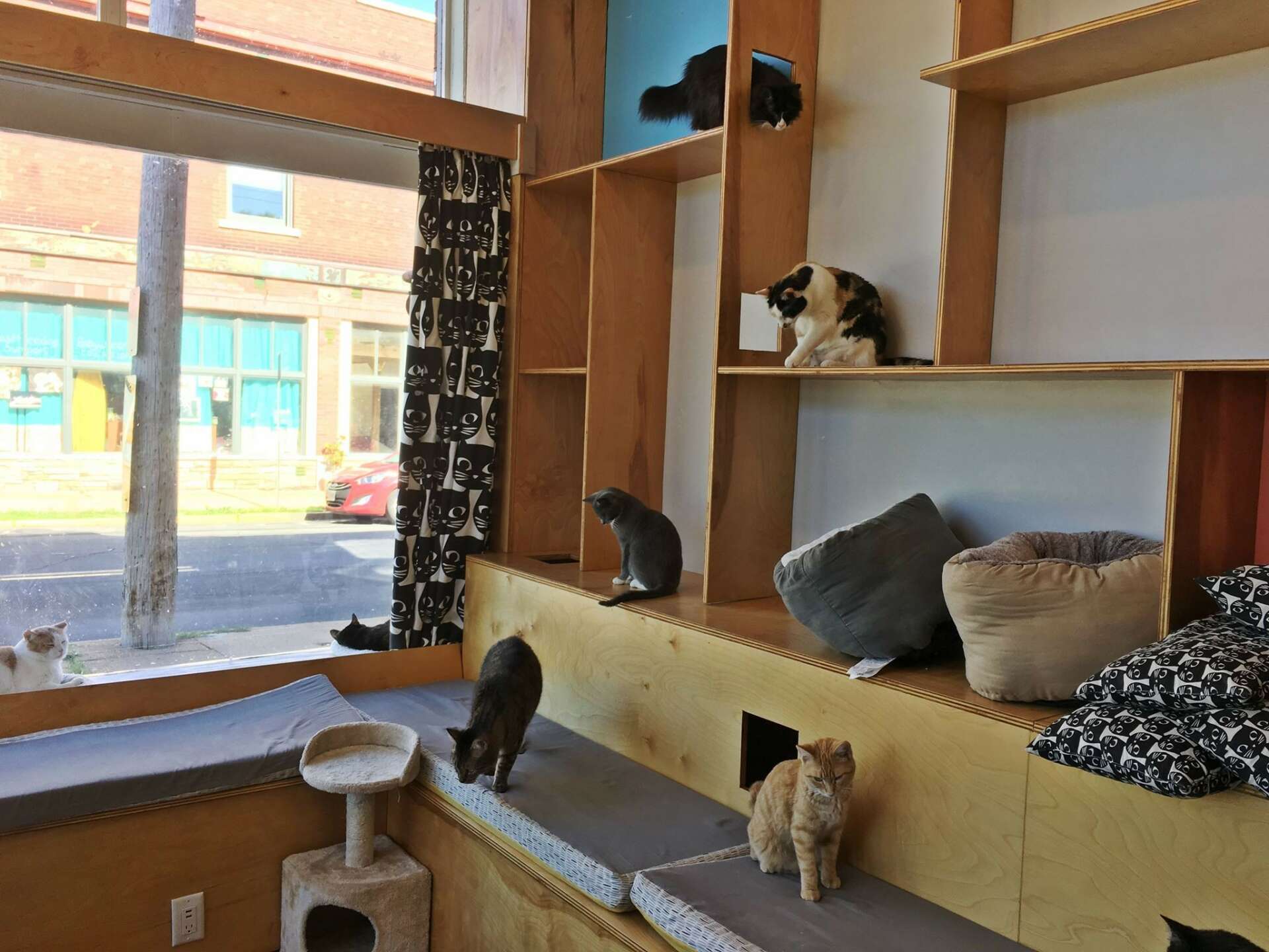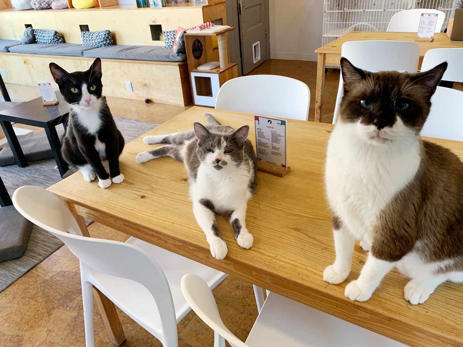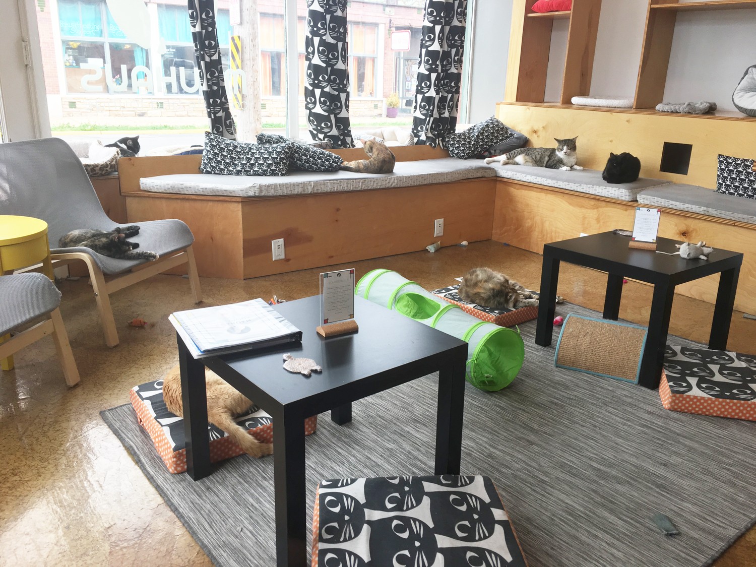 My husband and I were visiting his father in Thailand for Christmas in 2014. We knew that there were cat cafes in Bangkok and I made it a priority to visit one. We spent Christmas Day at Purr Cat Cafe Club in Bangkok and pretty quickly decided that we needed to start a cat cafe at home. We both worked full time at our software company, so starting a cafe was not something we planned on, but we both felt really strongly that we wanted to share this experience with others. The other side of it was that there is a massive stray cat issue in Thailand and the cats at the cat cafes are all specialty breeds and are not adoptable, so it was very sad to watch people pay to visit the cats at the cafe, while this did not help the cats who really needed it. We knew that if we were going to do this we were going to solve a problem and help cats find homes. It took us 2 years from concept to opening day but it was really worth the time to get it done right. Partnering with Stray Haven Feline Rescue has been amazing and we have helped find homes for over 625 cats so far!