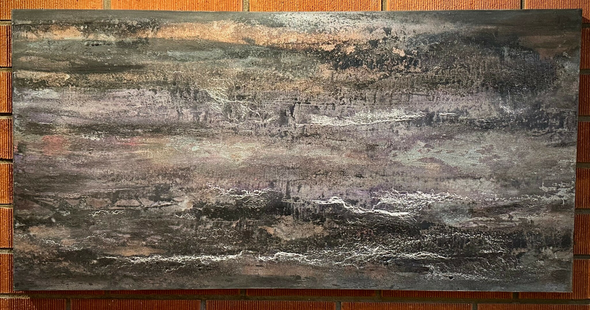 No materials or subjects are off limits and I begin each piece with only an emotional state and perhaps a memory. I rarely use paintbrushes, frequently use my fingers and love to mix additives such as oils, wax, baking soda, salt, or coffee to coax out new compositions and reactions. I embrace some natural elements such as heat, rain or sun in my creative processes and I prefer to work outside as much as possible.
