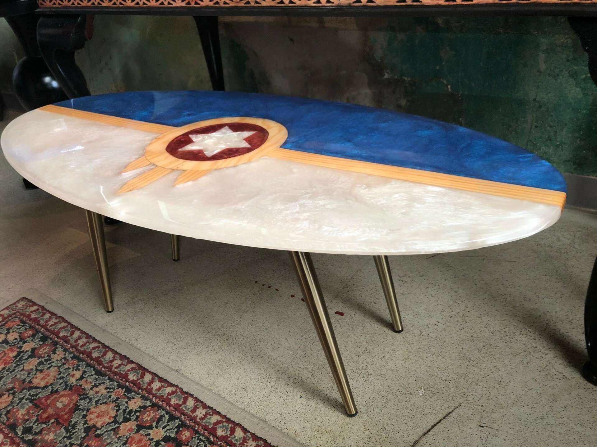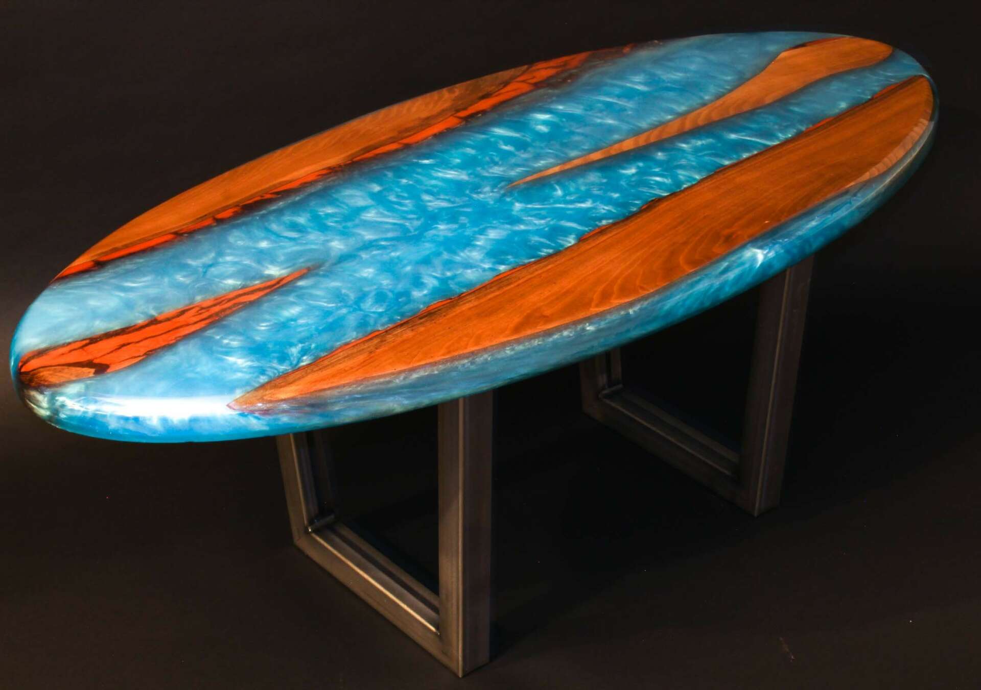 The crazy amazing journey of my life has taken me right here to Tulsa OK, to create DABAKH Studios where I get to utilize my above-mentioned experiences to create unique beautiful works of art. I make one-of-a-kind pieces, be it paintings, vases, urns or other turned styled pieces and tables of all shapes, sizes, and colors. I do not do the make a hundred of a thing and sell it at shows. There’s nothing wrong with that at all, its just not what I like to do. I like to focus on making the one instead of the many. One thing I would like any prospective client to know is that I am absolutely fearless and will try anything to make their one-of-a-kind piece. I have made a 10’ table for a local recording studio that had 40 gallons of resin in it making it 3” thick. There is no playing it safe with that much resin in one pour…the resin company was so excited about a pour that large that they were on the phone with me every day for a week making sure it was going to plan. It also had 20 full sized records in it. This table is over 500lbs and putting it on a lift, over my head and hand cranking it to a slim window of the third floor was both exhilarating and terrifying all at once! At the end of the day, a lot of very famous musicians have gotten to see and sit at one of my tables. That’s a hell of a thing. Fear does not allow stories like this to happen. Every one of my clients get that same fearlessness and dedication to their piece as that table and I am always looking for the next adventure