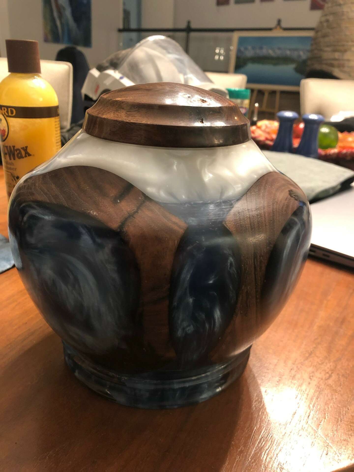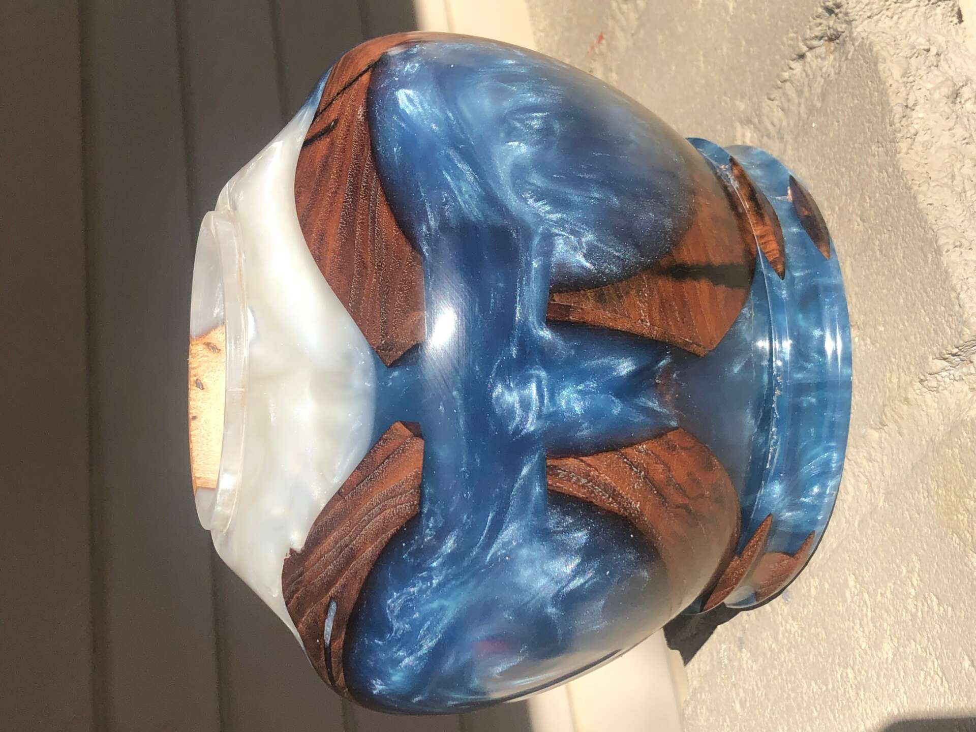 One year ago, my Dad passed away. He was sick and had been in a home for a while and we knew his time was growing short, but ya never really see it coming do you? We got the dreaded call that if we wanted to see him one more time, we needed to leave ASAP! Being in Oklahoma, the drive to Florida was 18 hours so we packed the RV and hit the road and drove through the night non-stop… we missed him by 3 hours. He was a minister and an Air Force Vietnam Vet; and being retired Air Force myself, I wanted to do something that would both honor and encompass those things that he was so proud of, so I decided to make his urn. Not just any urn, one just for him. I took the rest of the day to rest and got right back on the road to Oklahoma first thing the next day. Once I got home, I only had 3 days to make the blank, turn it and get back on the road to make the funeral in time, so to say time was of the essence would be a huge understatement. It’s here that I would like to say that all went perfectly… but that’s just not the truth of it… in typical “Dad Fashion” it became difficult. Making the mold went perfectly. I placed walnut in a bucket in a way that created crosses in the negative space, in blue, white and steel colored resin. This was a three gallon pour as an urn of this size is substantial, so thankfully, this part was the part that went to plan. It was in the turning that things got interesting. It fought me… every.step.of.the.way. It chipped. It chunked. It flew off the lathe…TWICE! It was like the old man was right there over my shoulder, giving me a hard time, which tracks, as that was something of a hobby of his; the man loved to get folks riled up and was an expert at it. Mercifully, I was able to finish it as I intended with enough time to get a little rest before I drove back to Florida for the funeral. By the end of it all, I did in 3 days (with 4500 miles in between) what normally takes me about 2 weeks and it is one of my favorite large turned pieces still to this day and ranks right up there in the achievement category for me.