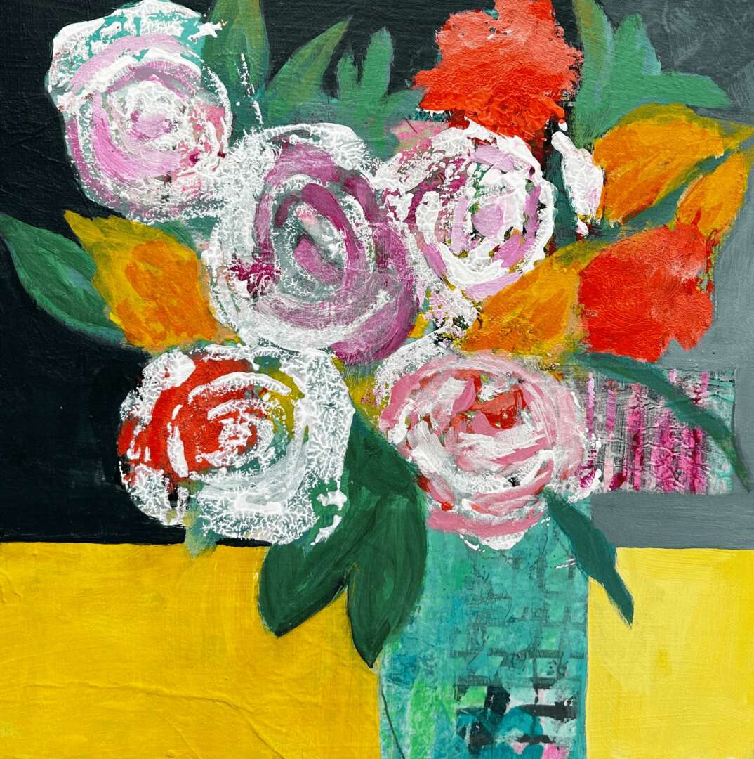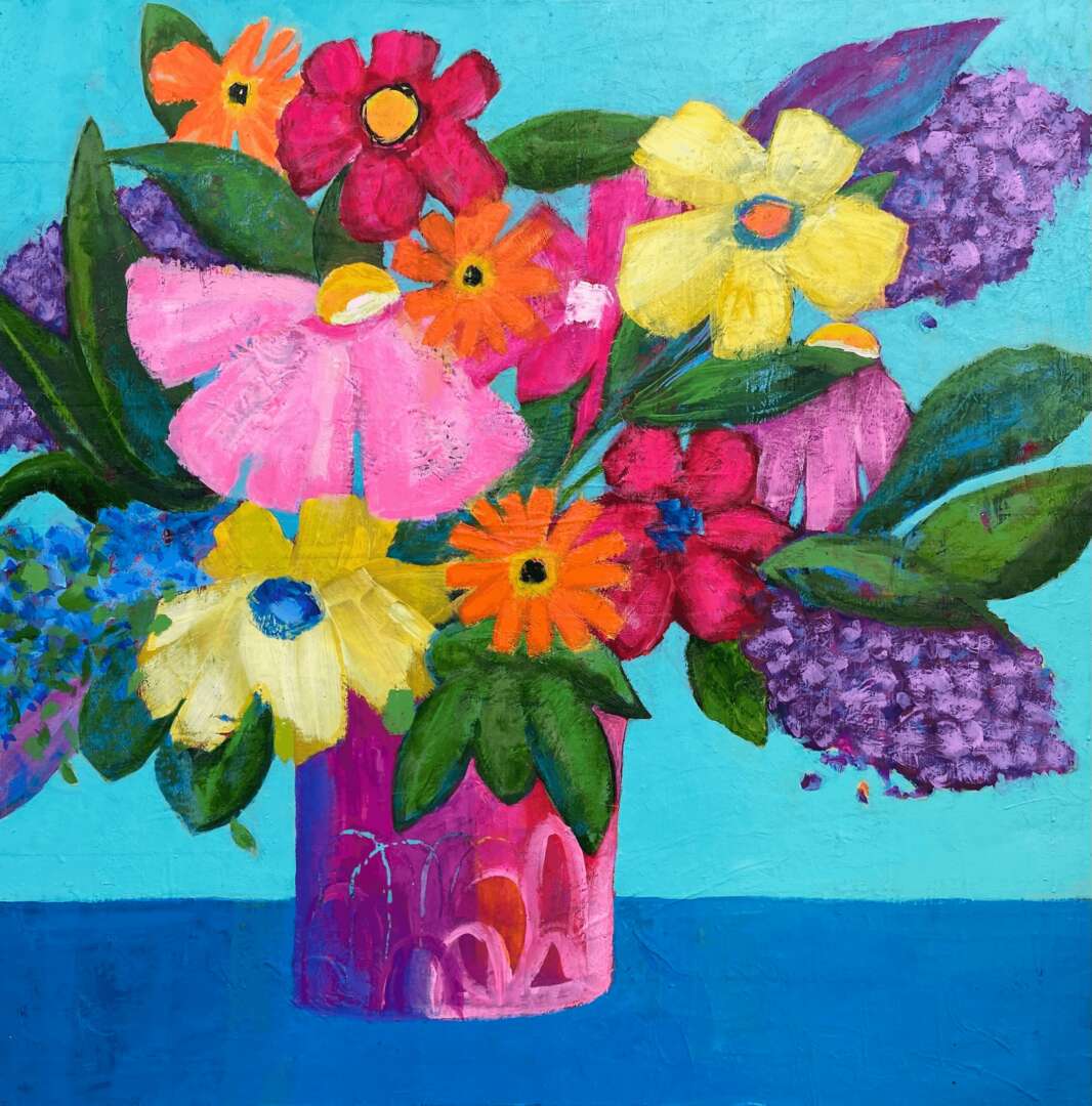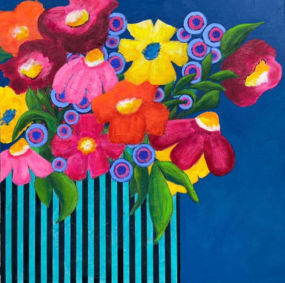 I started taking the occasional painting course over 50 years ago and only dabbled here and there. Around 2002 I became more interested in painting and took lessons in watercolour. That led to lessons in acrylics because I was drawn to the vibrant bold colours. It started with realism until I realized how it was such a perfectionistic practice – I wanted to feel freer. I was fortunate enough to attend a 4 day workshop that encouraged just that and it opened a whole new world. Around this time I retired which gave me more free time to explore and practice. I was fortunate to have my work accepted into two galleries. At that point I became bored with what I was painting and felt no direction. I quit painting for 6 years and didn’t see myself returning to it. During covid I took an online 2 month abstract course and fell in love with it. I learned to play and experiment with no plan. It was liberating! It fit with who I am – an intuitive painter.