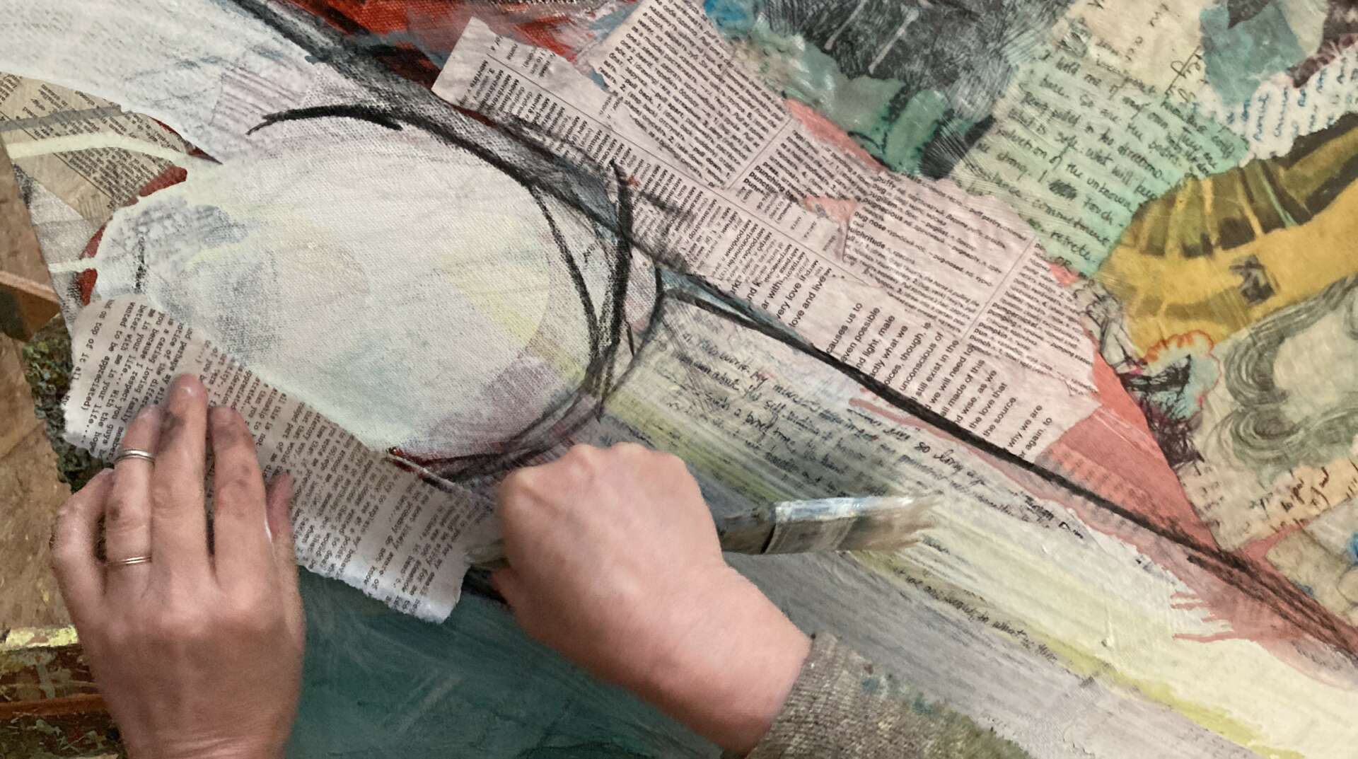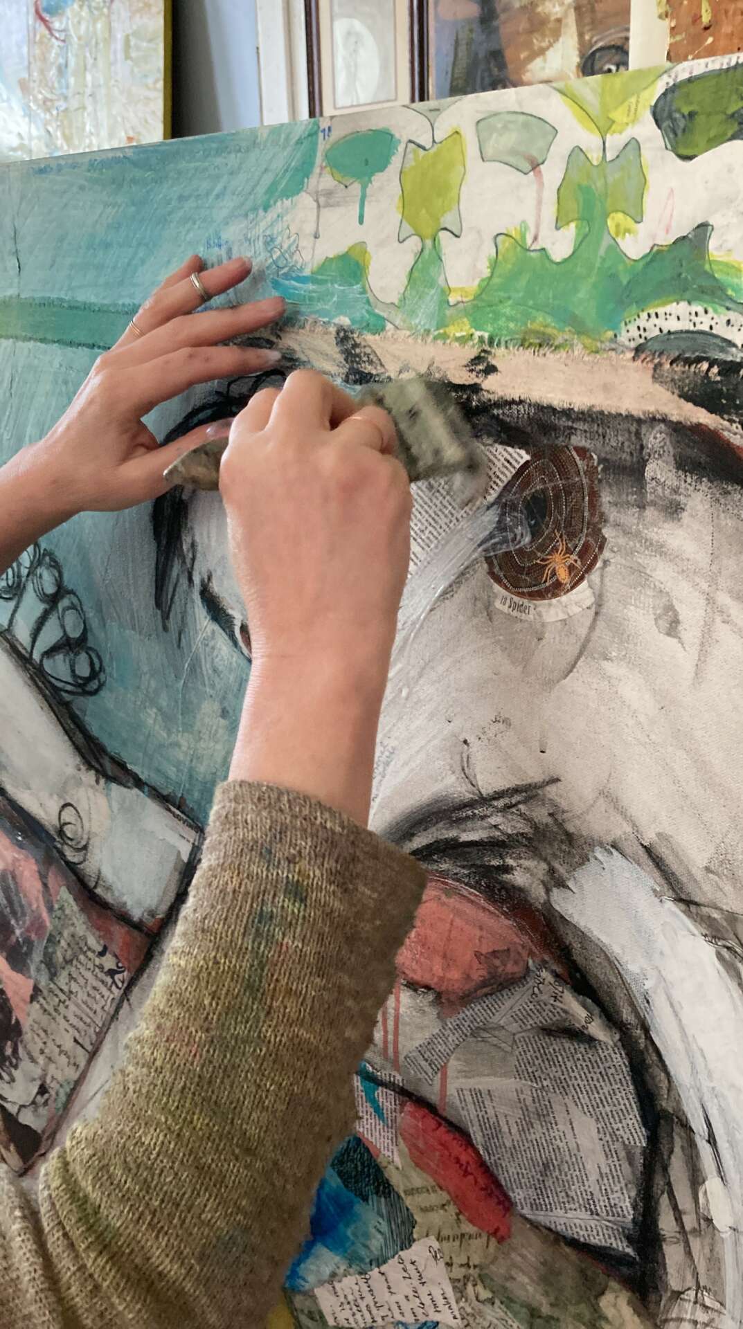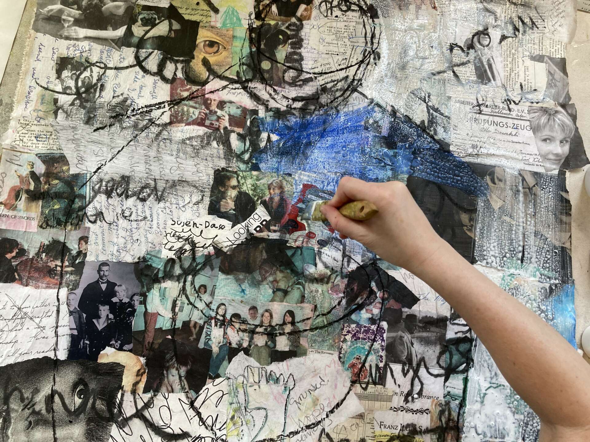 I am also commissioned to create Soul Portraits for others. A Soul Portrait commission is a custom artwork created by me that honors lived experience and captures the essence of one’s inner self. It goes beyond a traditional portrait by using personal and unique materials (letters, photos, journals, book pages, important documents, etc.) in the foundation of the piece. I then build on this with painting, writing, and drawing to create a full and layered visual memoir.