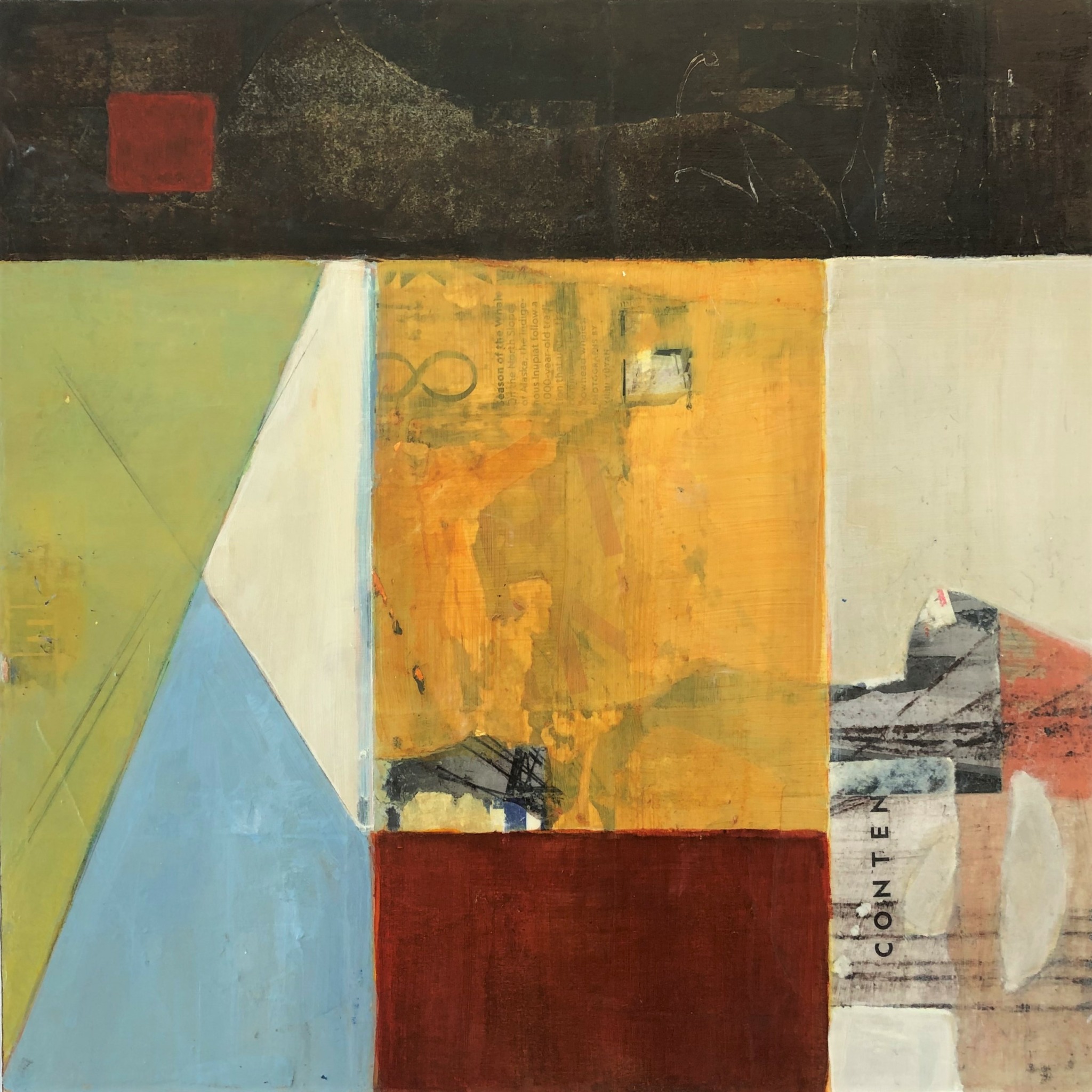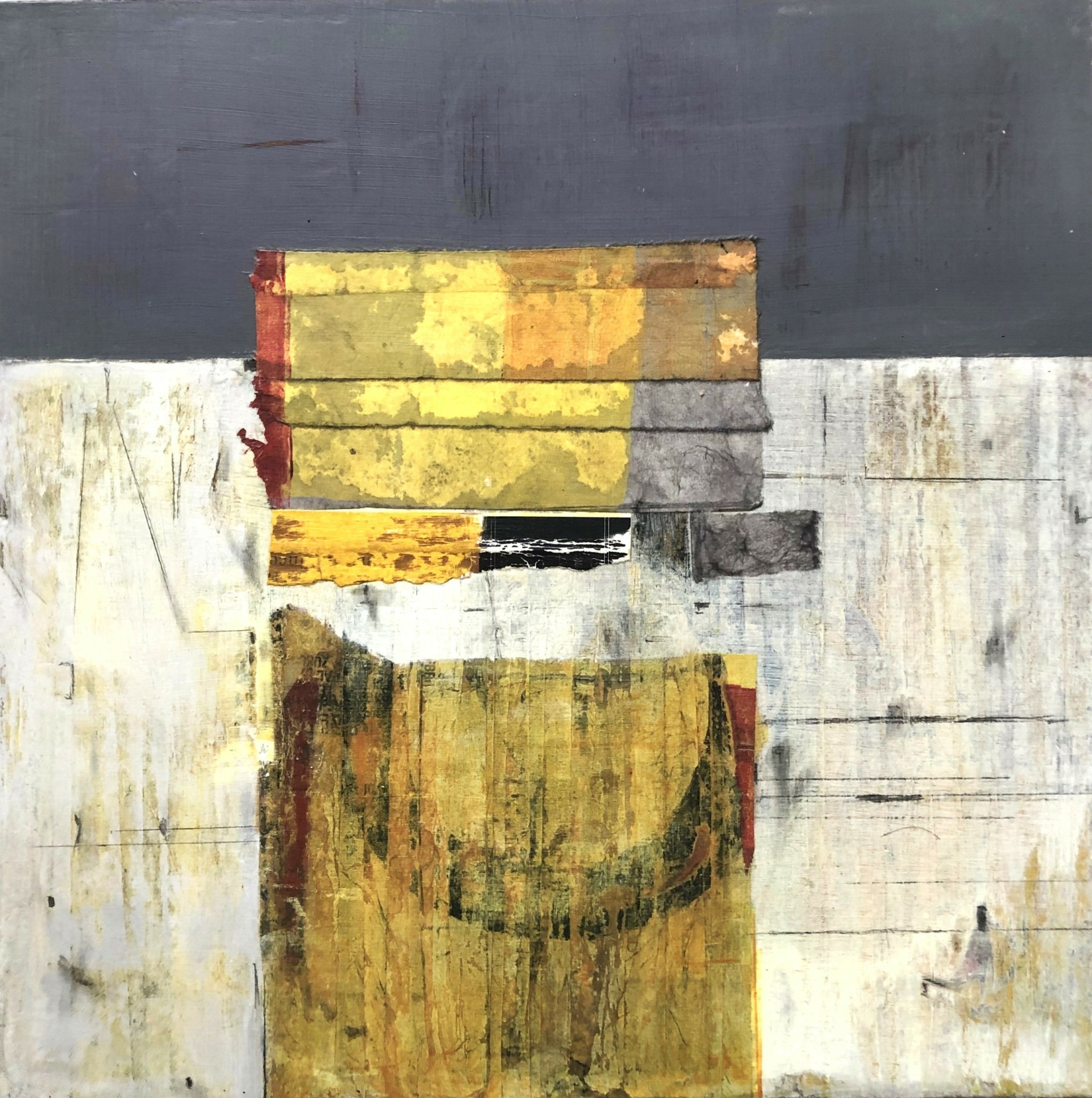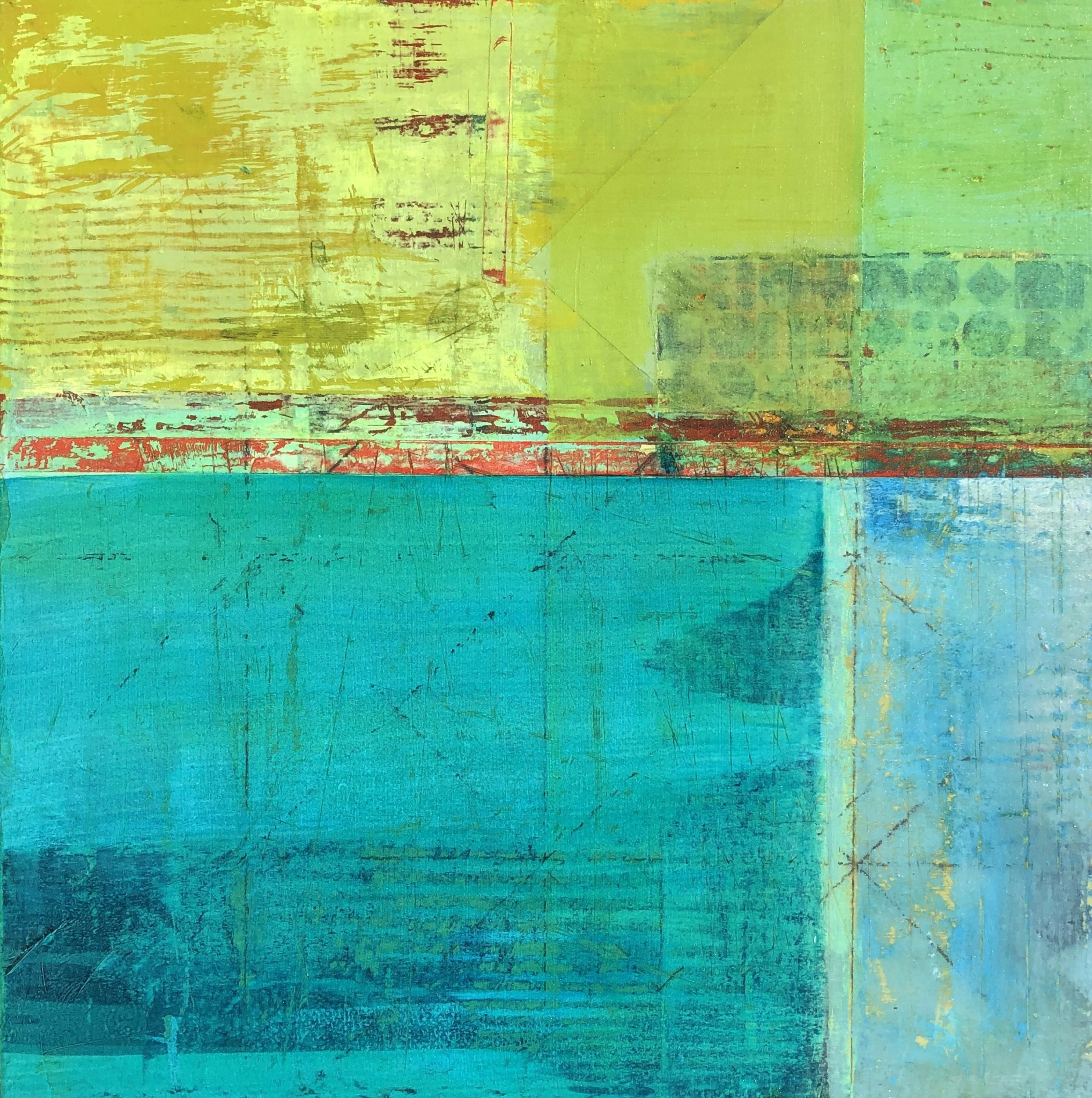 I work abstractly and beyond selecting a particular color palette I don’t preplan my imagery., As a horticulturist, retired landscape designer and geology-loving trekker, I am truly enamored with exposed earth strata and geometric adjacencies of multi-hued vistas and growing fields. As a city dweller, I find the flat and papered walls of urban streetscapes equally compelling. In all ways, it is these weathered terrains and my curiosity about what lays beneath and within them that informs my art. To that end, I use multiple passes of paint over collage elements I find or print myself. Selective sanding and glazing add depth and, often, a patina of age. In this manner I express my deep interest in what time passing both builds and degrades.
