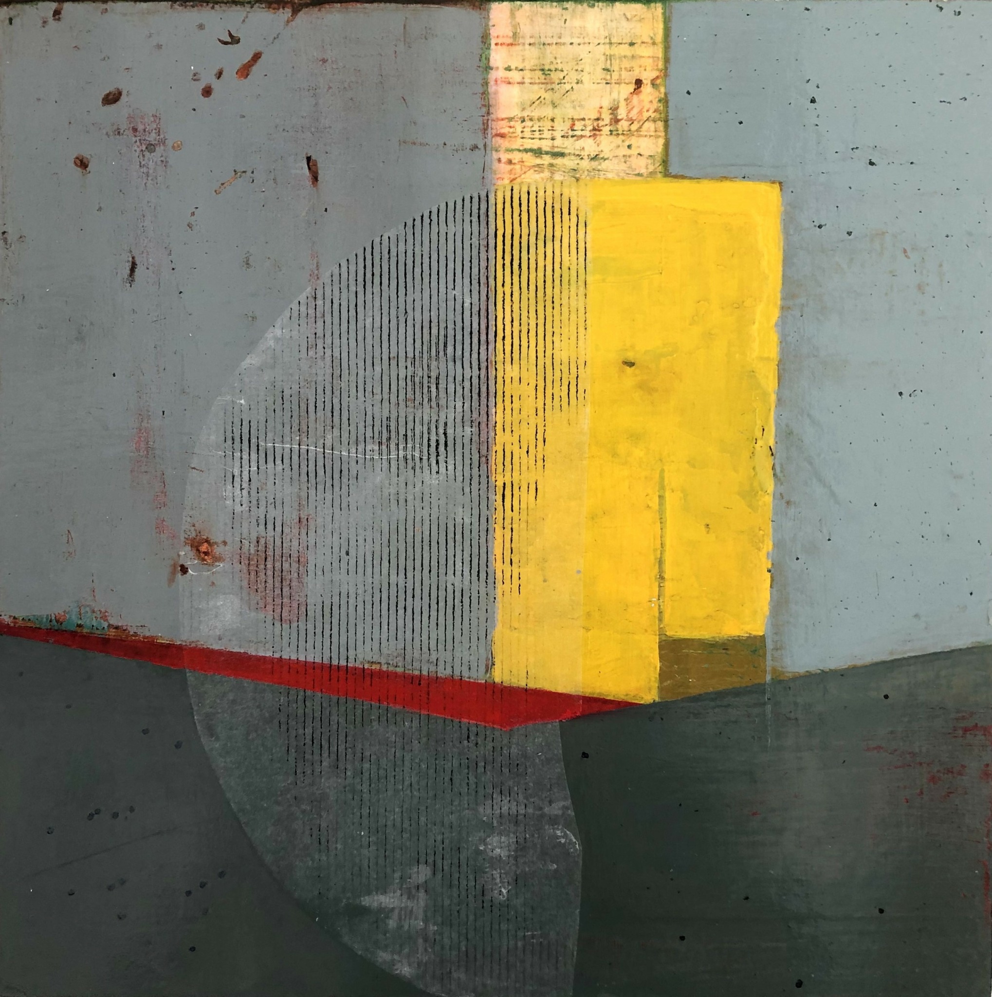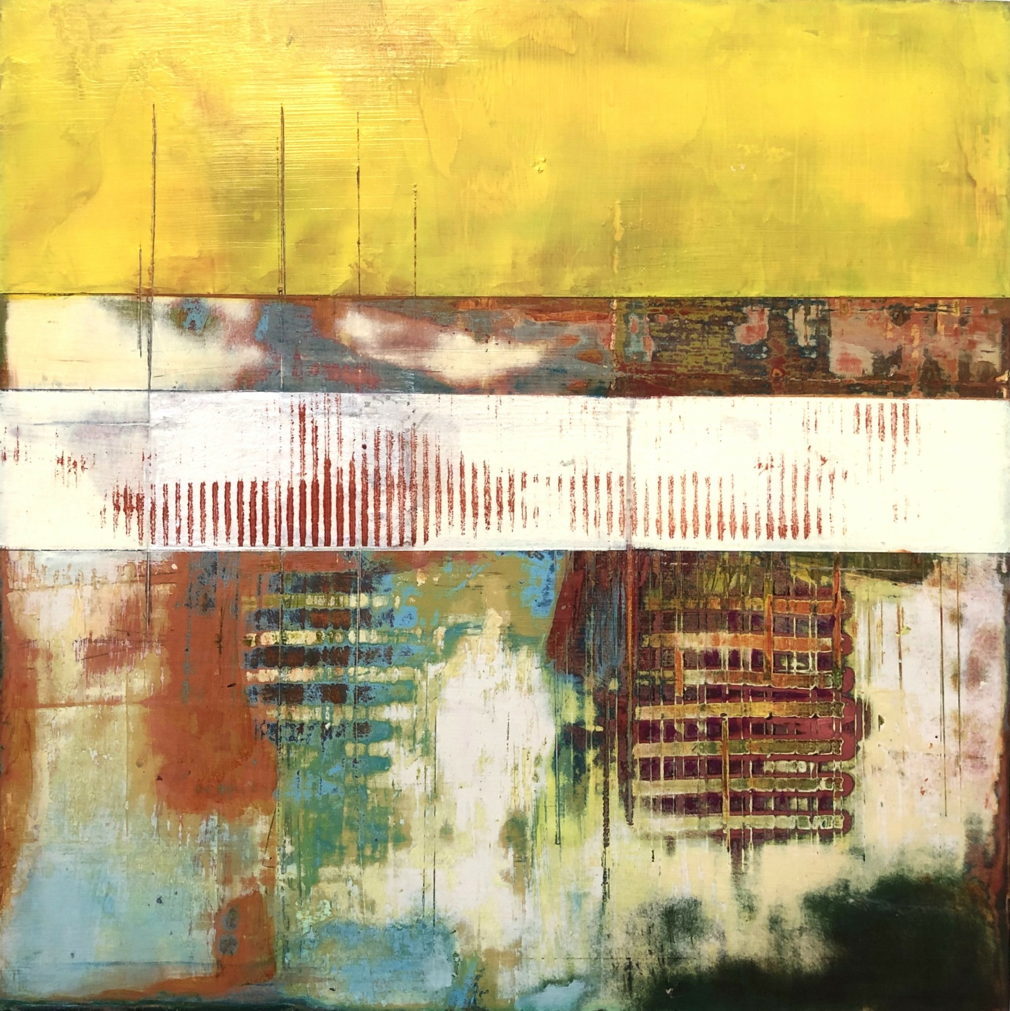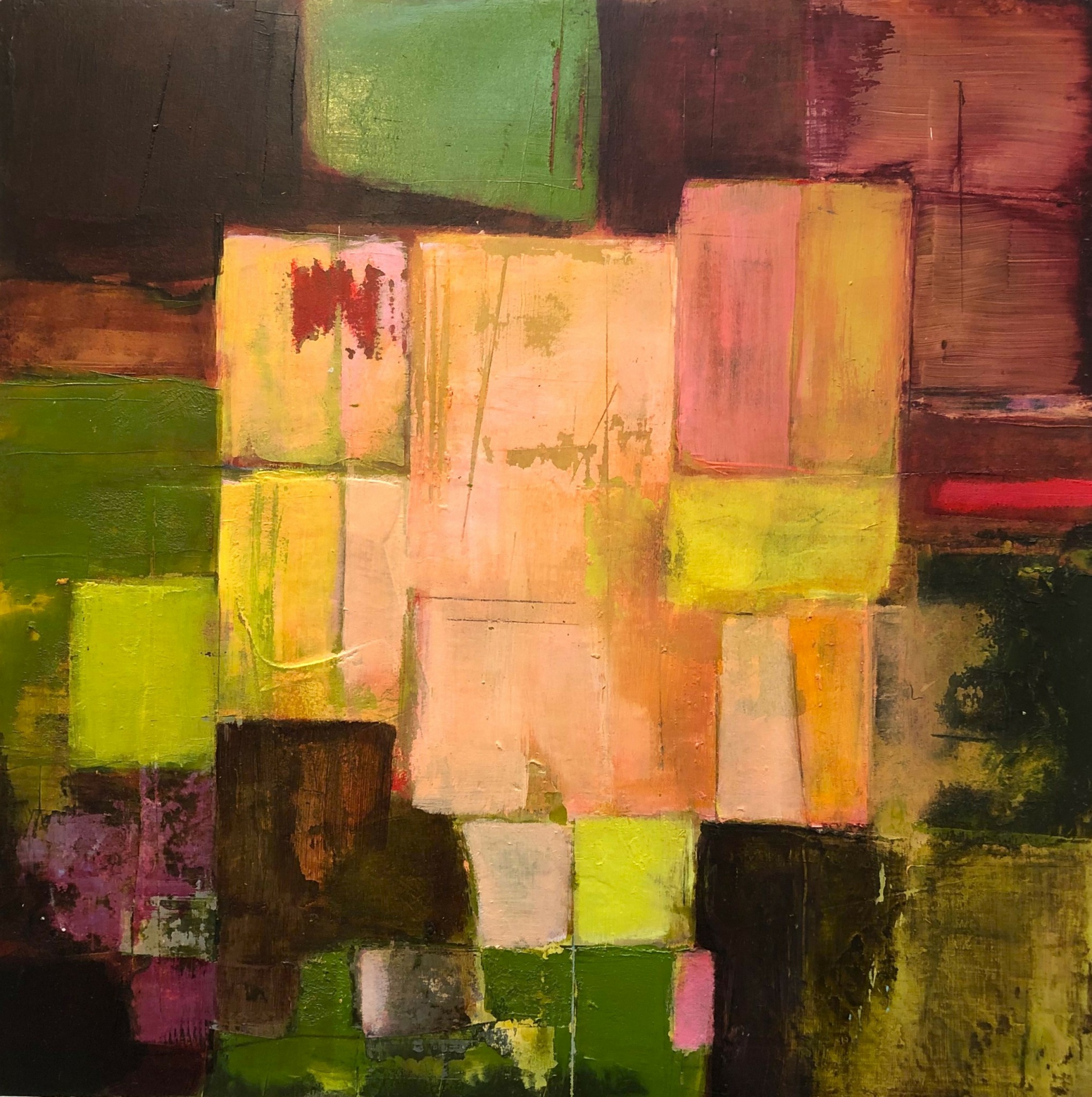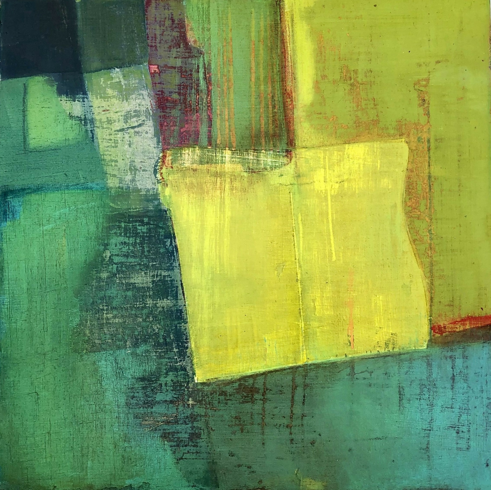 I work abstractly and beyond selecting a particular color palette I don’t preplan my imagery., As a horticulturist, retired landscape designer and geology-loving trekker, I am truly enamored with exposed earth strata and geometric adjacencies of multi-hued vistas and growing fields. As a city dweller, I find the flat and papered walls of urban streetscapes equally compelling. In all ways, it is these weathered terrains and my curiosity about what lays beneath and within them that informs my art. To that end, I use multiple passes of paint over collage elements I find or print myself. Selective sanding and glazing add depth and, often, a patina of age. In this manner I express my deep interest in what time passing both builds and degrades.