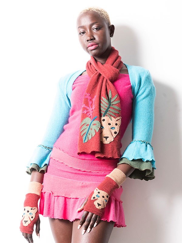 Jackets fell out of popularity after a bit of time and in the hunt for something new and interesting to work with one weekend in 2004, I found a large pile of cashmere at a swapmeet. “Why would anyone throw away cashmere?” I thought. The main answer was hungry moths who love chomping up luxurious cashmere sweaters, leaving holes. I decided to buy a few, covered the holes with appliques and sold them to better boutiques in the USA and abroad.