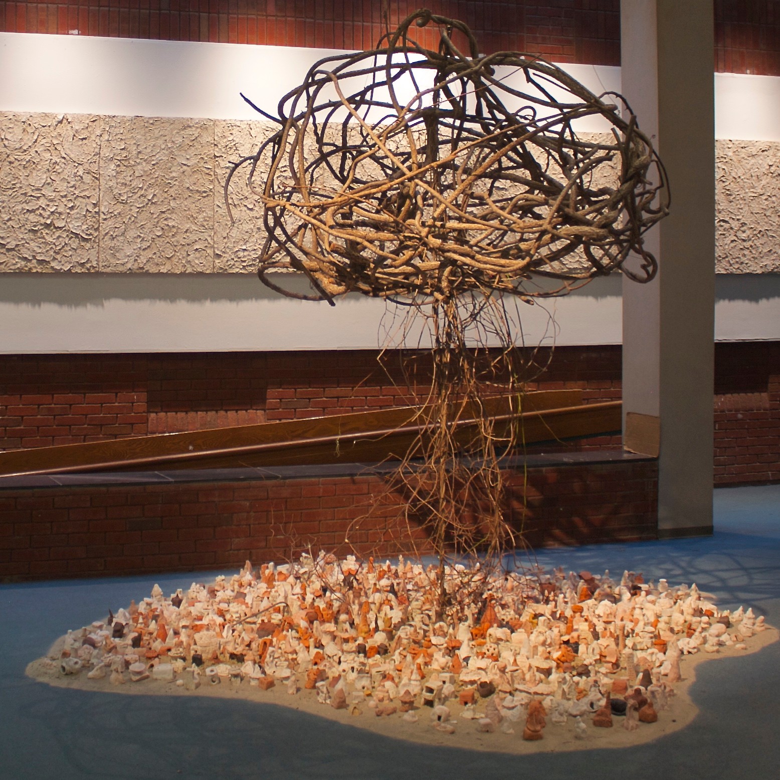 Having started my creative journey at a very young age I feel that I did not choose it …..it chose me. We are all given specific strengths in life. In order to be internally happy we all need to honor this calling. I began an after school art program in my hometown. I ran “Art Escape” for six years. Durning this time I had three other teachers working with me so I could pursue my own creative pursuits. I was able to have three children’s books published and a few art shows in the immediate area. My desire to have children create was important for me. The books that I created all had to do with the creative act. During this time an installation I created “The Village Project” began. This project was an interactive installation comprised of many small clay homes made by different groups of people. I went to hospitals, schools, shelters, fairs etc. and had people make a small clay home. After collecting over 3,000 I began collaborating with another artist who added vines to the project. This addition added a connectivity to the project. This installation has traveled to Universities, museums and galleries. The “Village Project” gave people a chance to participate in an art project. A chance to have a small part of their identity be seen by the public.