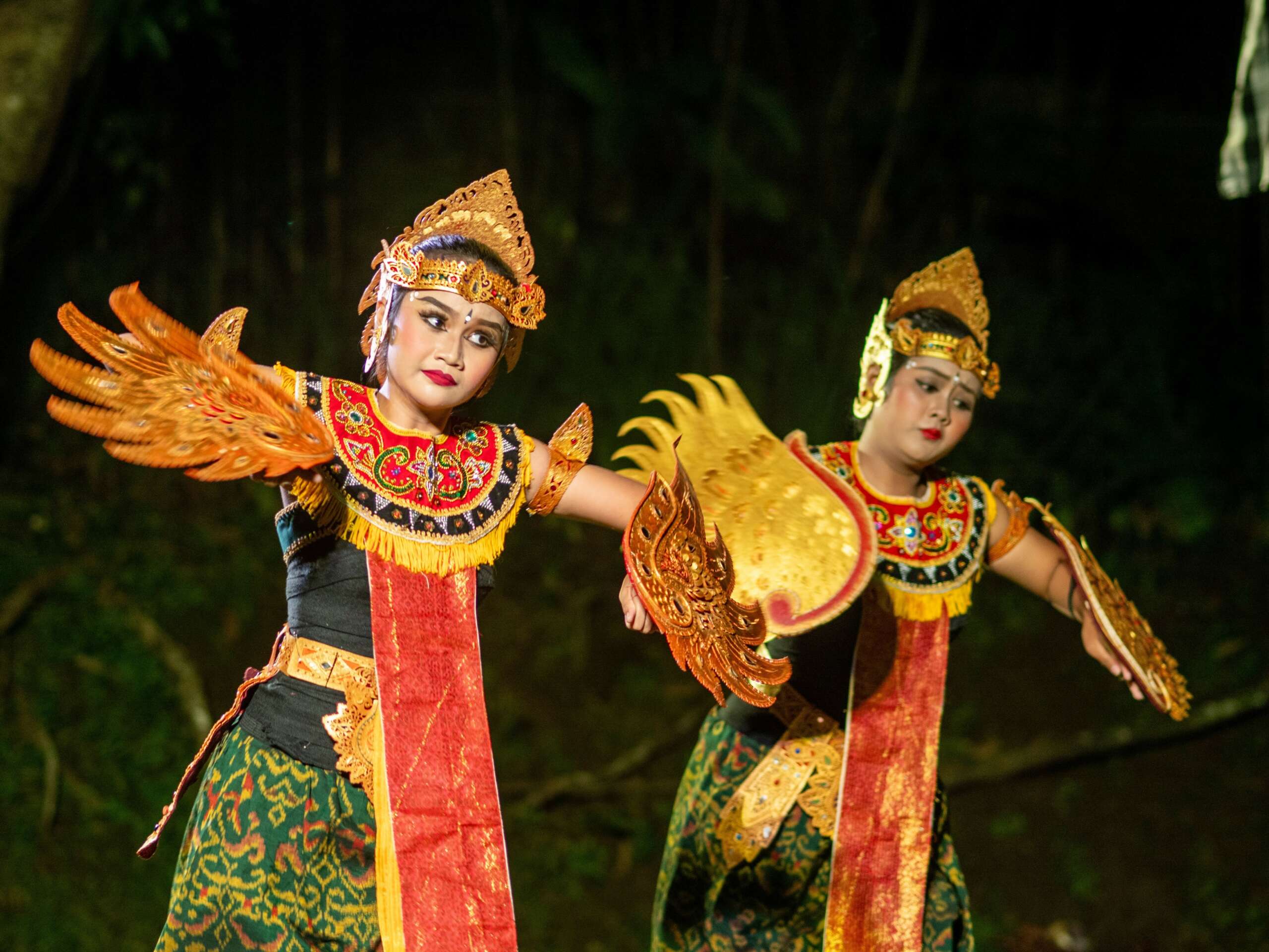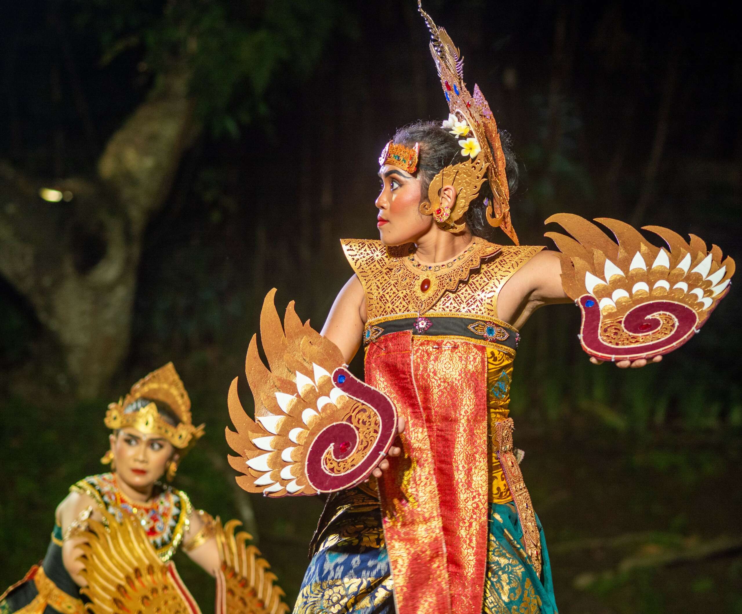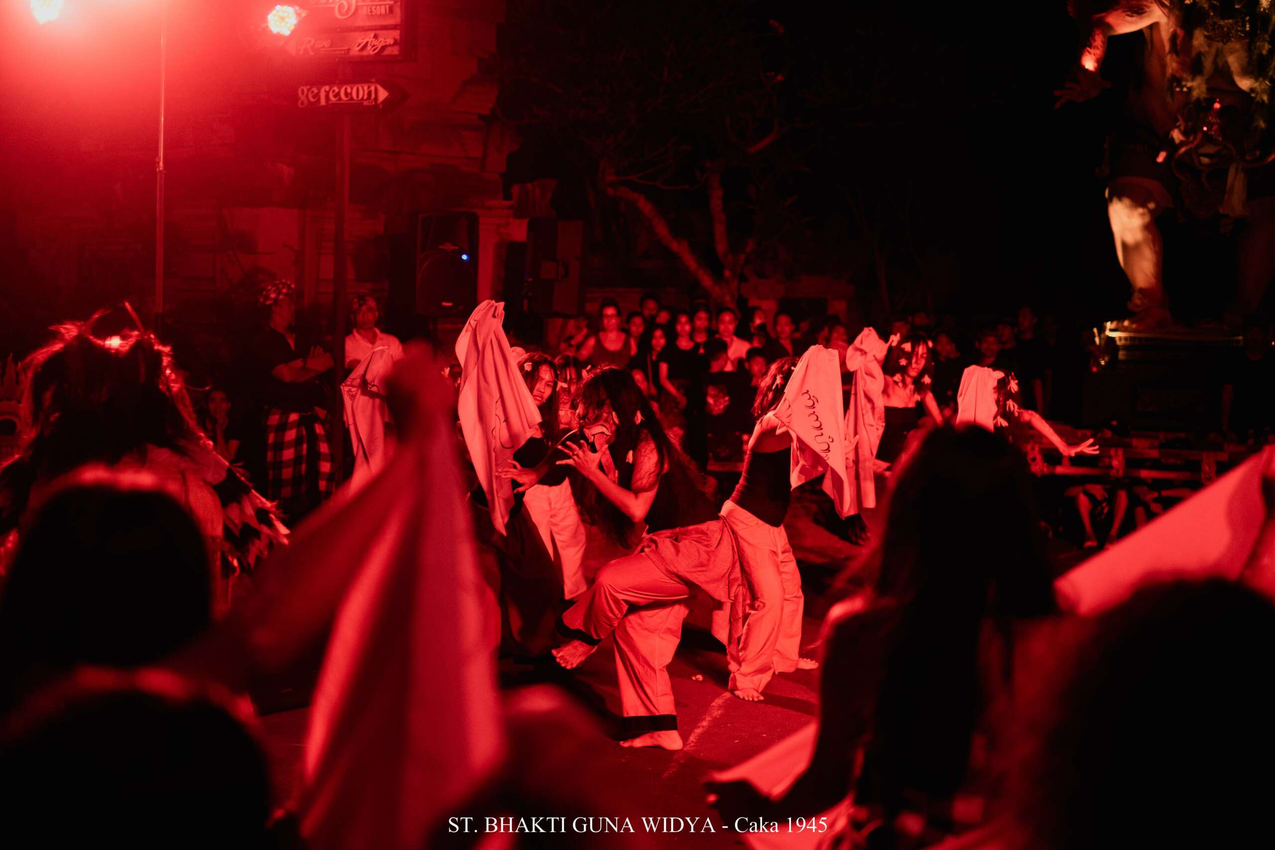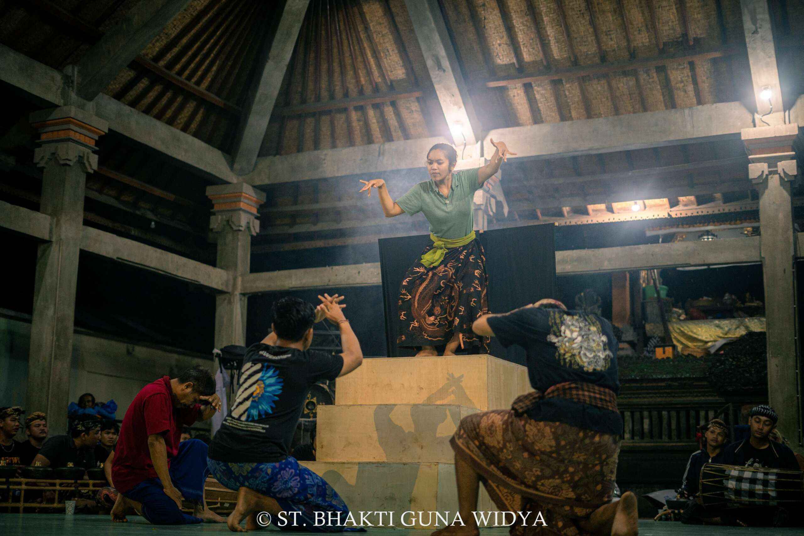 This year’s production was about the wrath of Dewi Danu, the Goddess of the Lake. Late in the process, I added a big fight scene. In this chapter, monsters enter the human realm and manipulate peoples’ minds. Fights break out everywhere, people throwing their things, shoving each other, yelling, kicking, and screaming. Utter chaos. My cousin adjusted his composition to fit the needs of the story and my dancers dramatized the scene. This chapter ended up being one of the most impactful dances I’ve choreographed.