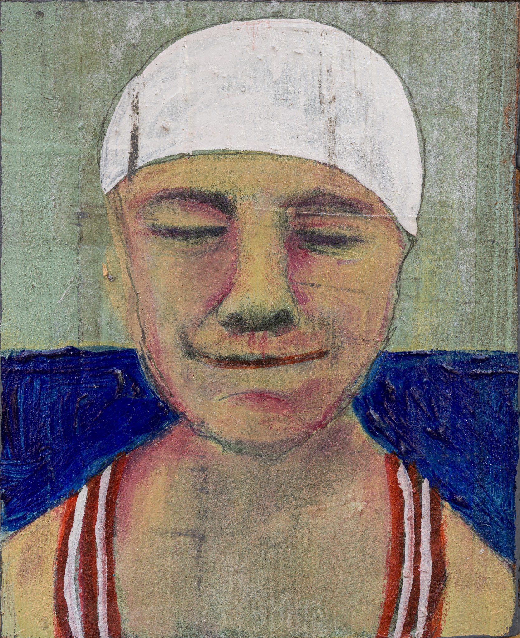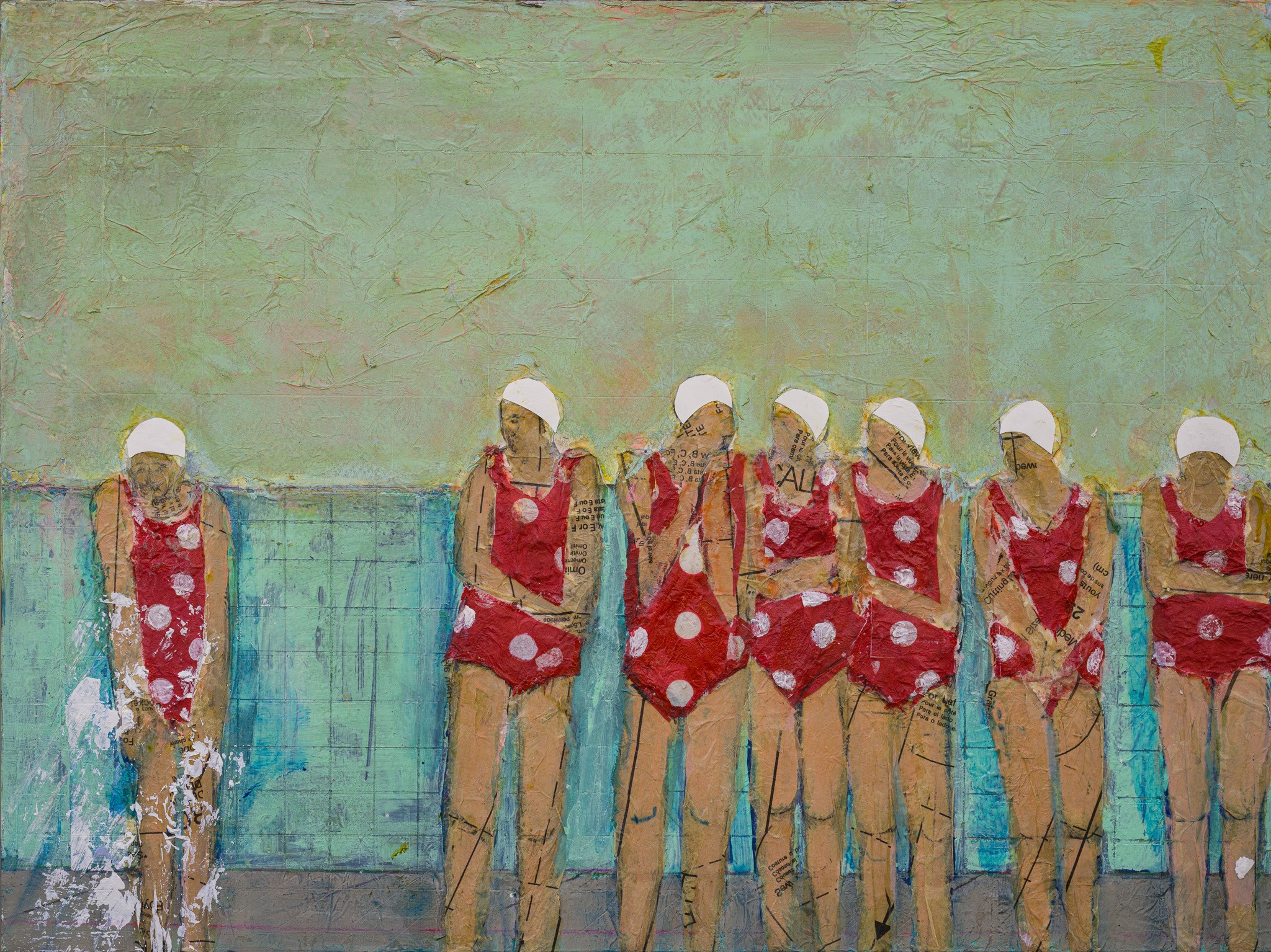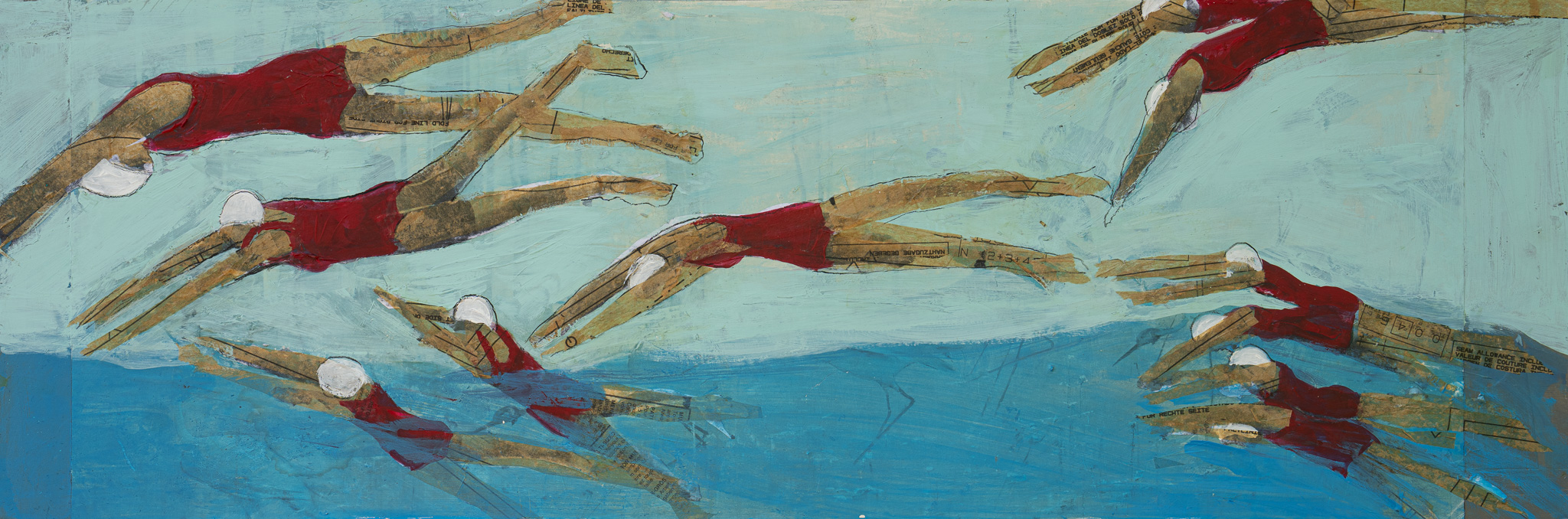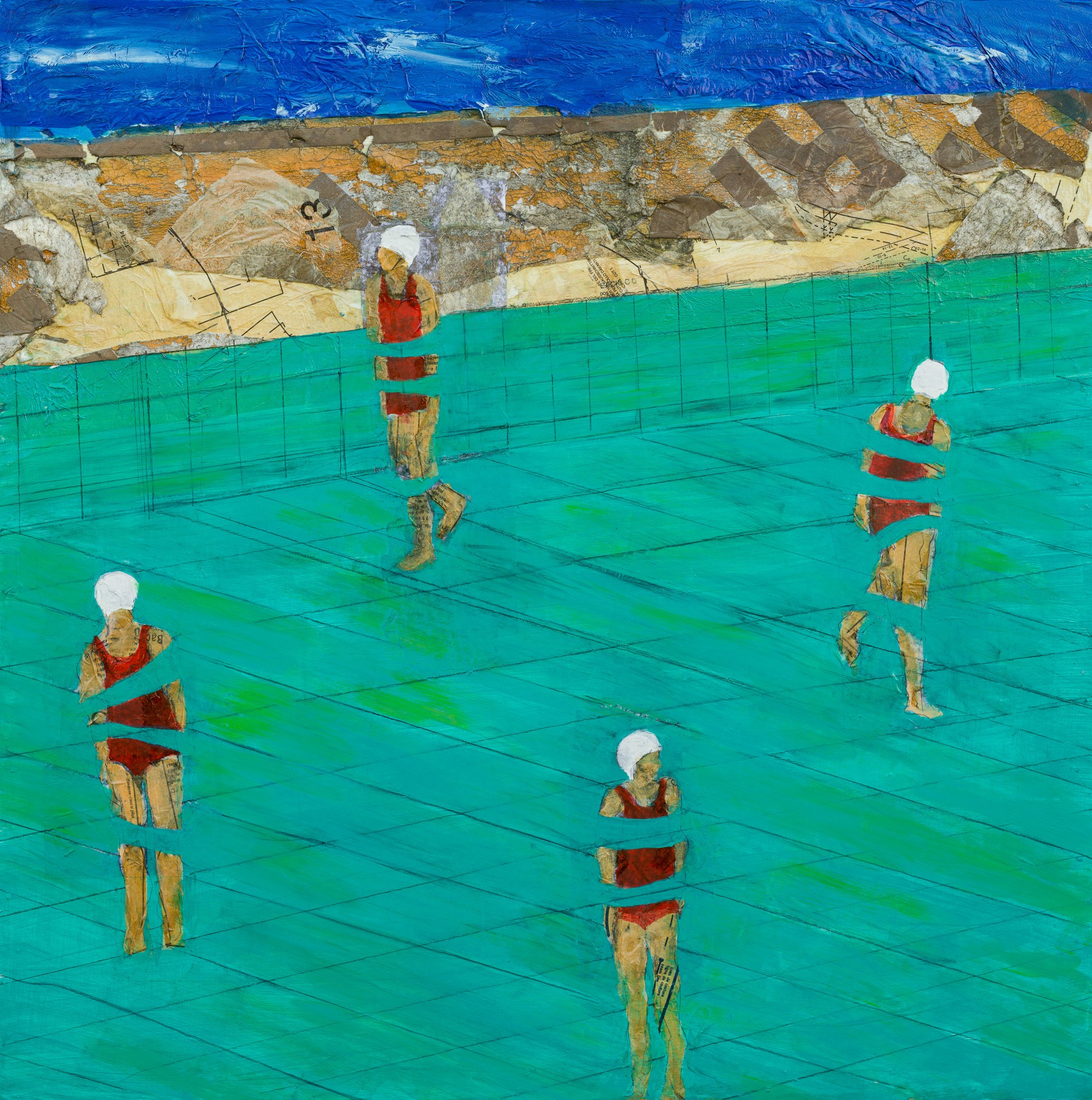 The images themselves are about moments, familiar bits and pieces that combine in different ways and make up a life. Over the past few years, I have worked on a series around swimmers, pools and water. Sometimes they are anonymous figures clustered or alone. At other times there are faces that tell a story. Interspersed are structures, distressed but resolute.