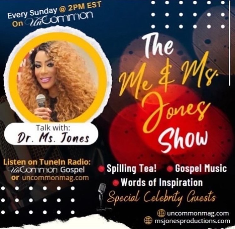 While in California I became interested in entertainment. I became a Radio Announcer with American Radio Network by seeing an ad in the newspaper; I hosted and produced my own urban inspirational radio show entitled “The Me & Ms. Jones Show.” I went on to work for them as a Trainer, instructing new radio announcers in broadcasting. I was voted “Radio Announcer of the Week” twice in 2003 and nominated for the 2004 “Radio Announcer of the Year Award” by The Southern California Gospel Announcers Guild. “The Me & Ms. Jones Show” has been on 99.3 FM, 89.7 FM, 87.7 FM, Radio Soul, and currently airs live every Sunday 8-10 am EST on 108 Soul, iHeart Radio, Tune In, and Clubhouse. It airs again from 2-4 pm on Uncommon Gospel Radio and Tune In. It also airs 6-8 pm EST on Stellar Award Winning All Nations Radio.