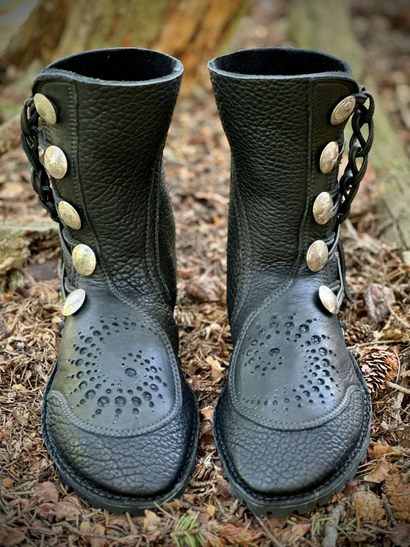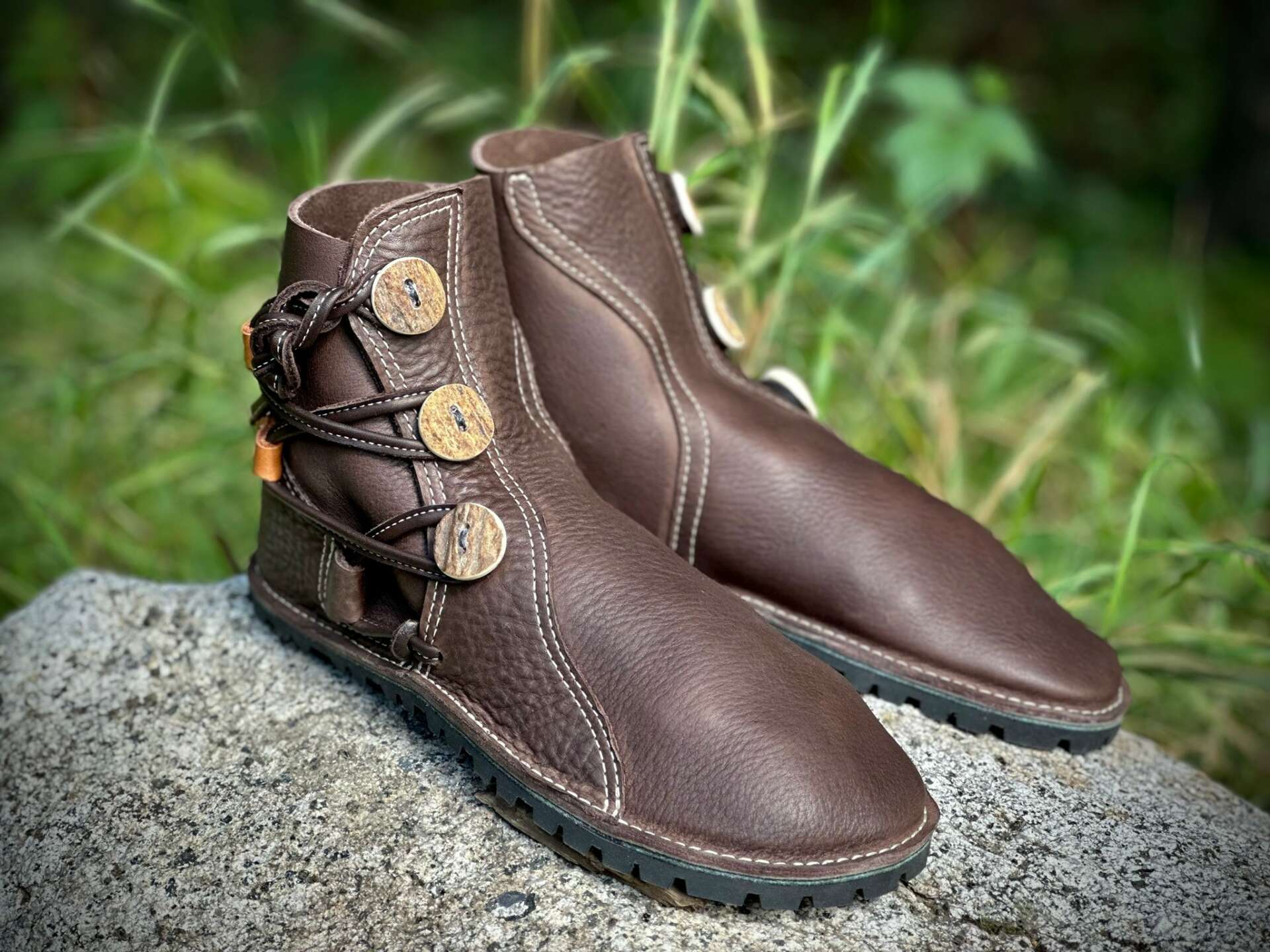 In 2008, on my way back up to Alaska for a seasonal restaurant gig I stopped off at the Arizona Renaissance Festival. It was there that I first spotted and became enamored with the style of footwear I now build. A couple years later I found just the right teacher, Bill Shanor of Bonney & Will’s School of Shoemaking in Ashland, OR (he and his wife, Julie are now mostly retired). I’d never used a sewing machine before, but after a week-long course in “unlasted” footwear I took the full leap, scraping up enough money to acquire an industrial sewing machine, an array of handtools and all the materials I would need to make a go of it. Prior to taking the class I had also moved to Ashland, to be close to Bill and his expert instruction. It took a solid year of practice, experimentation, and building shoes for friends and family for me to muster confidence enough to start taking orders. Once I did, things began moving quickly. By year two, Alkahest Leather was in full swing, travelling to art fairs and various festivals. Looking back, I can see how critical my immediate dedication to the craft was. Forwards and back, and with an almost obsessive precision, I learned the recipe Bill gave me. Over the course of these past 13 years, I’ve tweaked some things and built upon others, adding to the folk tradition of this particular style of footwear.