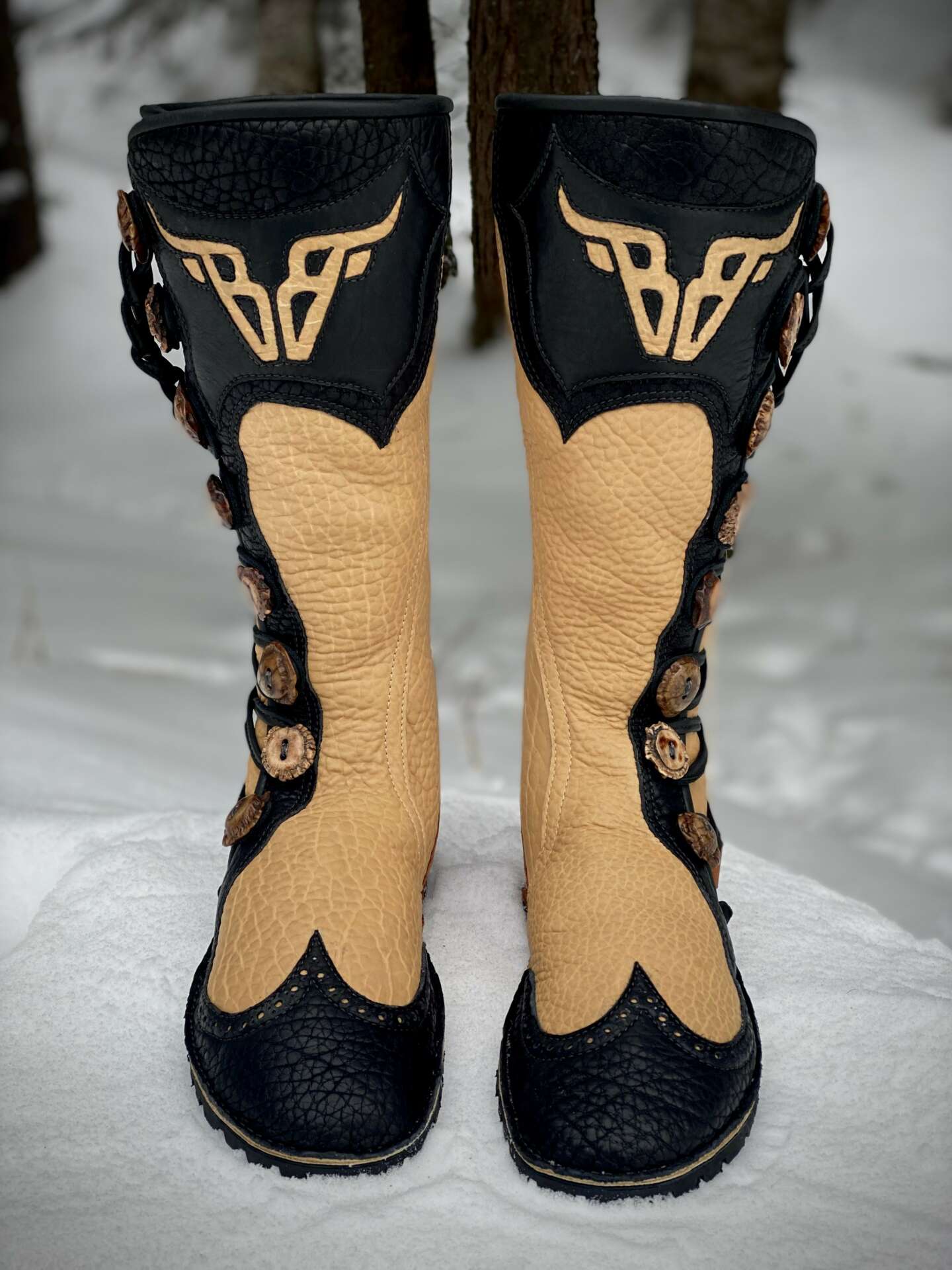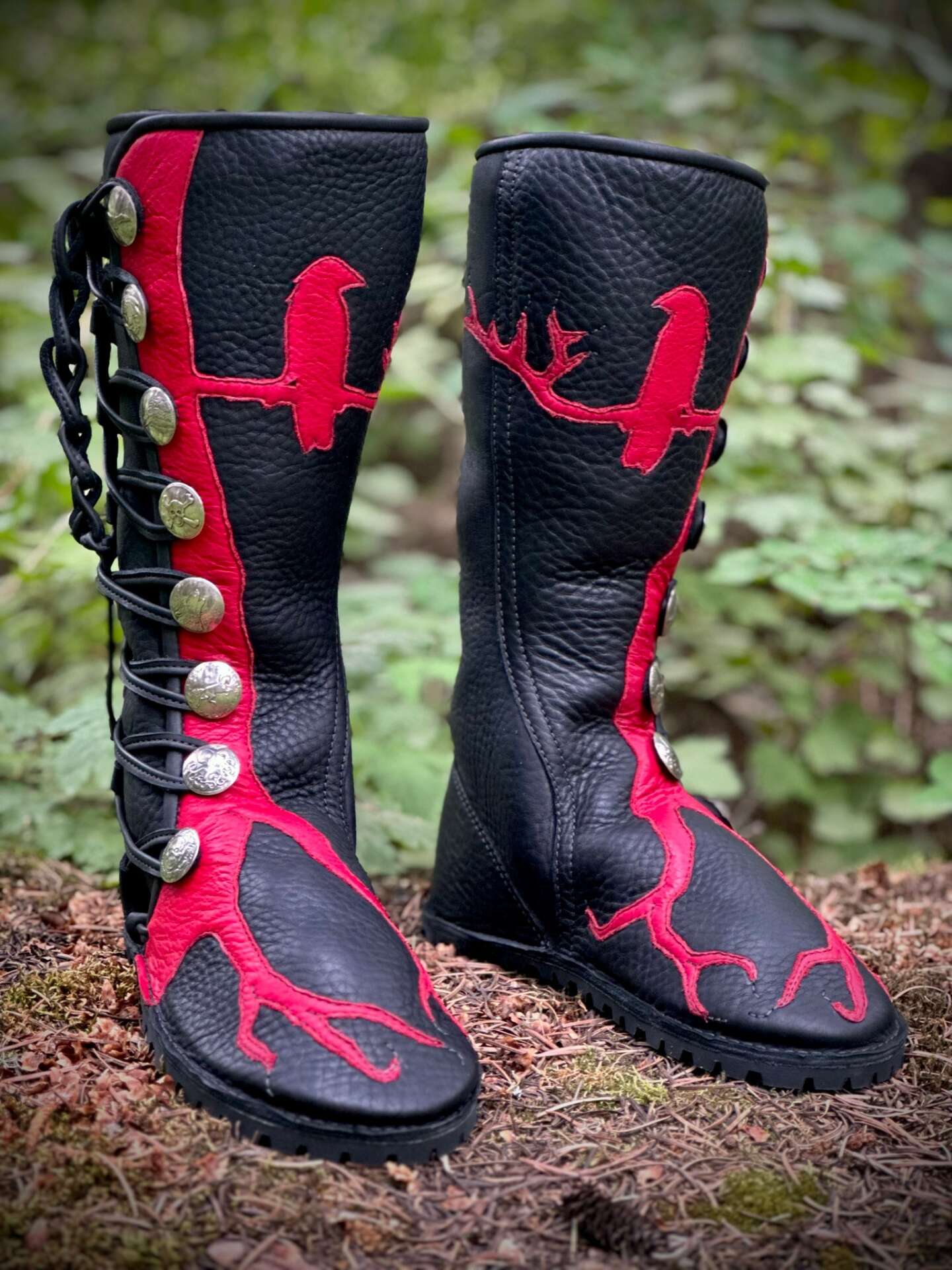 My name is Dustin Lyons. I am a shoemaker/leatherworker living in Joseph, Oregon. I have a small cabin and workshop on two uncombed acres at the foot of Chief Joseph Mountain. Established in 2011, Alkahest Leather is a homespun one-man show specializing in custom-made leather footwear, hip & shoulder bags, and other accessories. Primarily a Pacific NW business, I travel to art fairs and various festivals throughout the region. Using full hides of bull, cow, and bison I build my products with a sewing machine and an array of hand-tools, incorporating antler, semi-precious stones, and various types of hardware. The footwear I build is entirely customized starting with a tape-casting of the customer’s foot. You choose your colors, buttons, soles, etc. As opposed to conventional, “lasted” footwear, which constrains the foot in a generic cavity, Alkahest footwear fits more like a second skin, like a moccasin–molding to the feet and allowing them to move and behave as they are meant to. You can do just about anything in these shoes. I can make you a pair appropriate for a dentist appointment, a hike up a mountain, or an “end-of-the-world” party! They can be re-soled, and with proper care they’ll keep your feet happy and head-turning for years to come. I have an ever-expanding stock of designs that tend toward images of the natural world. As well, I am always open to a custom design on a bag or a pair of boots. The over-arching spirit of my business is one that values quality, personal connection and collaborative creation. I make every effort to get it right–functional, durable, fashionable. It is my contention that life is lived most freely and brightly when one’s needs are simple and modest: coherent spaces, good friends, well-built, accommodating shoes.