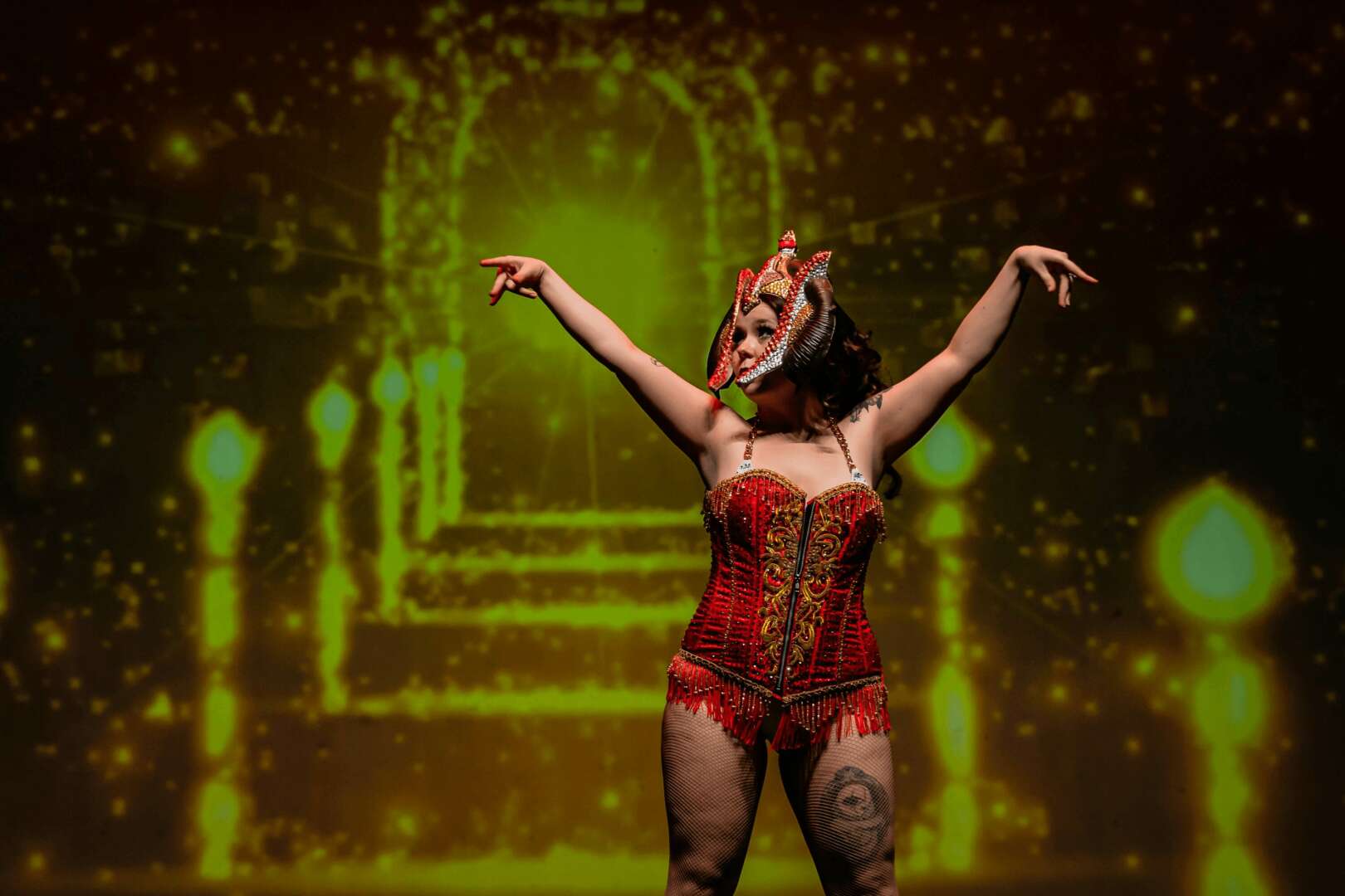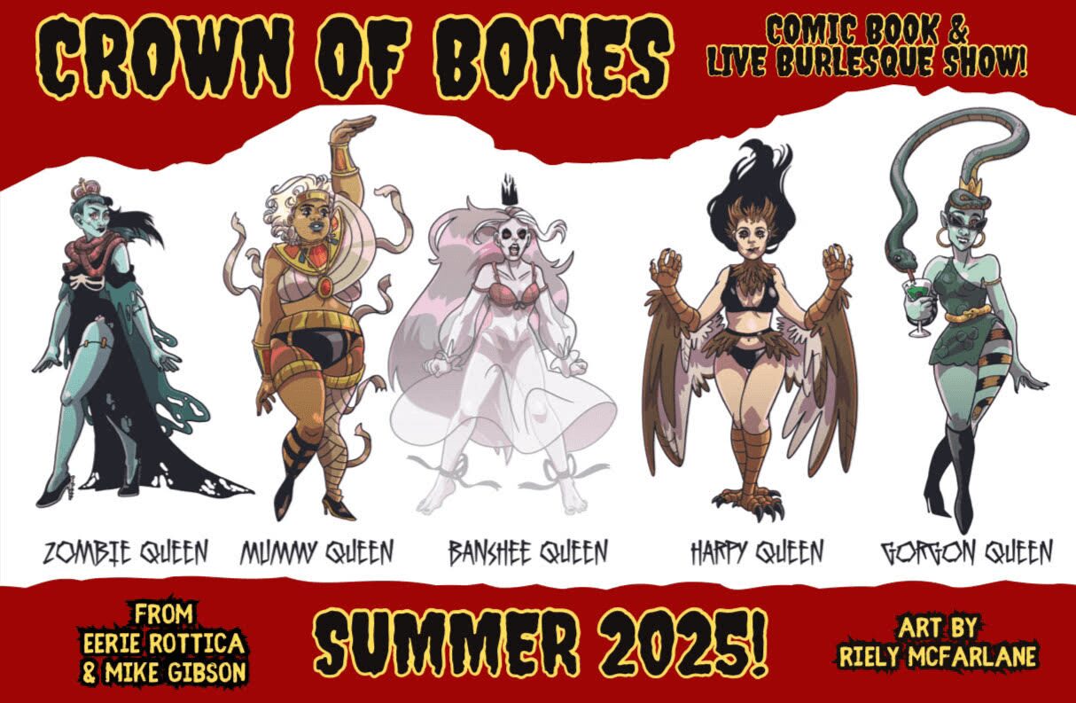 Eerie’s Exhibit started out as a virtual and live hybrid show. We would have some acts be videos that were projected on the screen while others were live and in person. This allowed me to hire dancers from anywhere- a burlesque work from home position. Also the hosts, Alton and Eddie, were able to make skits and puppet shows utilizing green screen to play between the acts. The show has a unique quirk and charm that really resonates with some people. The next big project with Eerie’s Exhibit is the comic book, “Crown of Bones” written by Mike Gibson and illustrated by Riely Mcfarlane. The comic’s characters are all drawn to resemble burlesque dancers and on the grand release of the book, each dancer will take the stage as their character. I am so in love with this comic, I think we really have something special here.