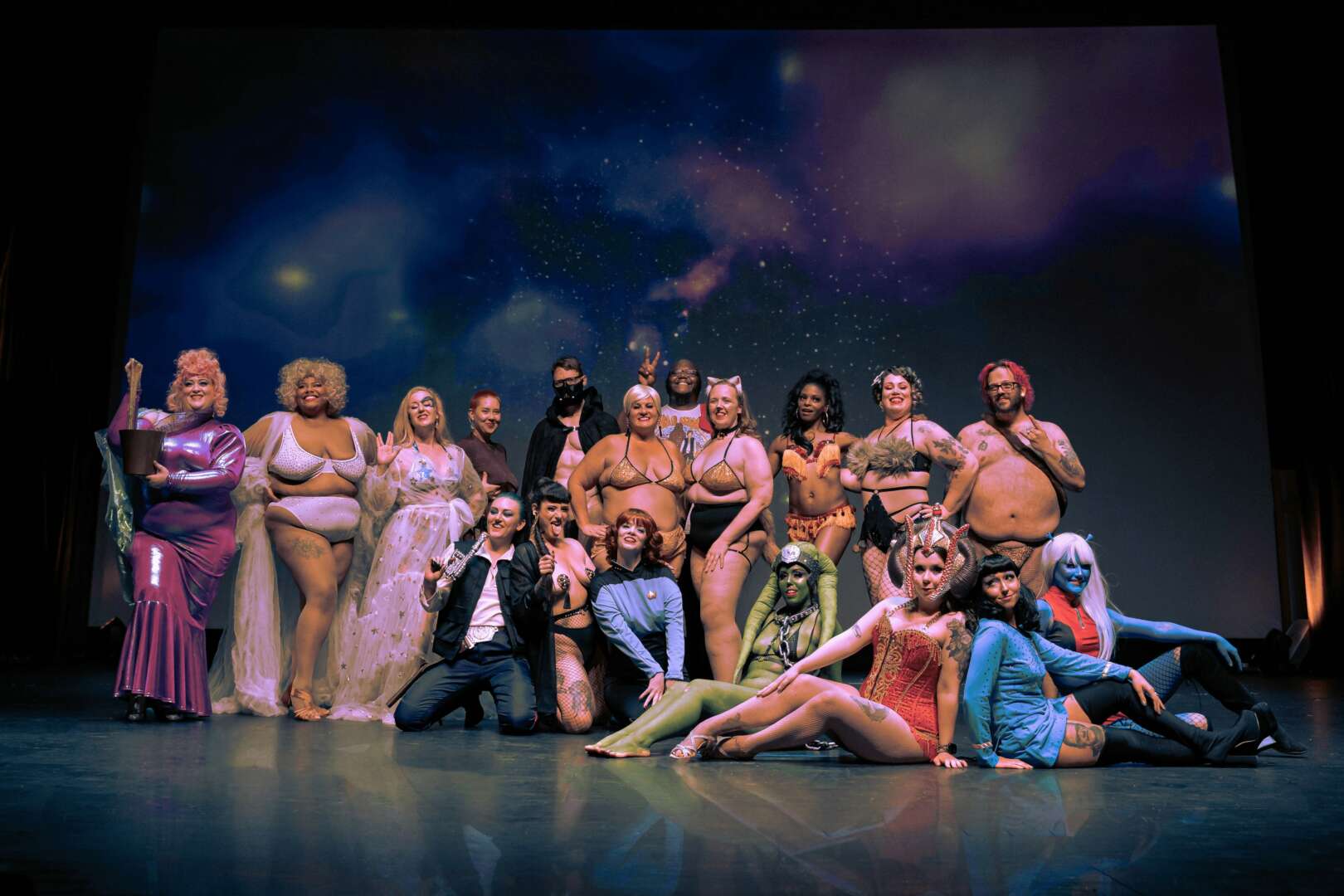 For me the most rewarding part is the auidence. After seeing a show, I want every person in my auidence to feel like they could identify with at least one person on stage. To sort of see themselves up there. This, among so many other reasons, is why it’s important to have a diverse cast. There are so many rewarding parts of my art- gluing on the final rhinestone of a costume, counting up the tips to proudly present to my performers, having meetings with Mike and Riely about the comic book…..but the most rewarding is the cheers and hollers from the crowd. I have had people after the show tell me that their whole idea of beauty standards and parts to be self conscious about where turned upside down after seeing a burlesque show.