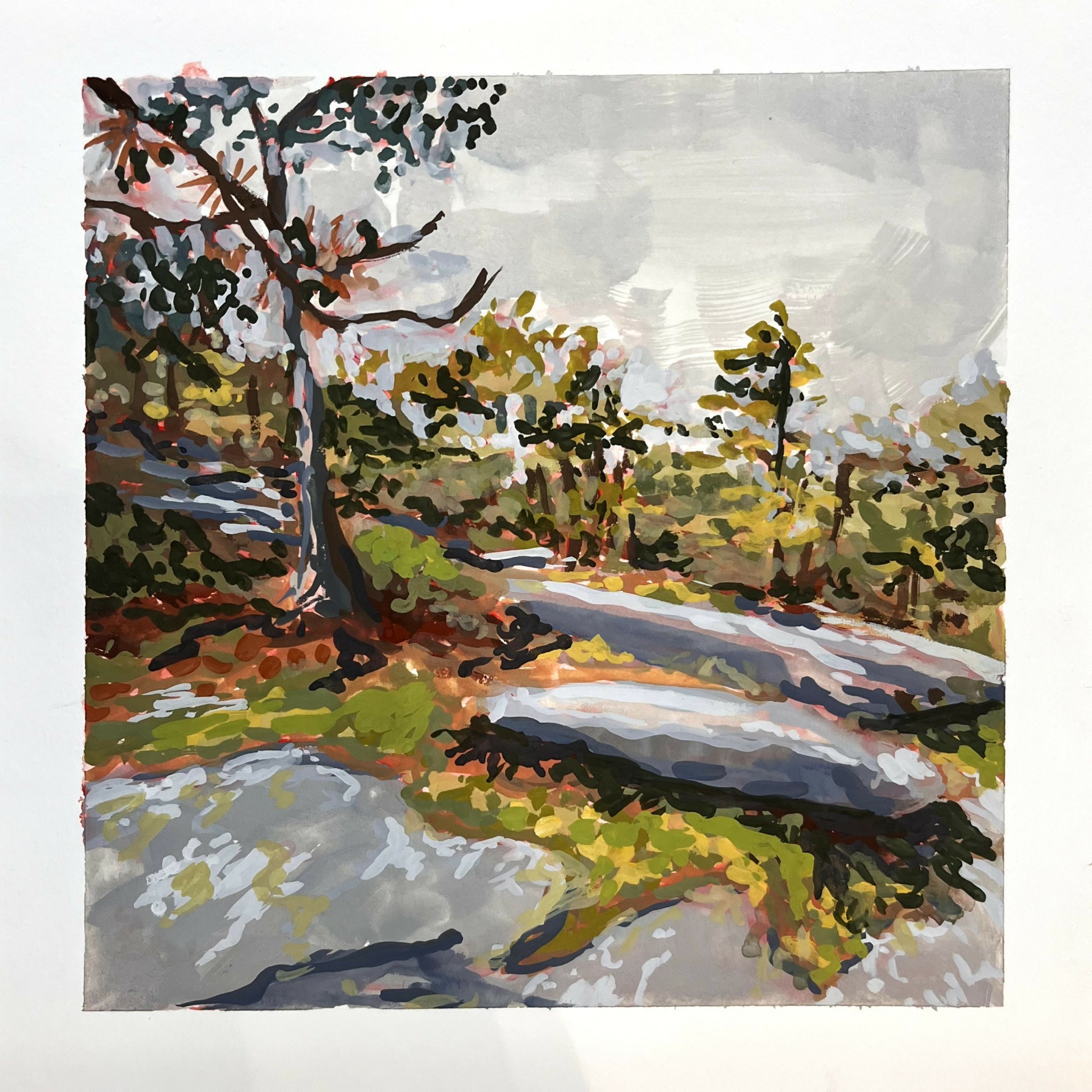 My main focus when I paint is to capture specific moments in time through the use of color and expressionist brush marking. During the spring, summer and fall, I paint mainly “en plein air”, French for “in open air” and made popular by the Impressionists. I scout various locations both on the shoreline and in the forests to depict using gouache or acrylic paint on paper or panel. The art of “plein air” painting is exhilarating, as you are working through the elements, painting fast enough so the sun doesn’t change too much or the tide doesn’t come rolling in! It’s truly an adventure made for me by each piece. In the winter, I work more long-term by painting in oil, following photo references I have taken or simply finding inspiration from color palettes I discovered in nature.