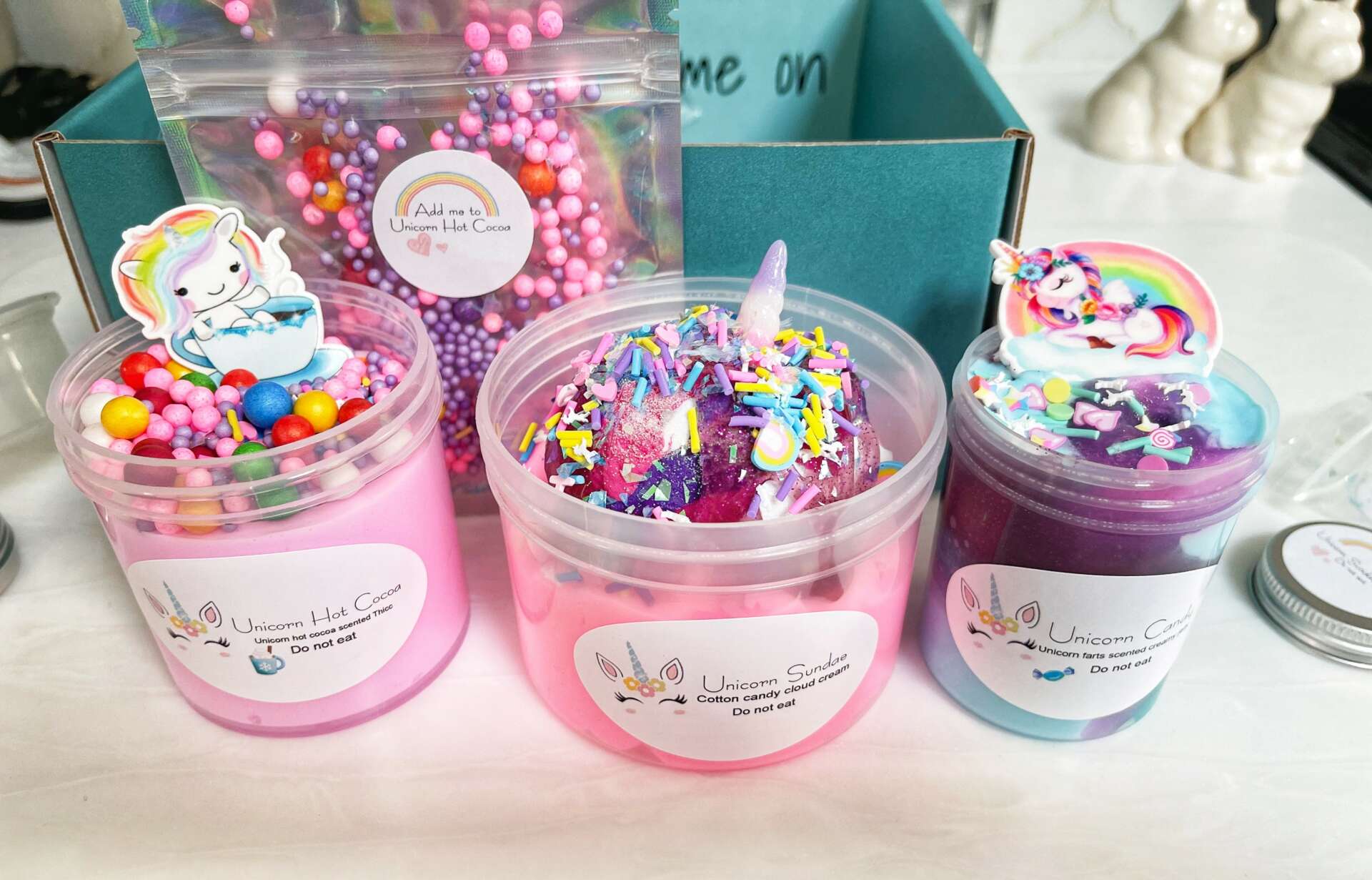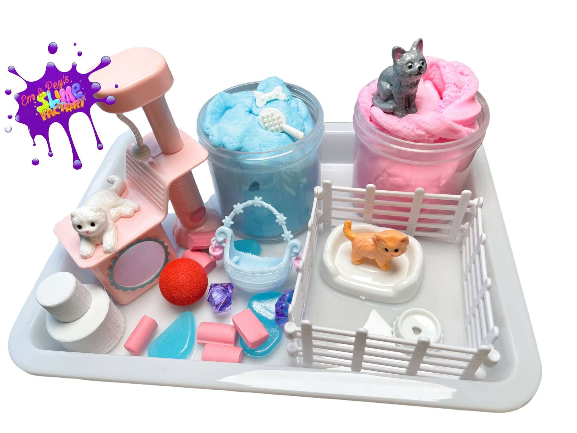 The girls started this business almost 5 years ago as their grandma was passing. She lived here with us for 3 years and was total care, in which the girls were a huge part of. During a therapy session Em expressed how she wanted to make slime but mom said no. The therapist reached out and I agreed as it was a good stress reliever. They made so much they would sell online to my friends in a dress business I ran. After gram passed Em dove in deep and experimented with recipes. She worked for hours on these recipes. If she failed she would say she is done. I would tell her to give it time and think and come back later. I would wake up at night and she would be at the table tinkering Eventually we created their own facebook group and they would sell in there. They asked if they could get another French bulldog puppy and I jokingly said “if you pay for it” well they did. In just a few weeks the raised all the money themselves by doing live Facebook shows and creating each slime by hand one by one. After that Em came up with the idea to do large plain batches so she could just add color and scent and any custom designs they wanted. That made a huge difference in how fast she could make items during a live. That still wasn’t good enough for her so she then came up with doing batches already scented and colored and she picked the charms and any decorations. That was a huge hit and from there everything just grew. The batches kept getting bigger and the amount of textures kept climbing. They now have over 30 with Pey creating a few of her own.