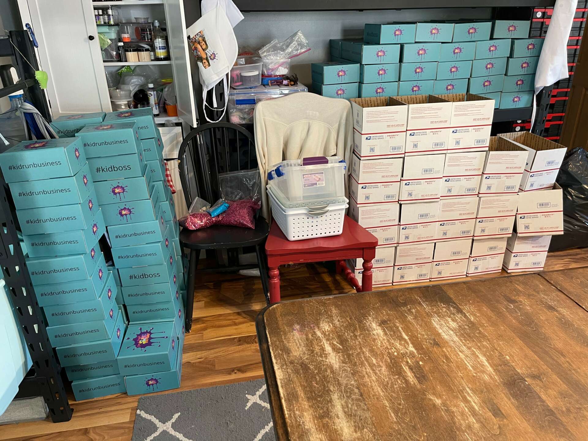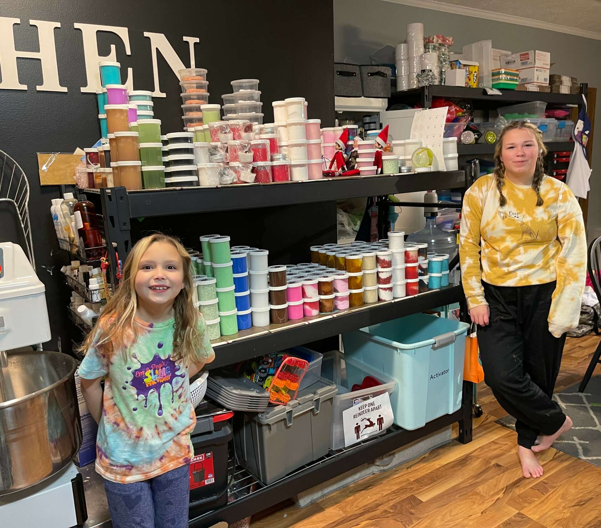 When we finally realized this wasn’t going away anytime soon as their group grew to over 3000 in the blink of an eye and they were participating in online craft vendor events and collabs we had to make some adjustments. We had to create a more efficient work area for them. We bought small storage shelves and tables and bins. This tan much smoother but as they grew we needed more. The one end of the house is now the slime shop with additional outbuildings for storage. They added two industrial mixers to save our arms from all the stretching each batch takes.