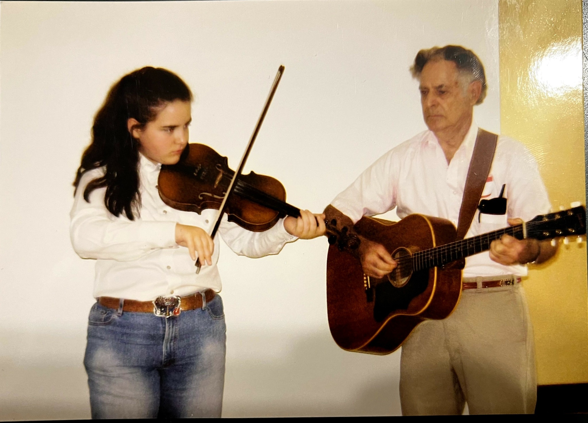 I started taking fiddle lessons when I was 7 years old after my grandfather, Dalton Butler, suggested my parents find me lessons. My Papaw Butler loved playing rhythm guitar and backing up fiddle tunes. I took “fiddle” lessons for a couple of years then my parents switched me to “classical violin” lessons. People always ask me what the difference between a violin & a fiddle is, and I always tell them “A violin has strings, and a fiddle has ‘strangs’ .” Anyway, I didn’t like violin lessons, so I quit playing for a few years until I was 12 and decided to try to play again, but I wanted to play fiddle music.