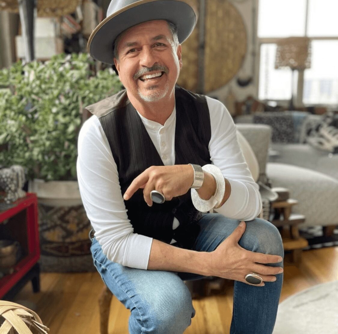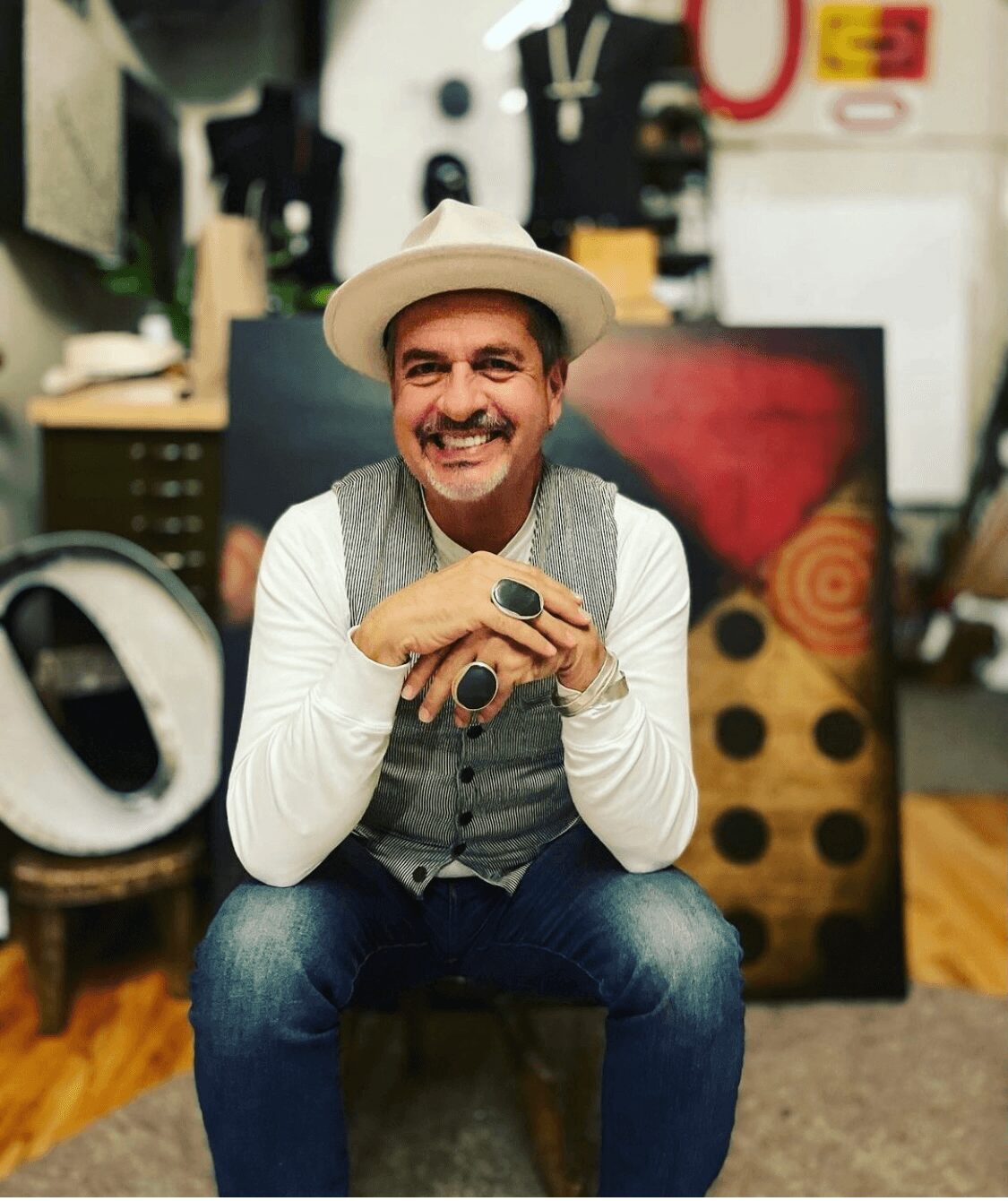 I am an artist, an abstract painter who has been honing my craft through my practice for over 40 years. Full time for the past 30 years. I show my work in galleries around the country and have even been the subject of two mid-career surveys in Colorado museums in the past 10 years. My work is primarily collage (antique book pages and handmade paper) with oil paint on wood panels. I’m also a printmaker, as well as creating work in ceramic, textiles, jewelry and photography. I continue actively creating new work and sharing it with others by exhibiting it. I’ve also created work employing found vintage objects (such as wooden electricians rulers). My work generally has explored my own emotional experiences, by employing objects/ideas that summon nostalgia and evoke modernity at the same time. I am the 16th generation of my father’s family in this country from Spain. My cultural heritage and my life in contemporary society have been rich sources of inspiration. My art continually gives me joy and helps me understand my life and its context in the human condition.