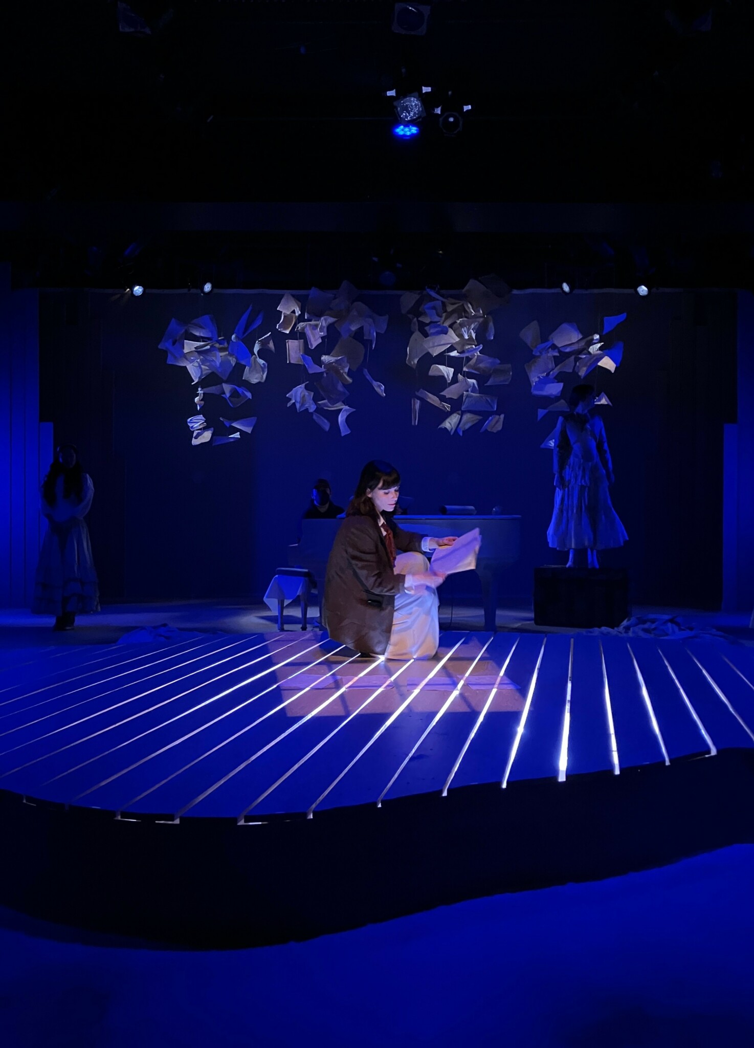 Early last year, I was asked to direct Music Theater Heritage’s production of “Little Women” (music by Jason Howland, lyrics by Mindi Dickstein, book by Allan Knee), and it has been an exciting journey preparing for this production. I always love assembling the design teams, the musicians, the performers, and this project was no exception; Every addition to the team felt like a huge win. All Kansas City local designers: Gabrielle Roney to Scenic Design, Daniella Toscano to Costume Design, Shelbi Arndt to Lighting Design, and Molly Denninghoff on board to play the lead, Jo – all women I admire and feel creatively inspired by. Pre-production was months of conversations, and my own journaling and marking down what concepts and visions felt right – or not right! Most of my process, in all art forms, is to give myself something to edit – just start, put something down. My desk gets full of loose post-it notes of drawings, of possible visual shapes, sketches of what the emotional journeys of the characters feel like to me. For Little Women, I knew we wanted to make an intimate piece of theater. Our space at MTH lends itself to that – It’s a small thrust theater- and we chose to use only a piano for accompaniment. Scenically, I knew we would want this piano as the center piece, and the rest of the stage to feel open, like a fresh page. “Little Women The Musical” is a memory play and a celebration of storytelling; it’s mobilizing powers, and its unique ability to immortalize the ones we’ve loved and lost. If you are unfamiliar with Louisa May Alcott’s “Little Women” – I’ll catch you up – set in Civil War Era America, the protagonist Jo, is an aspiring writer, searching for her place in the world, searching for something that gives her significance within our patriarchal culture that exists to strip her of significance. In the musical, we clip through iconic scenes from Jo’s memory, and it’s all leading to the moment she decides, or realizes, that her personal experiences from girlhood are worth writing about. And so, I wanted to visually represent this expectant feeling, the swirling experience of memories and scenes floating in and out of mind, how it feels to have an idea – Gabby and I, and our technical team, have come up with a physical way for this to manifest on stage – and you’ll have to come see the show to see its effect! Daniella’s beautiful costume design is an abstracted take on the era-appropriate wardrobe, a memory of the silhouettes. I wanted our simplified instrumentation (just piano) to inform the other design elements. Let the whole piece feel abstracted, stripped down and structural, and in this way we’ll get closer to the heart of it. I wanted to see the cage of the hoop skirts, the bones of the corset – to me it evokes the oppressive, constricting experience of fitting ourselves into extreme gender expectations. All of this pre-planning was very fun and hypothetical. Now that we are in rehearsals, things are getting practical: we’re putting these scenes on their feet, singing the songs live in the room, discovering staging together, it’s a whole new level of fun and experimentation. It has been so rewarding to build this production, to reanimate these well known scenes and characters, to try our rendition of this musical – rewarding because of its message of hope. I love spending my time in this mindset; it’s very healing and empowering to meditate creatively on these themes.