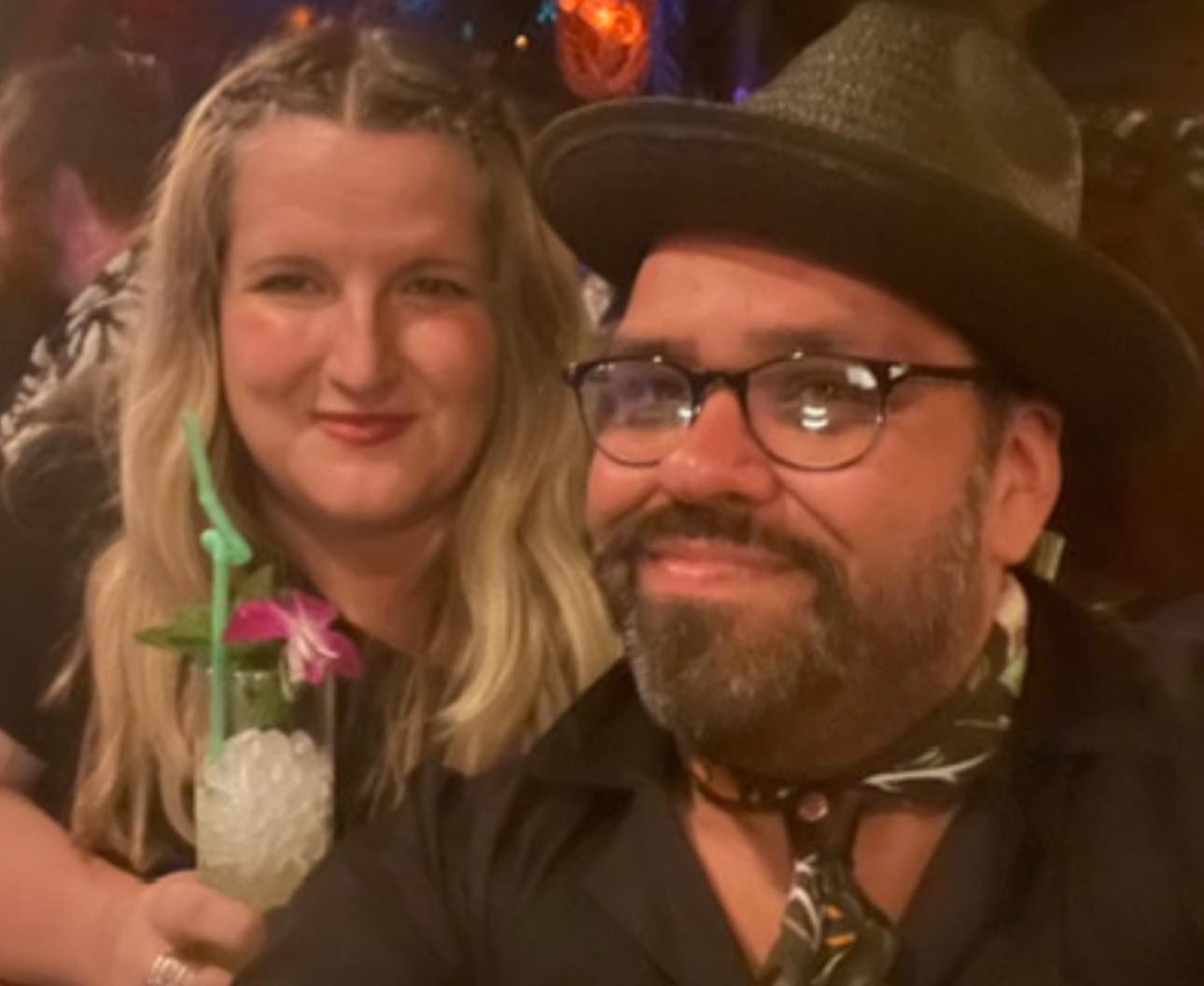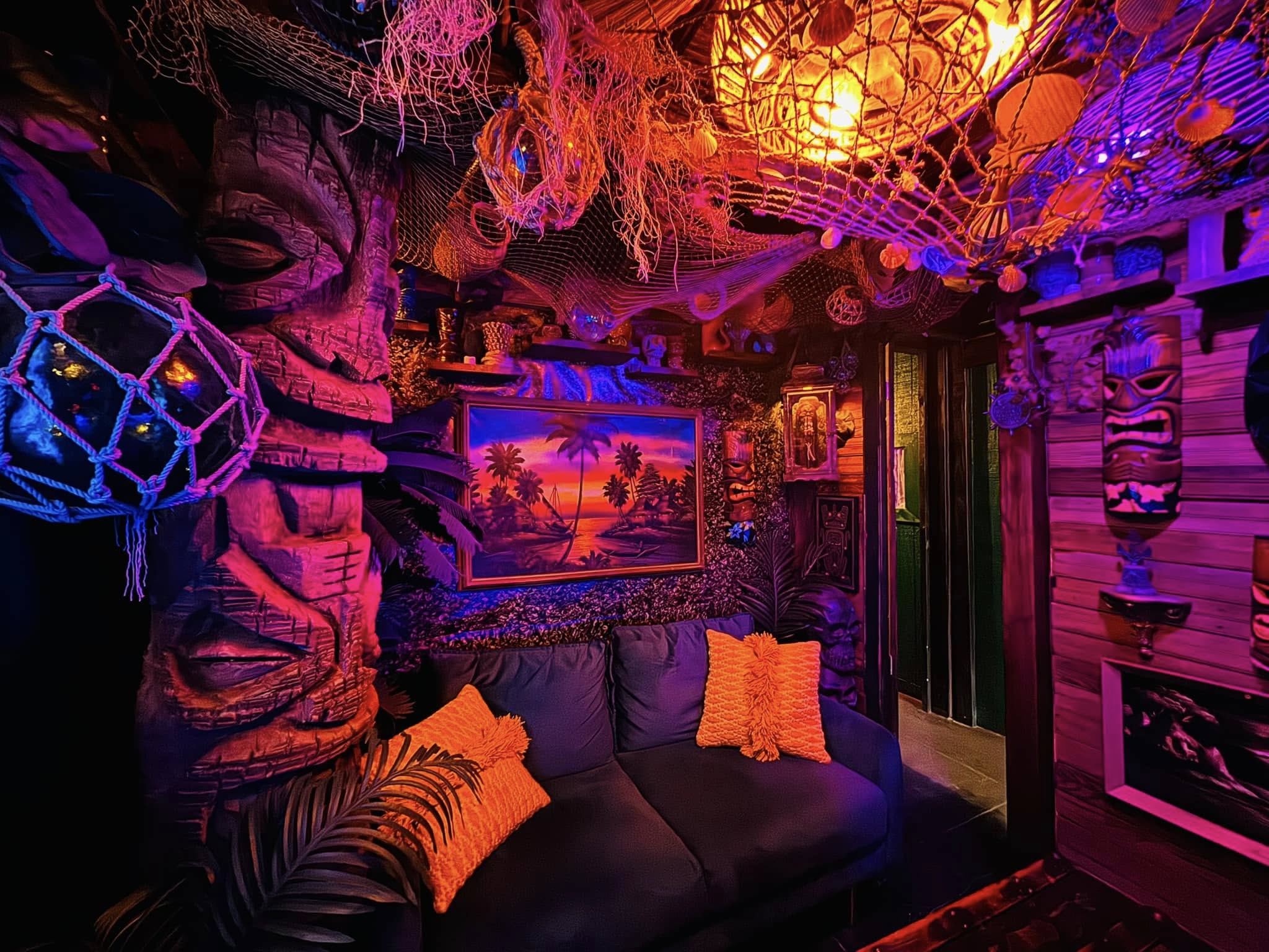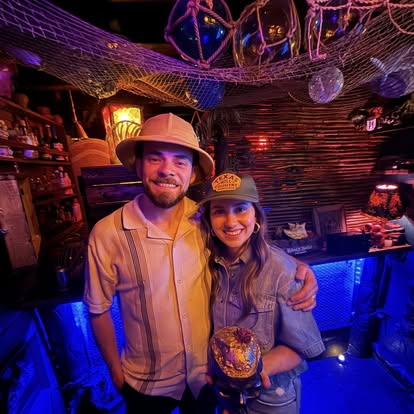 I suppose the two of us were destined to entertain. When we lived together at his family home in San Antonio, we would host these themed New Year’s parties that grew over the course of ten years from 7 guests to 150. Over the pandemic, we built a very large cover for the big back patio that was attached to the home and added a large vintage wood stove we found on Facebook marketplace, a bar made out of things we found on the side of the road, and stenciled the concrete pad patio with 255 ornate stencils, creating a getaway space that became the “Cheers” of our neighborhood in San Antonio. Friends would come on the weekends, and it was there that Rocky perfected his drink recipes, became interested in pre-prohibition-era cocktails, followed by his deep interest in Don the Beachcomber, tiki subculture, and tropical drinks. Meanwhile I designed the spaces where he would create his flavors. I would scour the online marketplace for used furniture and art. As a producer, I even scored a giant three-faced tiki carved from a 6.5 foot piece of palm tree that the host of a crew AirBnb in California sold to me for $50, so we schlocked it onto the top of our van and drove it across the desert and right back to Texas.