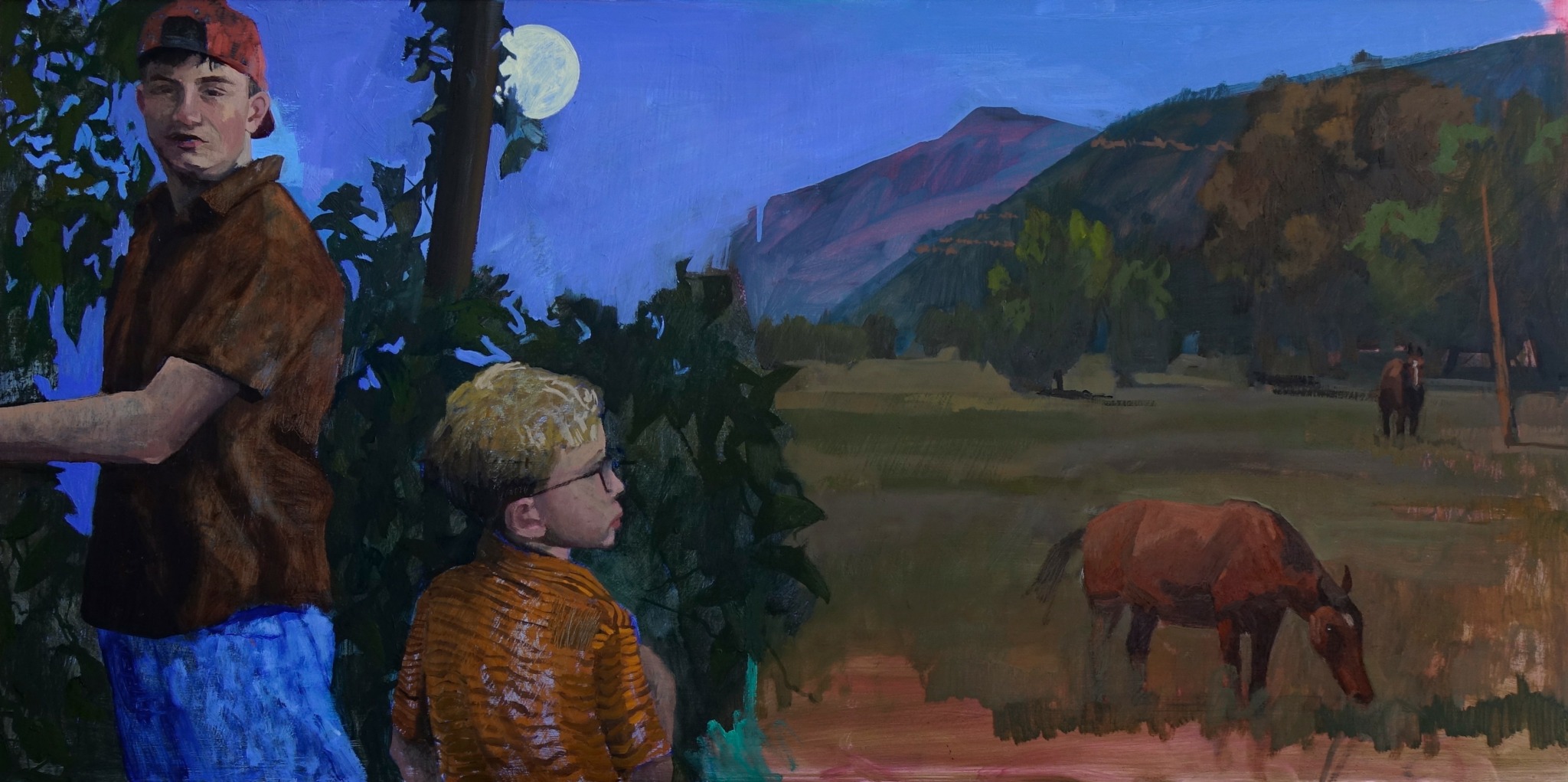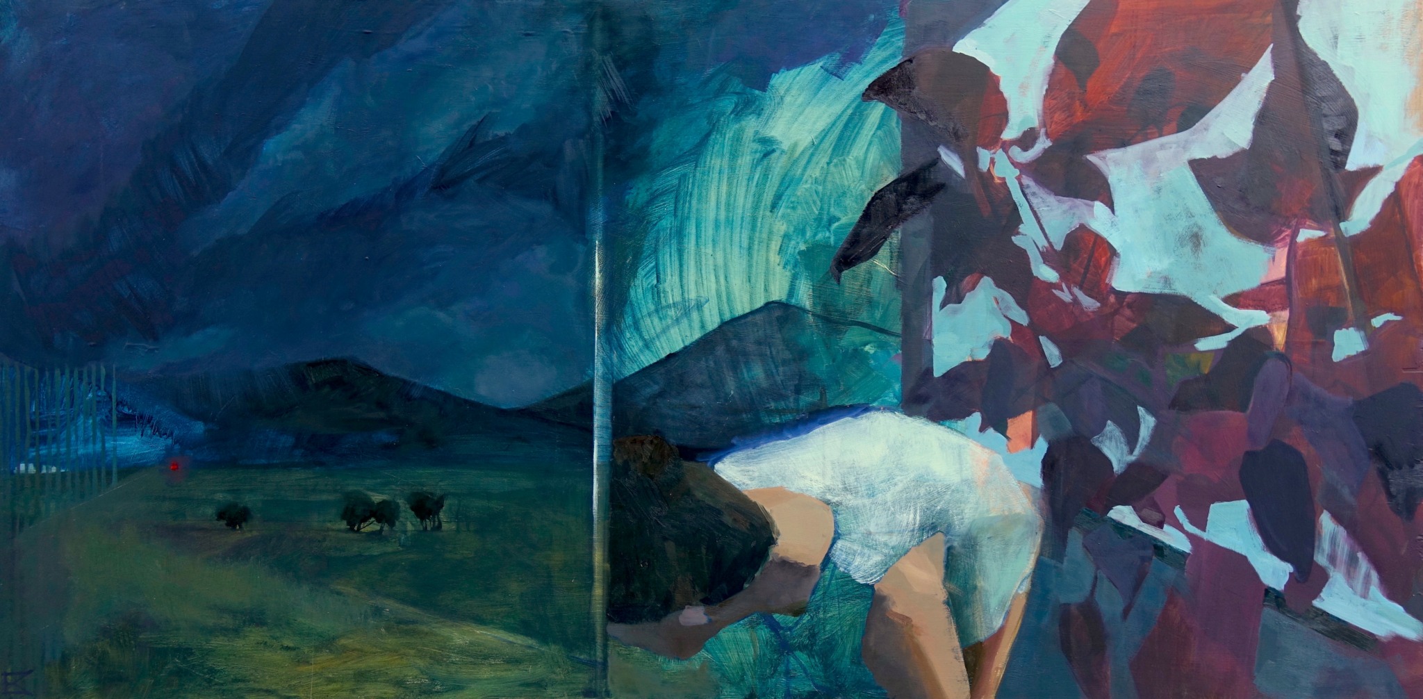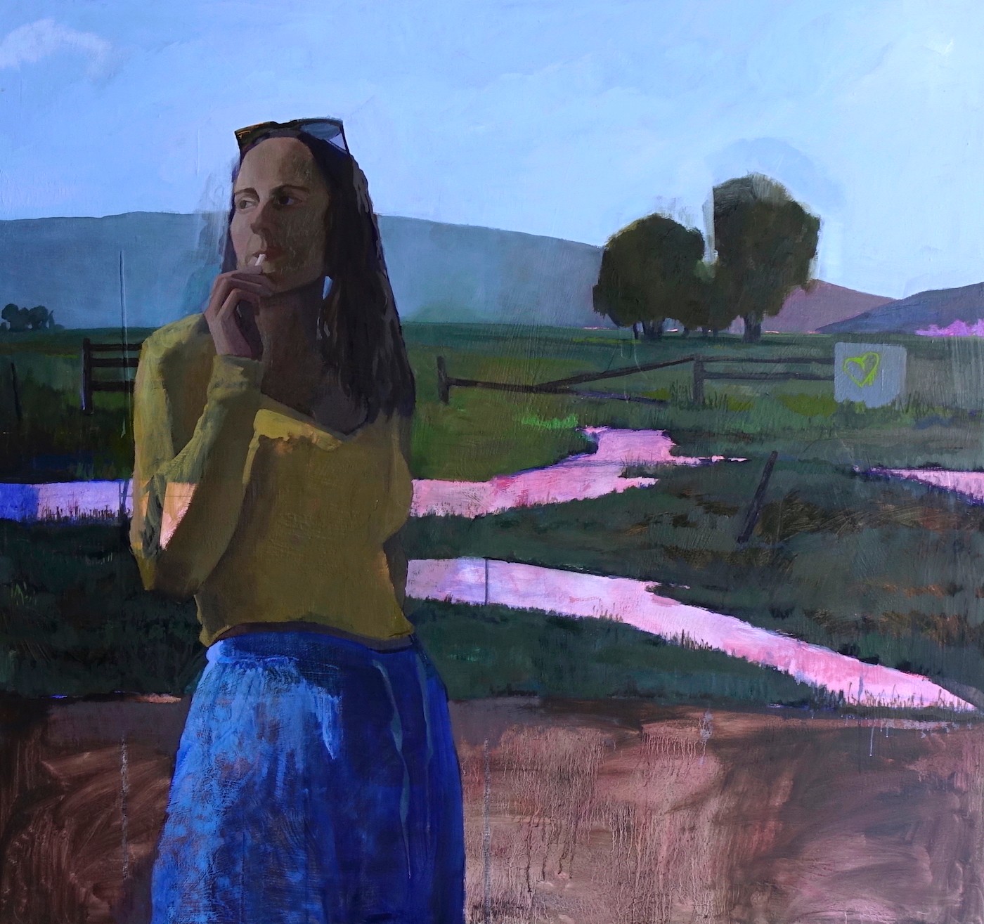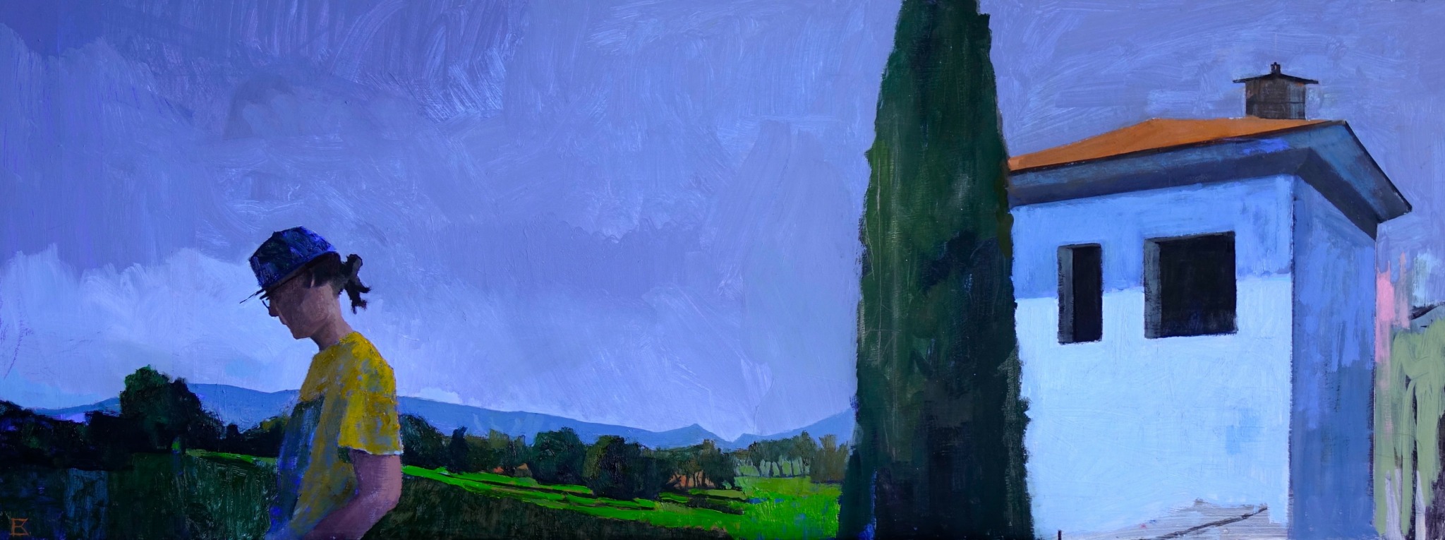 My painting practice uses plein-air as a jumping off point. I often make a plein-air landscape, then take it into the studio and layer other scenes and figures into the work. I bring different scenes together in an attempt to convey the strange and disorienting realm of memory.