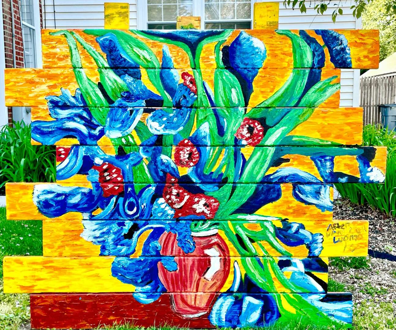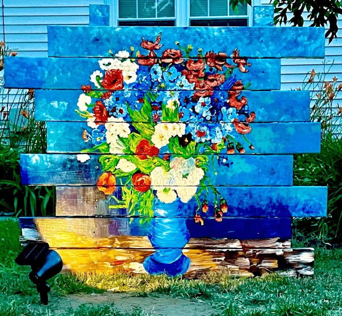 I am working to create an outdoor museum featuring Van Gogh-inspired pieces, other post-impressionist artists, as well as original works. This project was born out of a desire to counter the negativity of the pandemic era and to foster a sense of community through art within my small historic village and beyond. I am excited to offer something entirely unique to the world of art. As far I know, nothing like this has been done before. Each piece is painted onto a “canvas” that I build from treated pine wood planks. Each piece is 4 feet in length and 4 feet in width, with all boards are off set, but it can vary in size per customer’s vision as well. Through this project, I aim to provide a positive and uplifting experience for the community and foster connections among neighbors and create a shared space for enjoyment. The response to this project has been overwhelmingly positive. I’ve made new connections among people and created a sense of shared pride. These outdoor pieces have provided a source of comfort and inspiration for many. I typically work on the pieces outdoors, in front of my home, which has led countless impromptu conversations with neighbors and those just driving by. I enjoy exploring new mediums and techniques through my creations which has led to personal and artistic growth. By placing the art in public spaces, it is accessible to everyone. I am currently working on my largest piece yet, which is situated in front of the community center in our town.