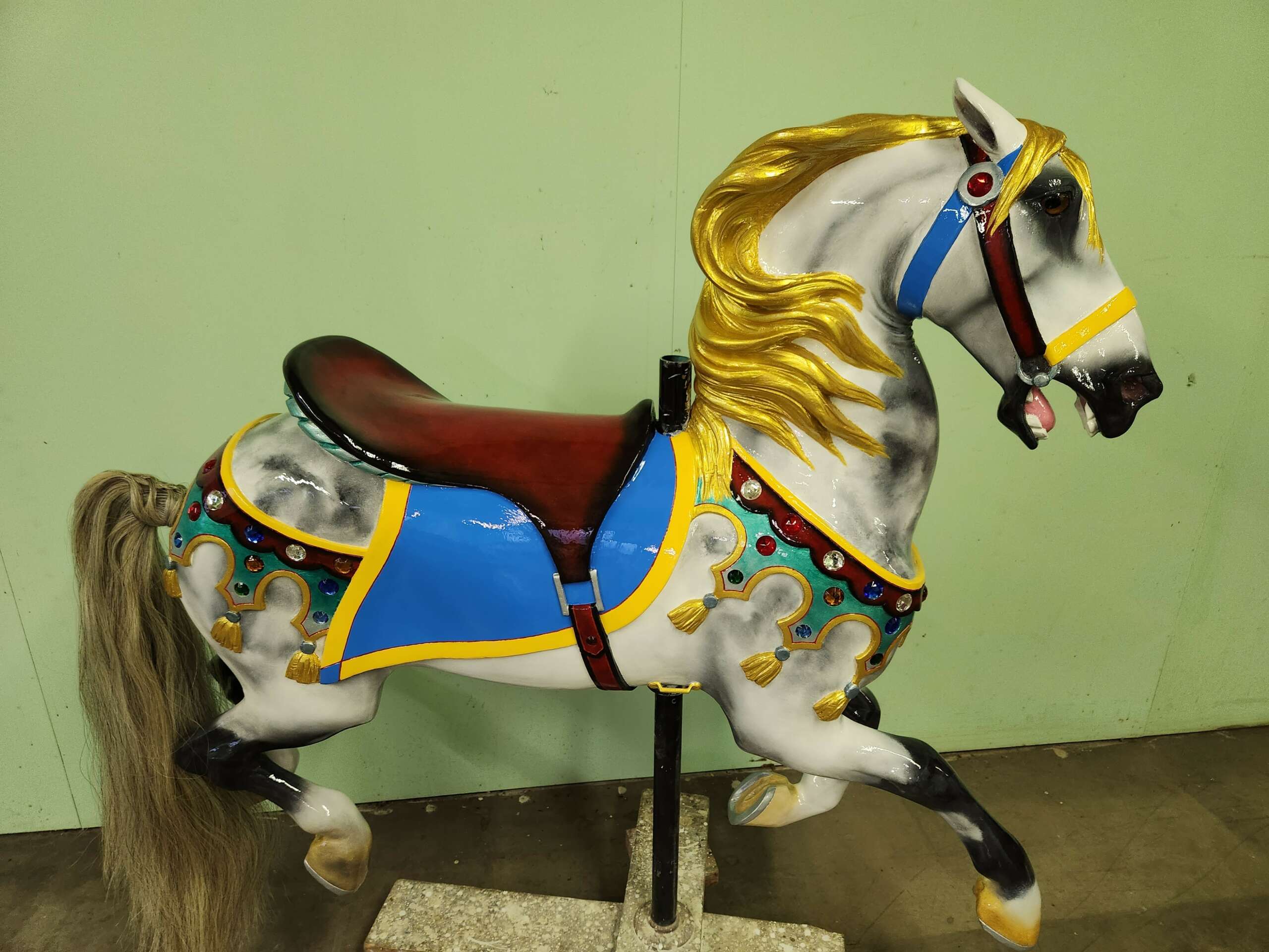 The Giraffe was recently installed on the Scovill Zoo Carousel and waiting for its first rider.