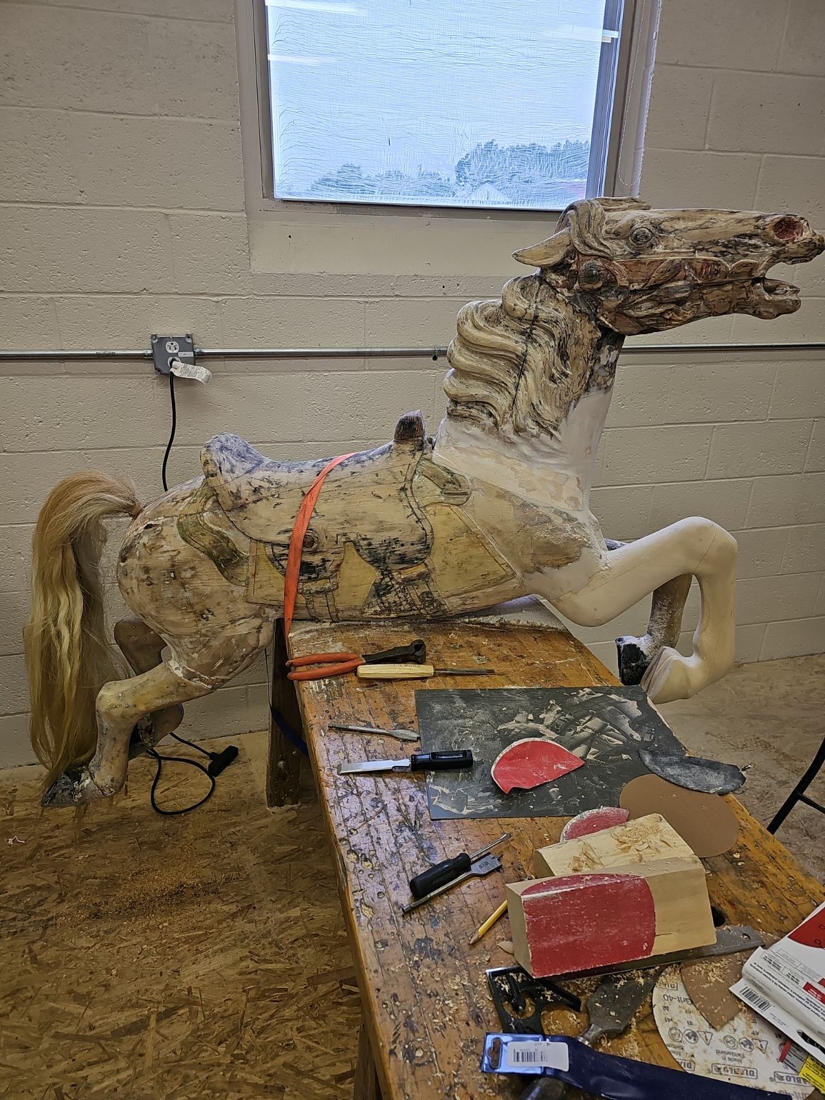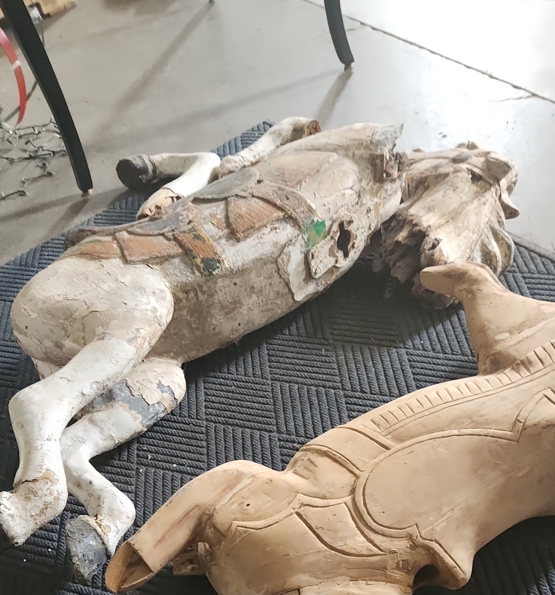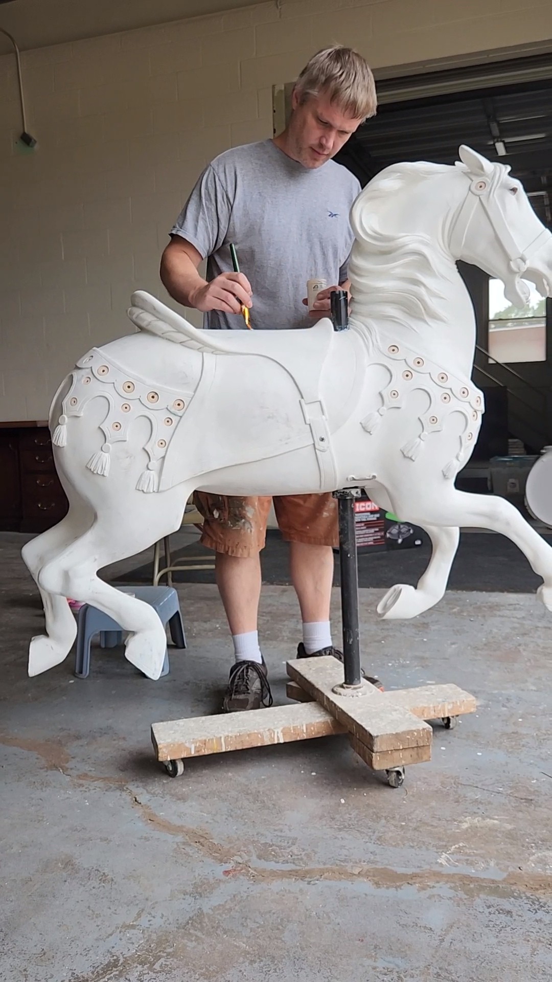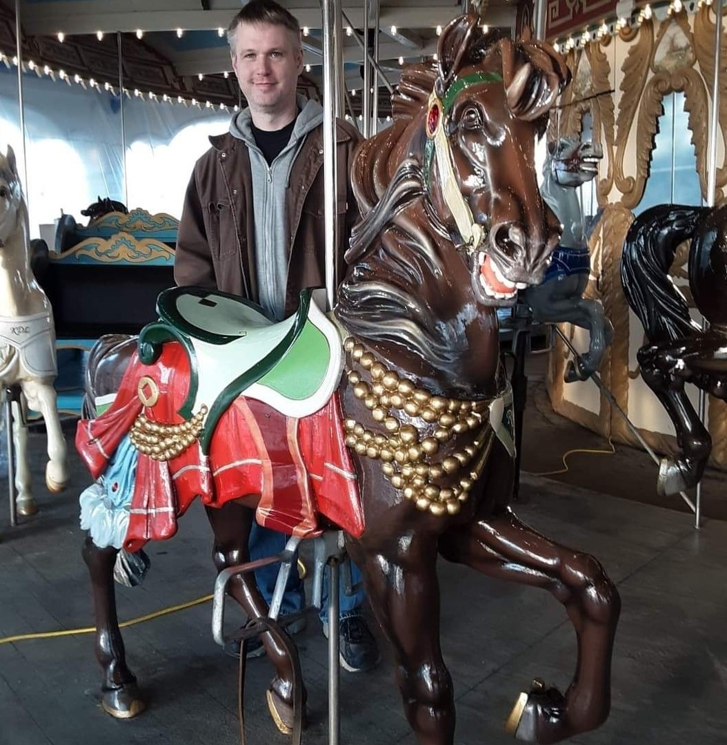 I never planned or dreamed of working on carousels while growing up. I have always enjoyed art, so I pursued that passion and attended the Ohio State University Art Program. After graduation, I worked for the Columbus Museum of Art for a while. I grew up in Mansfield, Ohio, which is a good hour drive, and so I would often go home on my days off. I decided to find a job closer and to move back home after my dad had his widowmaker heart attack. He was given only a 7% chance of survival after they revived him. I knew mom was going to need help around the house during his recovery. So I knew I needed to job hunt around home. Just so happens that my sister in law saw an advertisement for a local company that builds carousels. I was hired the same day I applied at Carousel Works. I worked for them for around 11 years. I started as “just” a painter and then grew to be head of the paint department, lead on all the traveling touch up trips, took part in nearly every carousel install and was promoted to project manager. I was devastated when I was laid off from Carousel Works when they ran into hard times. Because my wife and I had a 6 month old, I couldn’t wait long for them and had to find a new job. When they had to officially close their doors and we heard everything was going to auction, we wanted to see if we could save anything. Just so happens, other friends received word through the grapevine of a contact and gave me their info. We were able to save a large majority of the contents of Carousel Works and most importantly, the patterns used to create what we know as carousel figures, before they were dispersed at auction. Together, my wife and I, with lots of help from my parents, friends and family, have started our business of restoring and creating new carousels and their figures. We also provide consultation services, and pieces and parts of figures that people may need for their own restorations. Each of our carousel figures is built from a stack of boards and a bottle of glue. We don’t use machines for our figures. Every one is hand built, hand carved and hand painted. Just like they were 100+ years ago.
