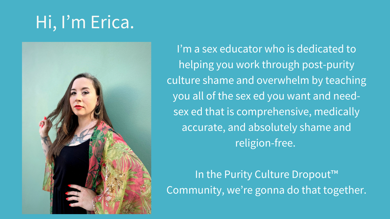 Lack of basic sex education can cause many difficulties including alienation from your own body and desires, lack of sexual health knowledge, unwanted sexual health outcomes, and relationship difficulties. I call my programs Purity Culture Dropout™ and I trademarked that name.