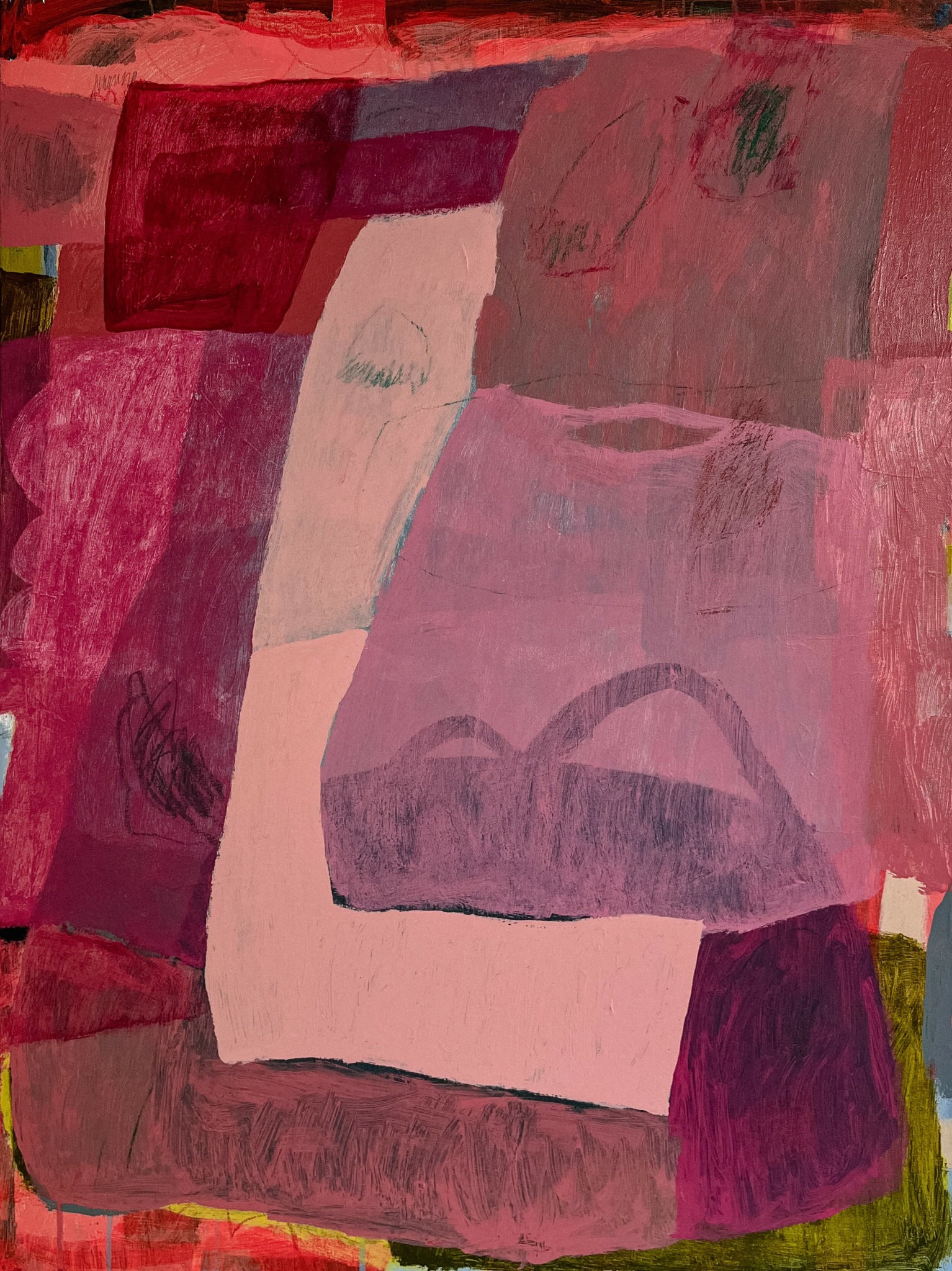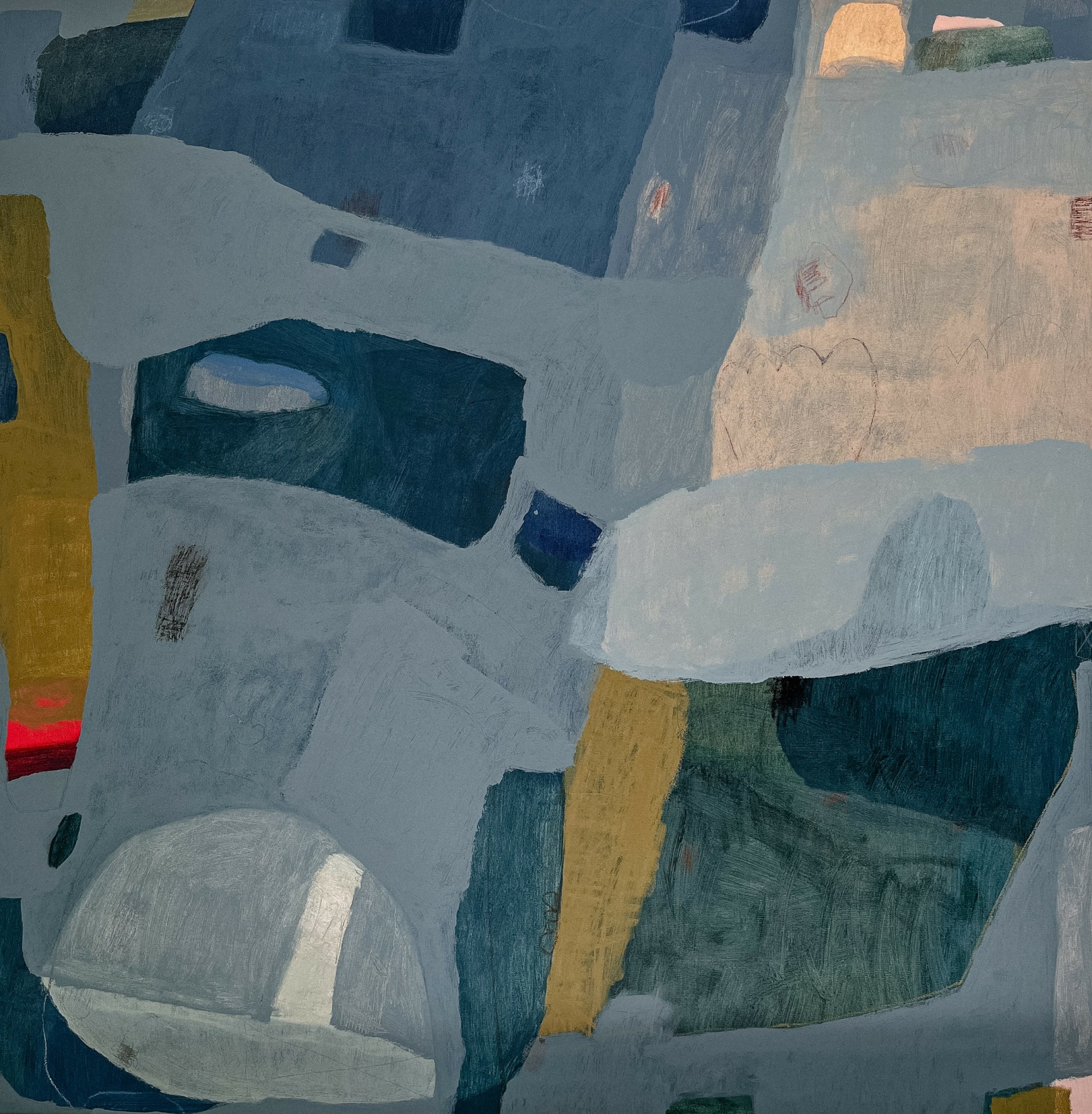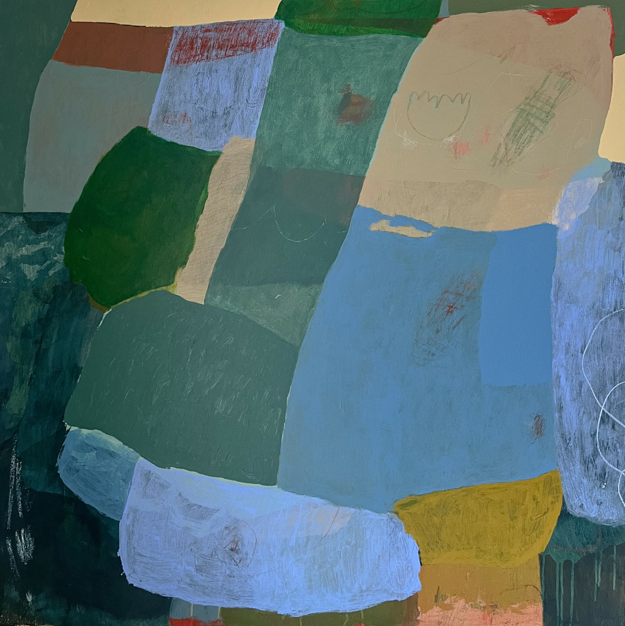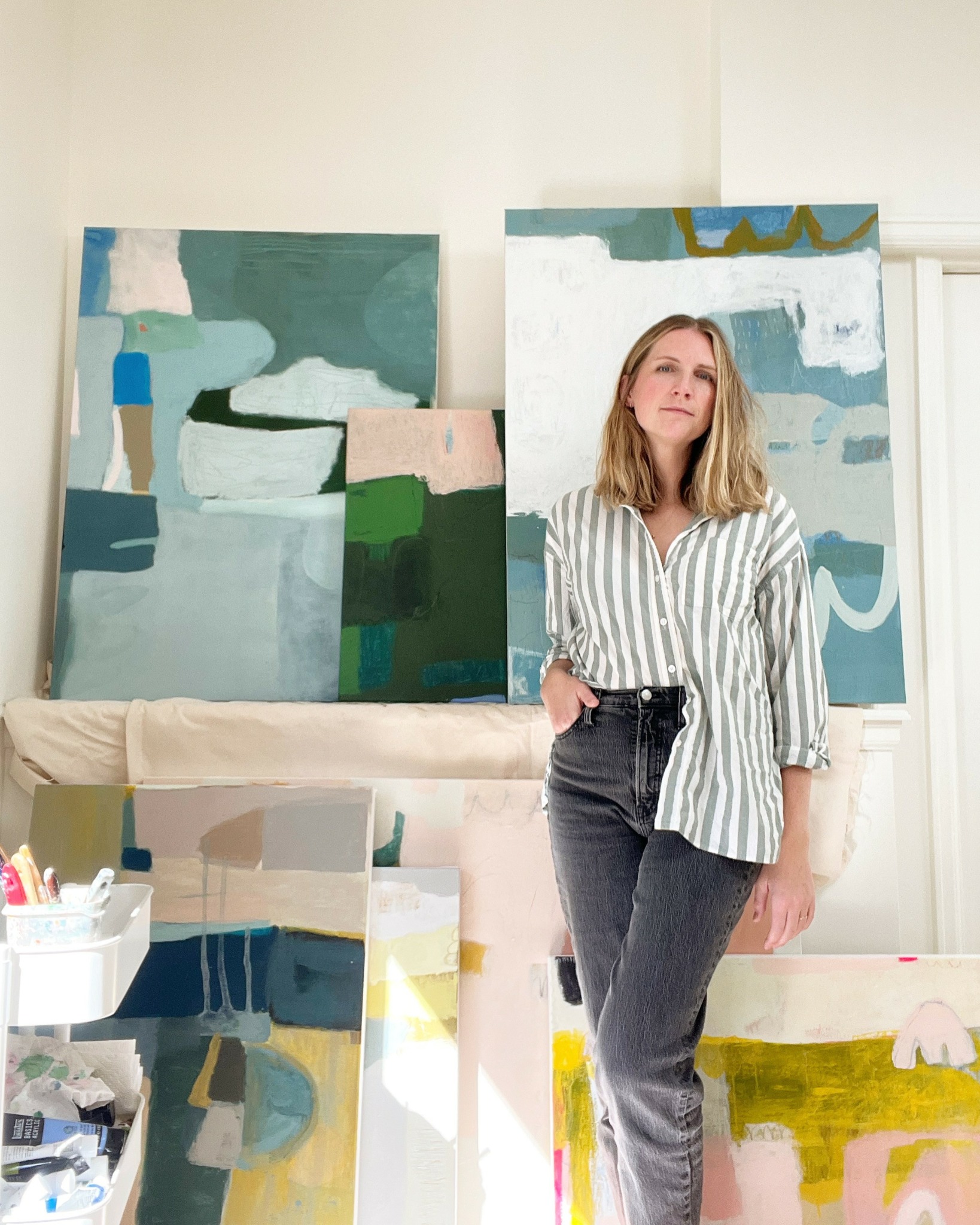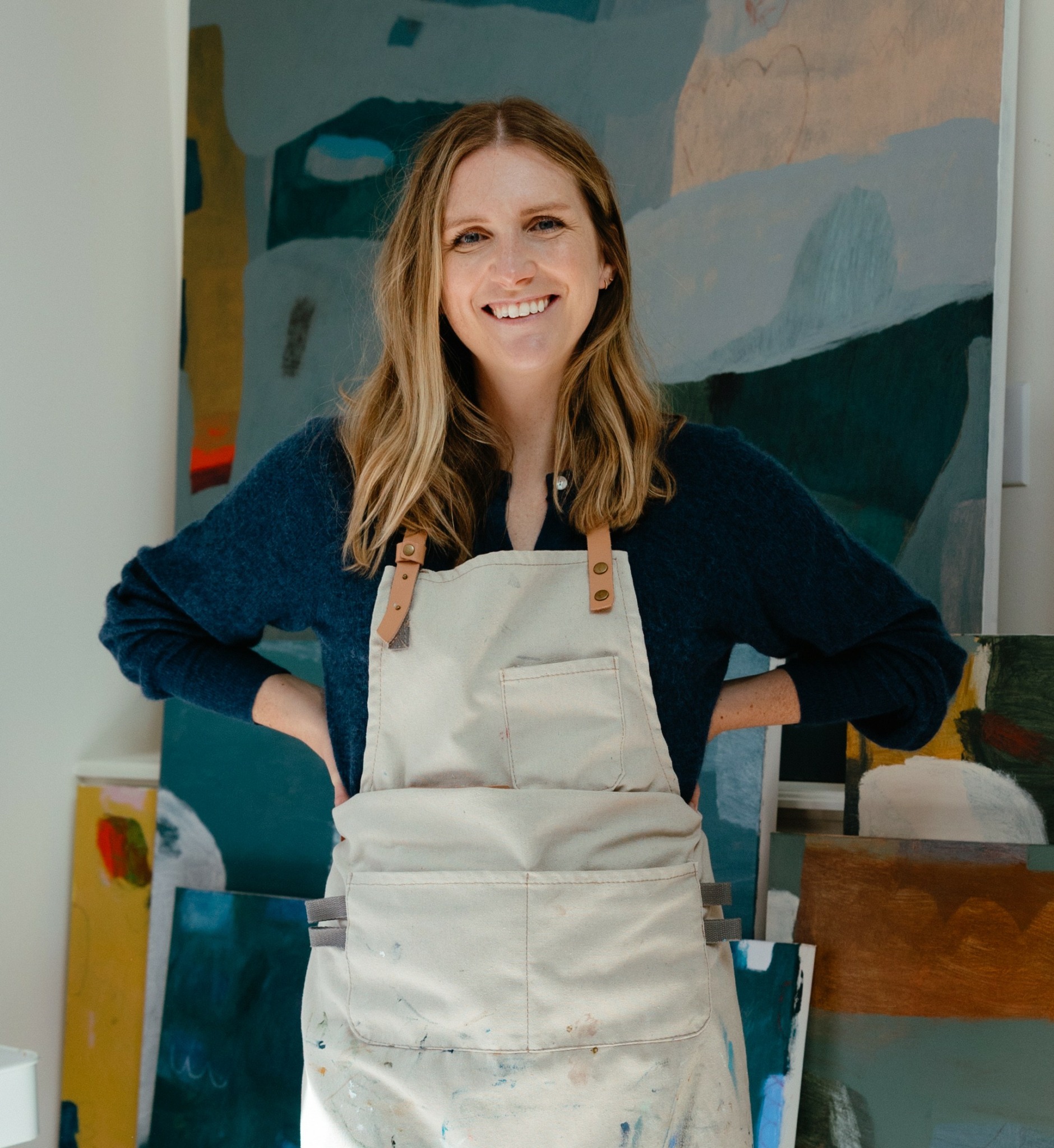 I consider myself a contemporary abstract painter. I create original paintings on canvas as well as commissioned pieces. My artistic practice is an introspective ritual of looking at what lies beneath, examining the stories we tell ourselves. I appreciate the creative process as a lifelong exercise in being present and learning to live at ease with myself. Continually recounting time spent in nature, traveling, the sights and sounds of childhood, and rhythms of daily life, my paintings act as a visual memory—brought to life via free and intuitive compositions, large blocks of color, abstracted forms, and gestural mark making, otherwise known as “swiggles” and “doo dads.” Adding layers. Undoing layers. My work and my personal journey go hand in hand, uncovering a tale of millions of moments, woven together to make up my narrative—stories that guide me, and others that no longer serve me. Through my work I grapple with the evolving contrast between the gain and release of control, desperately upholding some boundaries while letting go of others.
