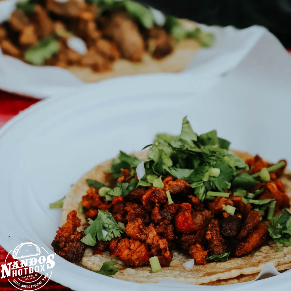 Hello! My name is Fernando. I am a San Diego transplant originally from riverside county and in love with San Diego. I still work as a social worker by day and a food vendor on weekends; hopefully next year I can quit my day job and dedicate myself 100% to my food business. As I mentioned earlier we originally started selling burritos at the swapmeet but shortly after we launched Nandoshotbox. We started cooking and selling large plates of foods such as ribs, burgers, tortas, guisados with rice and beans but people would always ask for me to sell them tacos of chicharron which is by far my most sold protein item on the menu; then we transitioned into being taco vendors. As a taco vendor we have been able to stand out by being the first street vendor to sell tacos de guisados; popular tacos in Mexico and also by reinventing the papa loca how I like to eat it. By being consistent and innovative we have maintained our place amongst our peers and clients as some of the most delicious tacos in SD county!