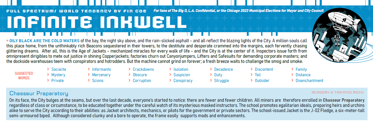 My name is Fin Coe and I live in Chicago, doing copy and technical writing by day, and writing for the theatre and tabletop games by night. Since coming to Chicago back in 2010, I have written sketch comedy, theatrical reviews, and short and full-length plays. More recently I’ve been able to teach playwriting, moved into a writing role in my professional capacity, and have written for small-press tabletop roleplaying games. I’ve worked for independent groups, storefront, not-for-profit, and across multiple industries, and my passion for the collaborative generative process, and refining through collective feedback, is what drives me.