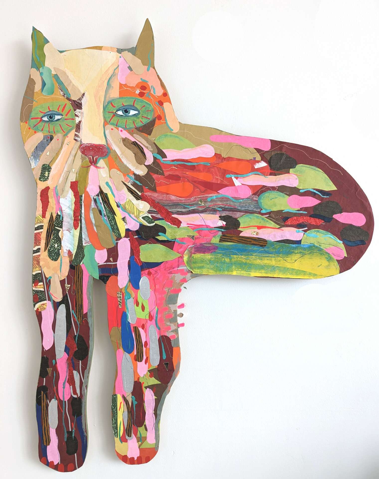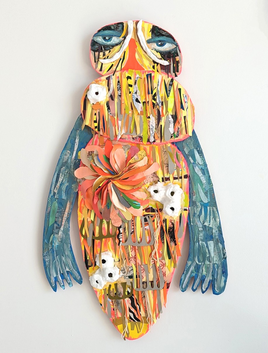 My 2D work is more like wall sculpture. I work on wood, painting with scissors and cut paper to create layers, layers, layers and then use paint, ink or whatever I find in my studio to add more dimensionality to the work.