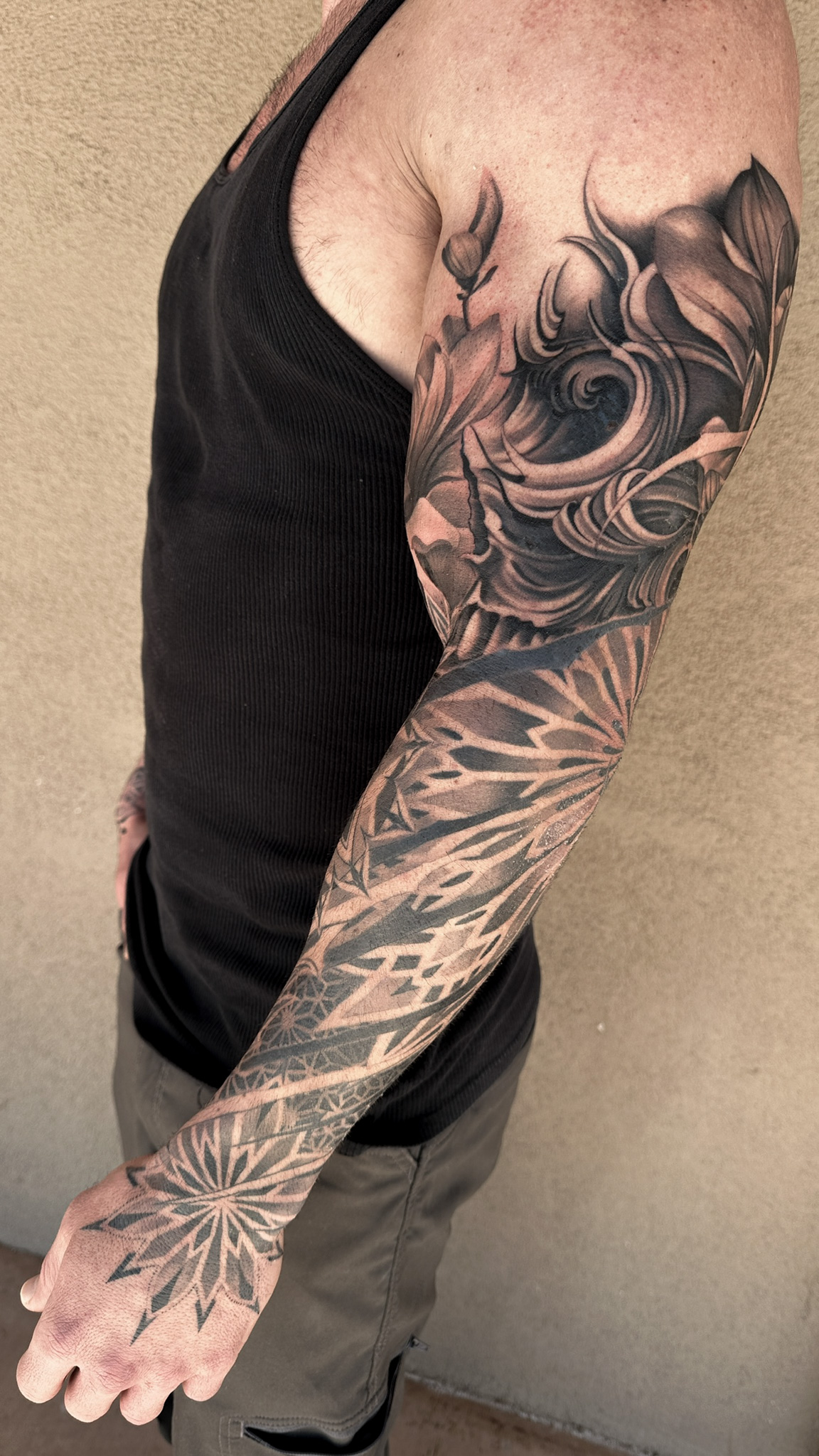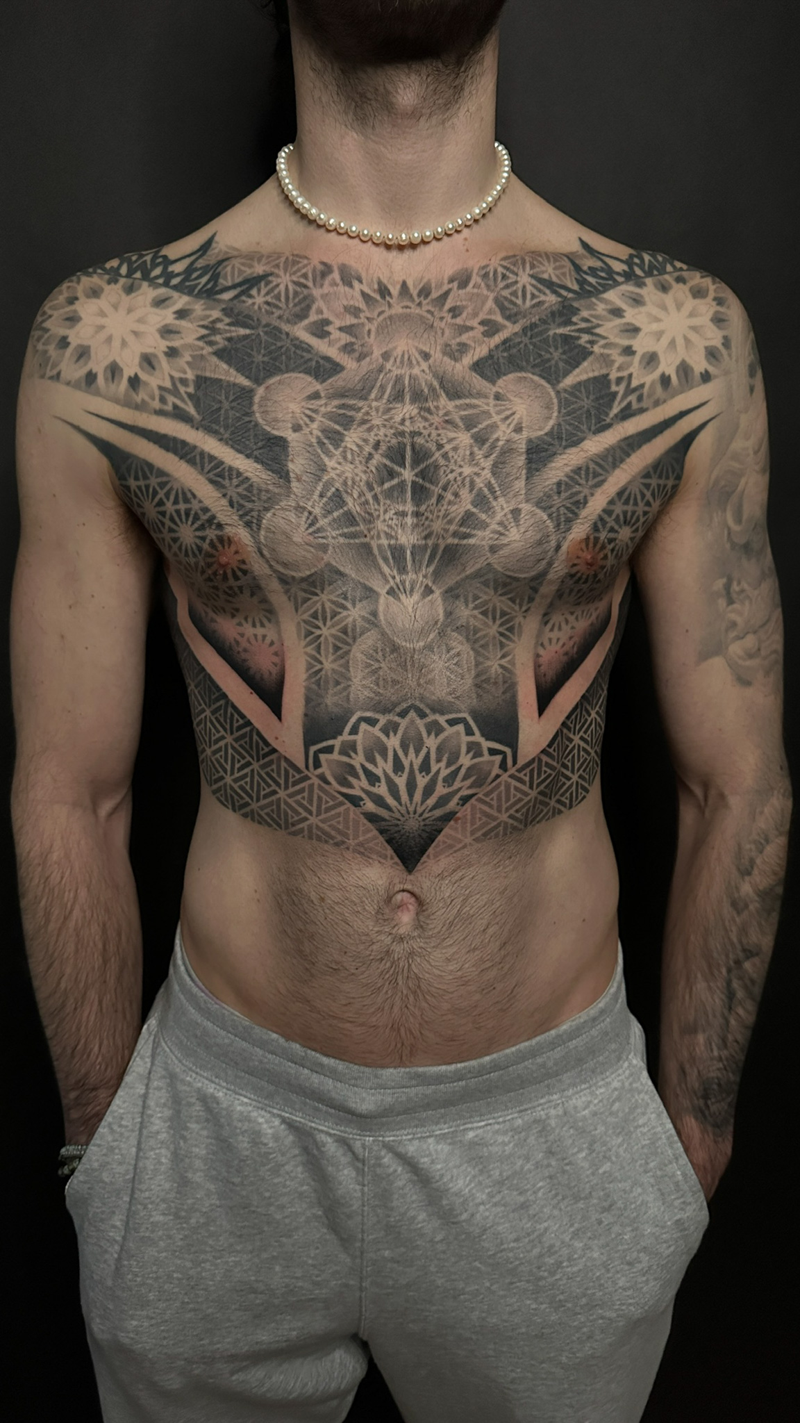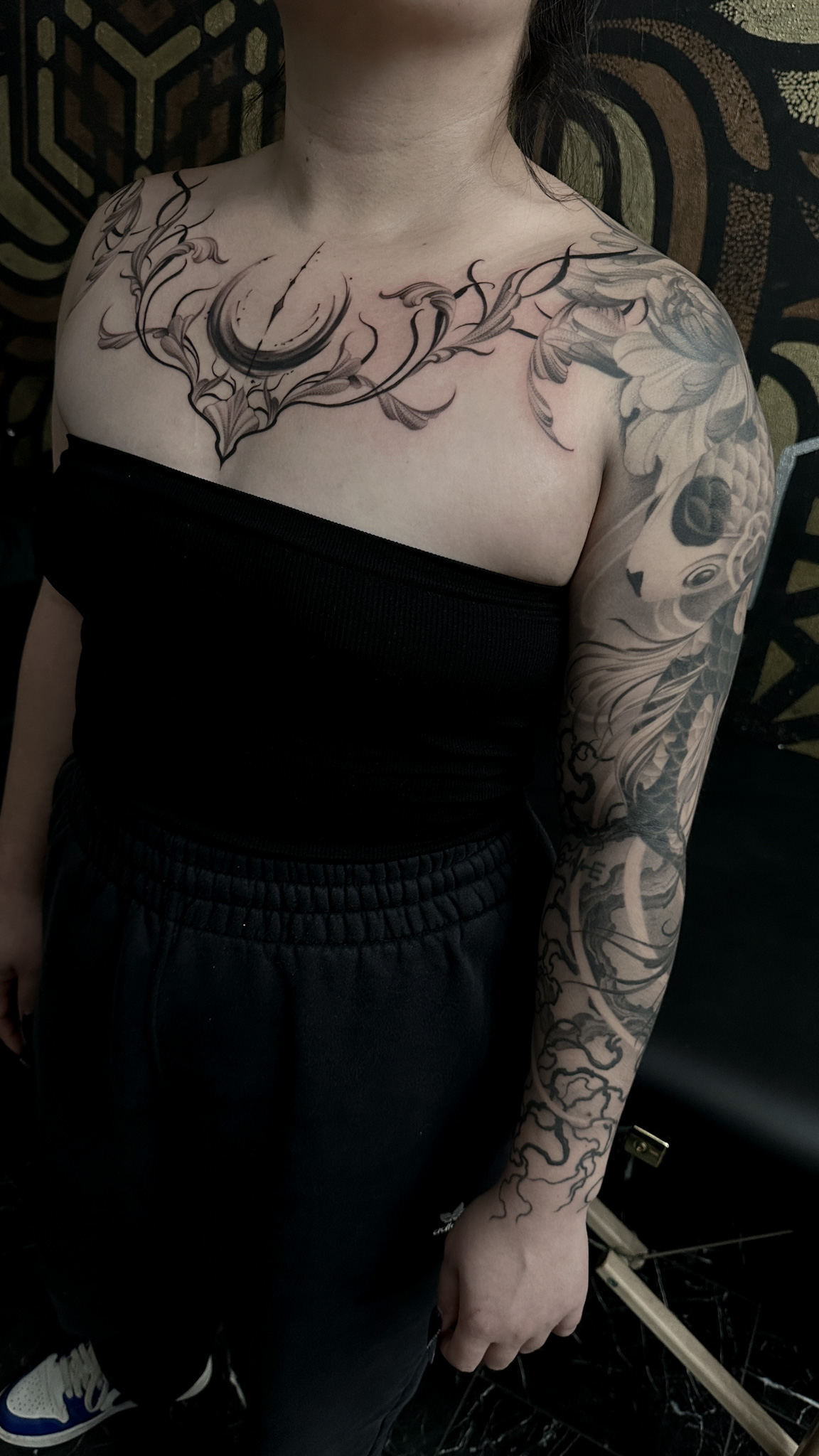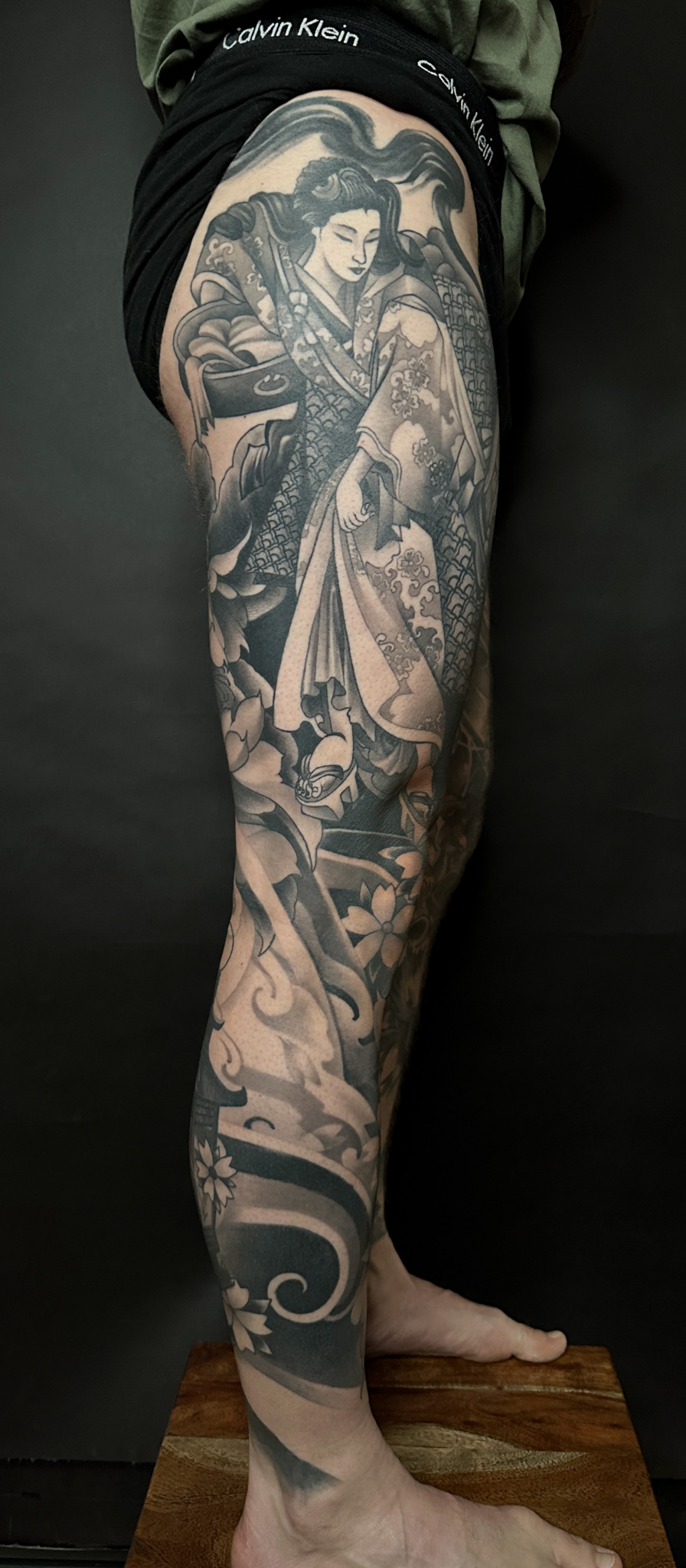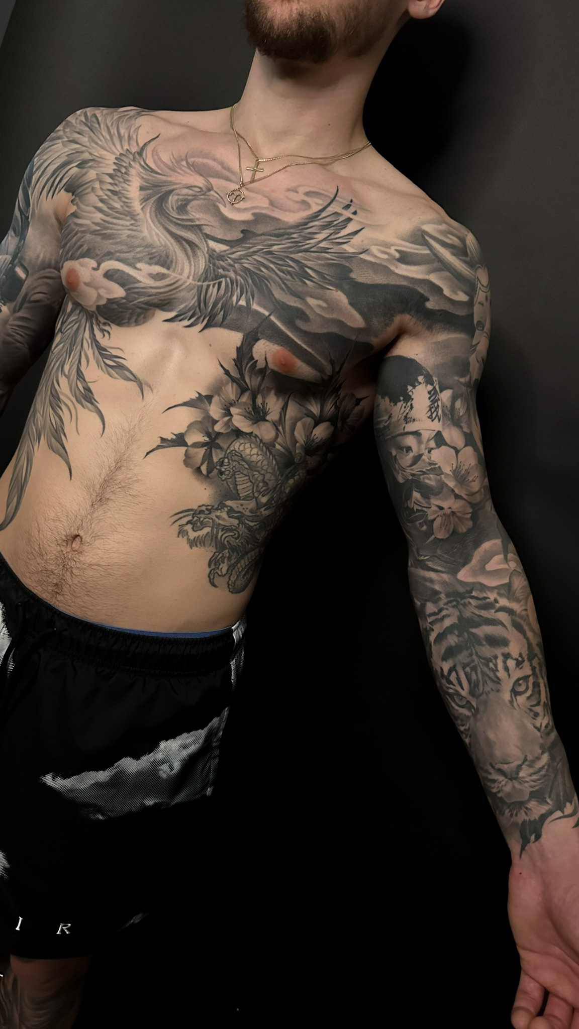 I create large-scale custom tattoos in the black and grey style. My skills range from realism to freehand, neo-japanese to geometric. I enjoy creating a blend of all these styles as it’s more challenging for me, it keeps me more innovative as I listen to my clients and their ideas and then enjoy suggesting original concepts with deeper meaning. The more freedom I have to create, the more original and well executed the tattoo will be, as my 14 years of experience studied tattoos all over the world comes in.