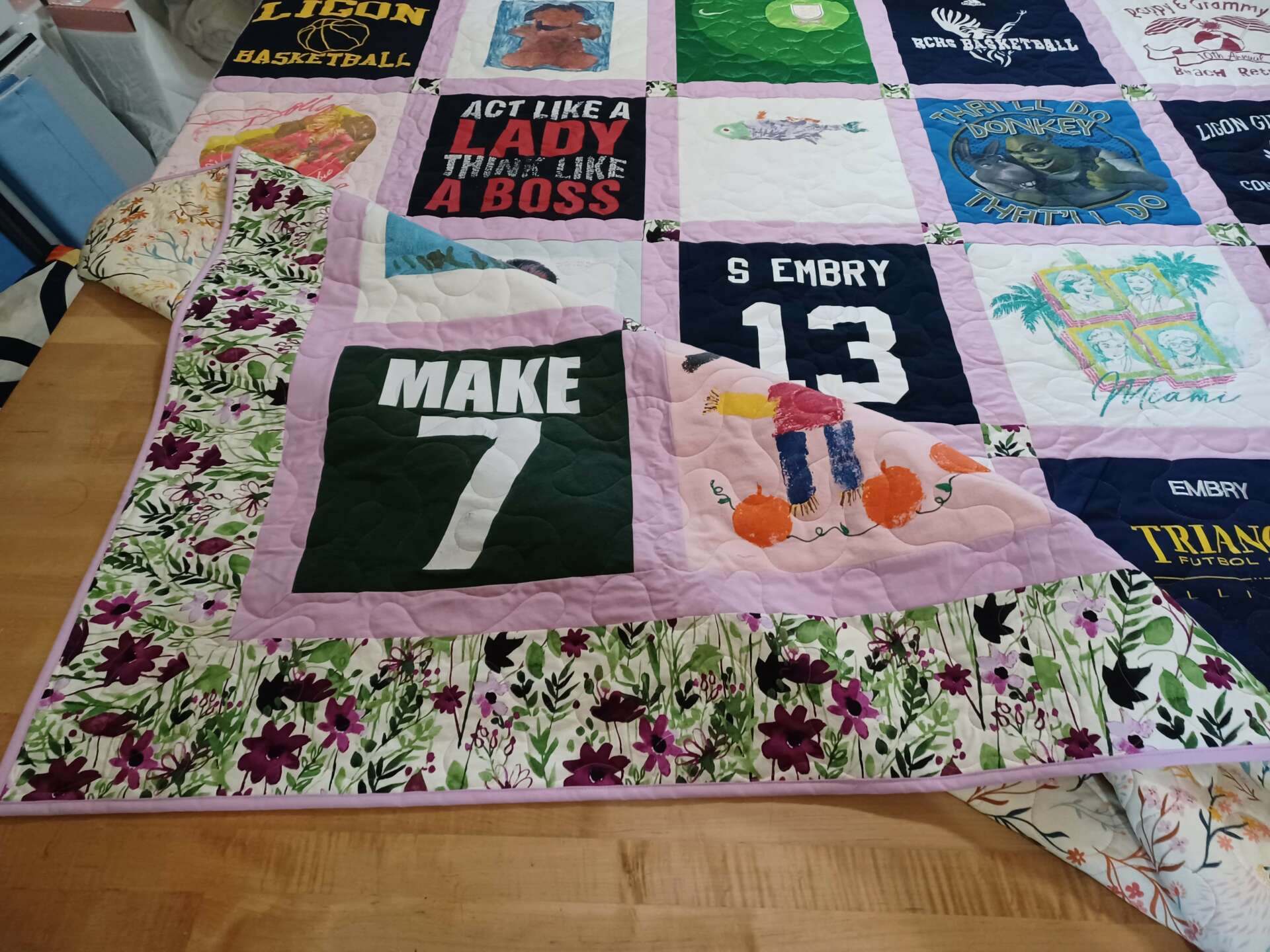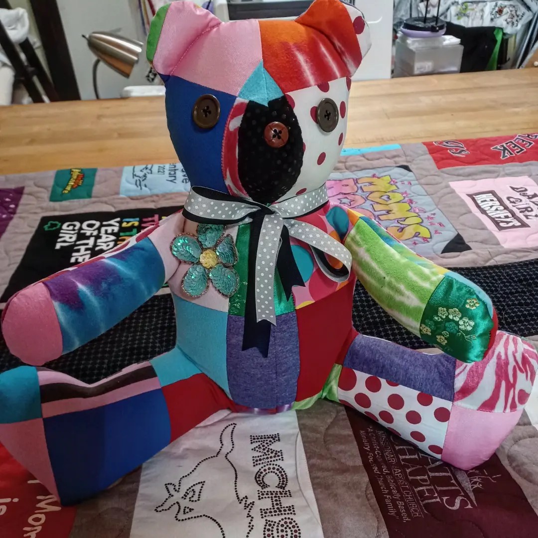 I am Ginger Cherry of Finished Fibers, LLC, and the core of my business is making custom quilts by commission. I make T-Shirt quilts, Memory Quilts, Memory Bears and Memory Pillows from clothing that the customer provides. I also make Custom quilts from quilter’s cotton if a customer so desires it. I make all of these quilts from scratch. I create custom patterns, cut the clothing and fabric, interface the clothing as needed, and piece each quilt top. I hand guide the quilting of each quilt with my APQS Lenni sewing machine, and I bind all of the quilts. I also offer embroidery services for the quilts I make. I take on commission projects that include quilts that have already been started or need a few repairs, too. When quilters die or reach a point where they may need a hand finishing a project, I can usually help, and I really enjoy seeing the work of other quilters and collaborating with them when I can. I sometimes do custom quilting for clients if they do not desire edge to edge quilting. I love quilting and sewing, and I delight in using my design and artistic skills to create items that people will cherish for a lifetime. I enjoy helping customers commemorate lost loved ones and celebrate milestones like graduation. I also enjoy helping people with having something special made for themselves…something tangible and cozy.