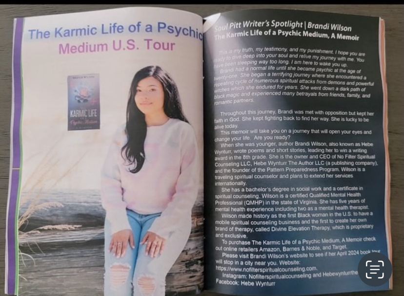 My name is Brandi Wilson aka Hebe Wynturr. I own No Filter Spiritual Counseling LLC in Virginia Beach a book company called Hebe Wynturr The Author. I’m an actress, model, psychic medium, and author. I wrote a memoir called The Karmic Life of a Psychic Medium. I made U.S. history 3 times and was featured in several magazines.