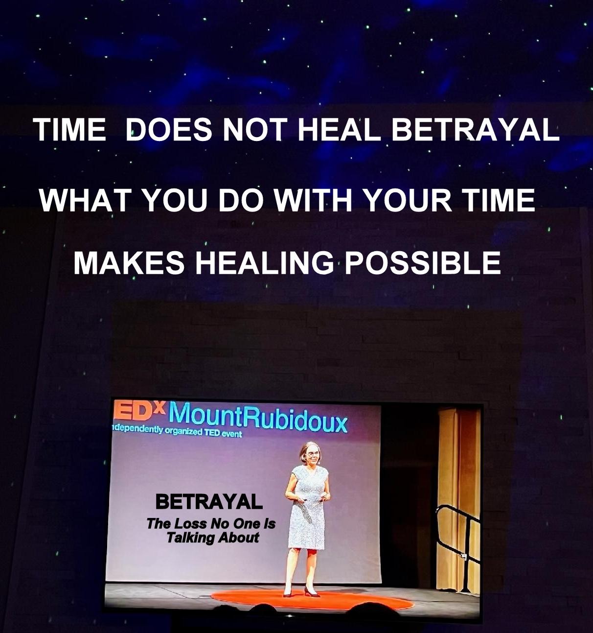 As a result of taking the risk to share my research and ideas around betrayal trauma, I was invited to speak at TEDxMountRubidoux September 24, 2022. Since my talk Betrayal: The Loss No One Is Talking About, was uploaded onto TED and TED YouTube on October 5th, 2022, to date it has received over 135,000 views, 4 K likes, and nearing 500 comments.