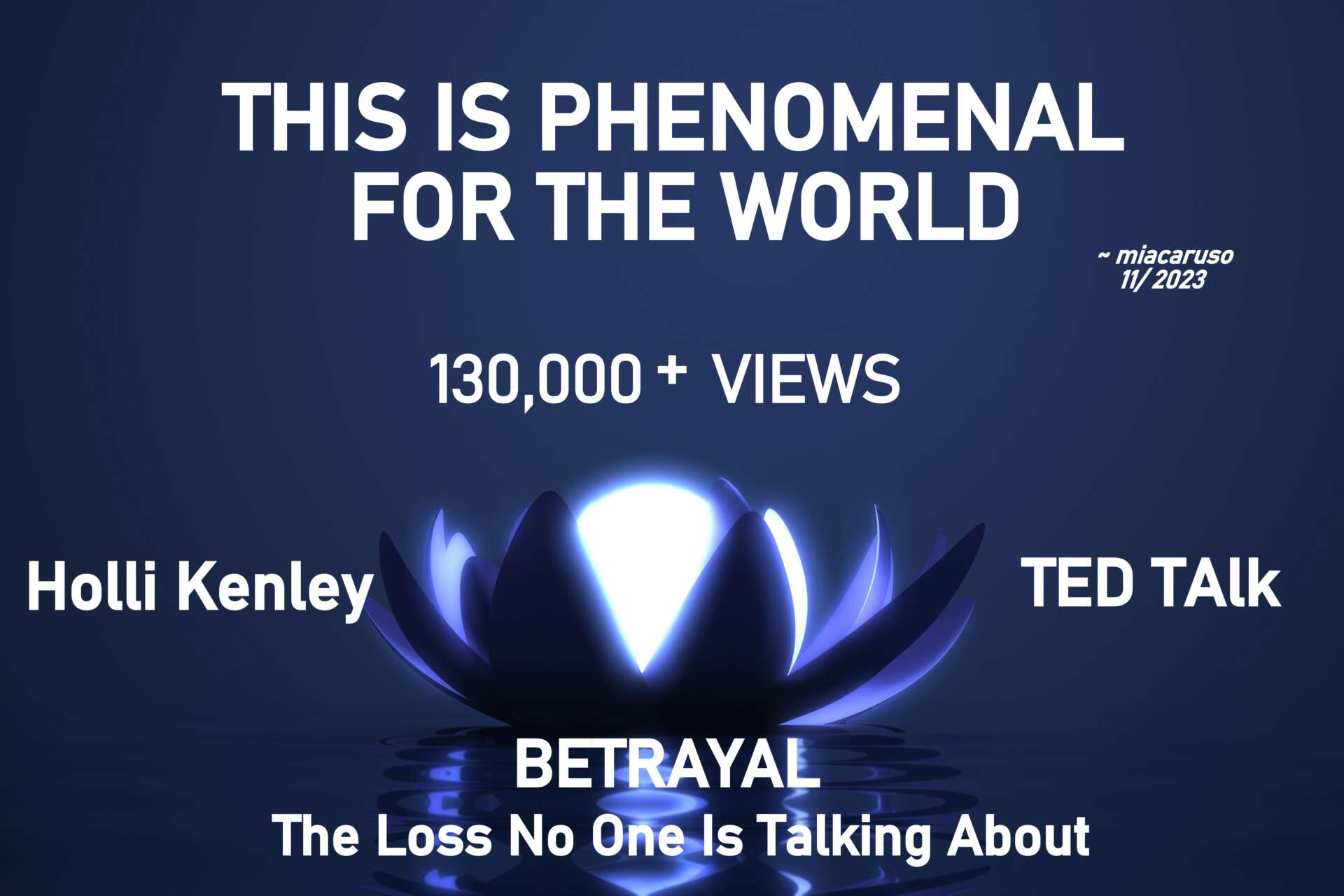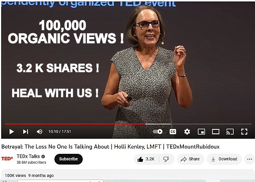 As a result of taking the risk to share my research and ideas around betrayal trauma, I was invited to speak at TEDxMountRubidoux September 24, 2022. Since my talk Betrayal: The Loss No One Is Talking About, was uploaded onto TED and TED YouTube on October 5th, 2022, to date it has received over 135,000 views, 4 K likes, and nearing 500 comments.