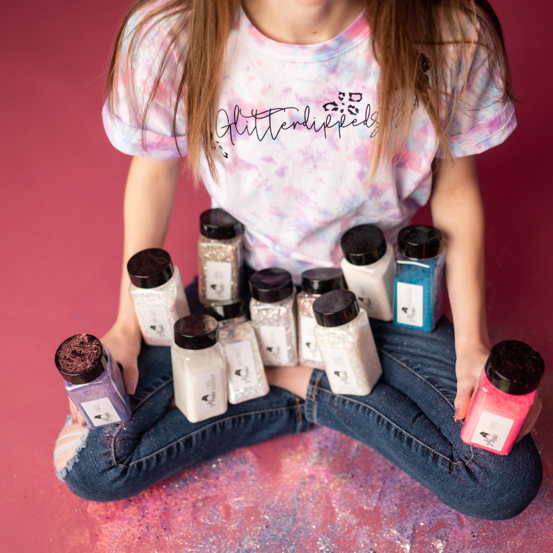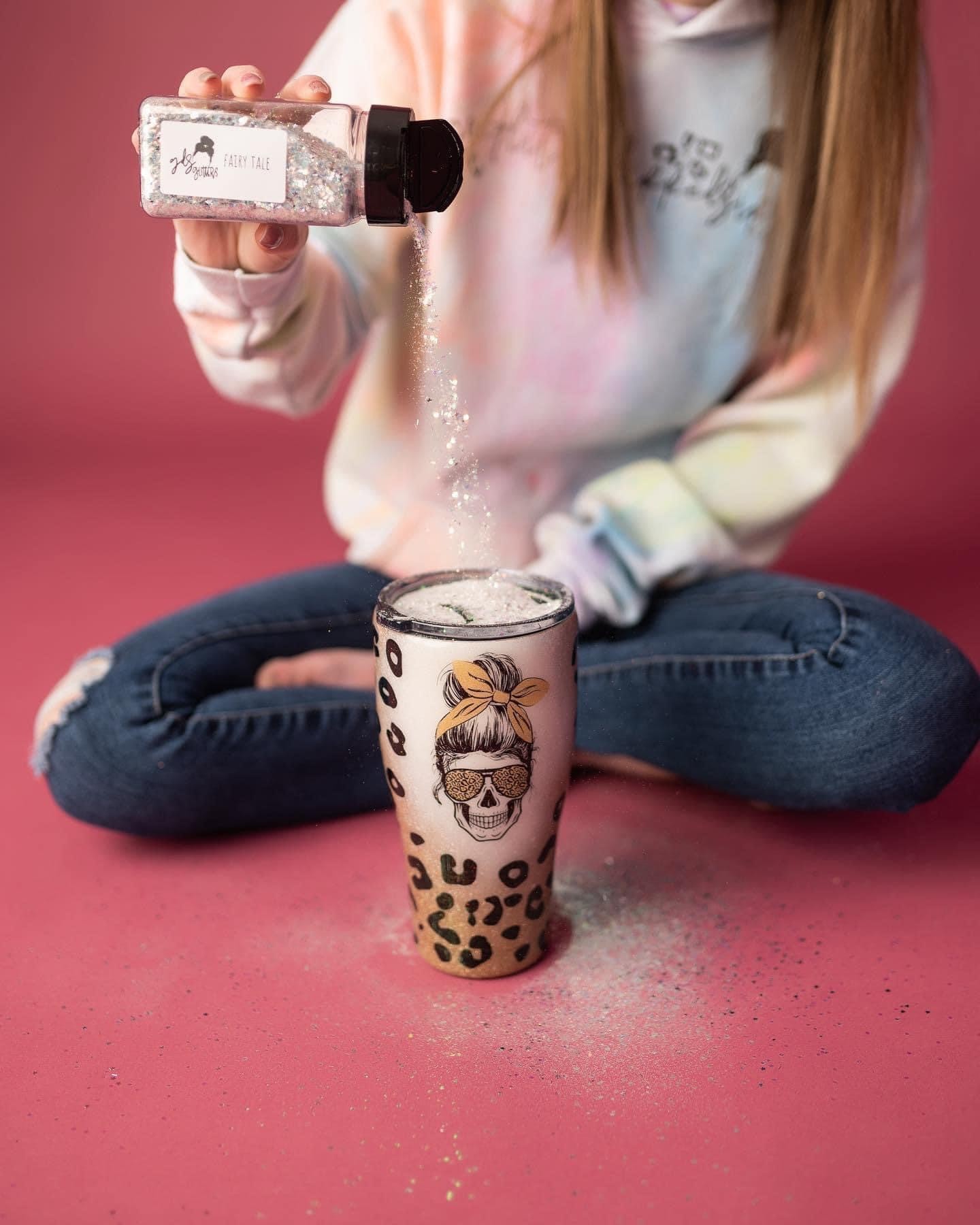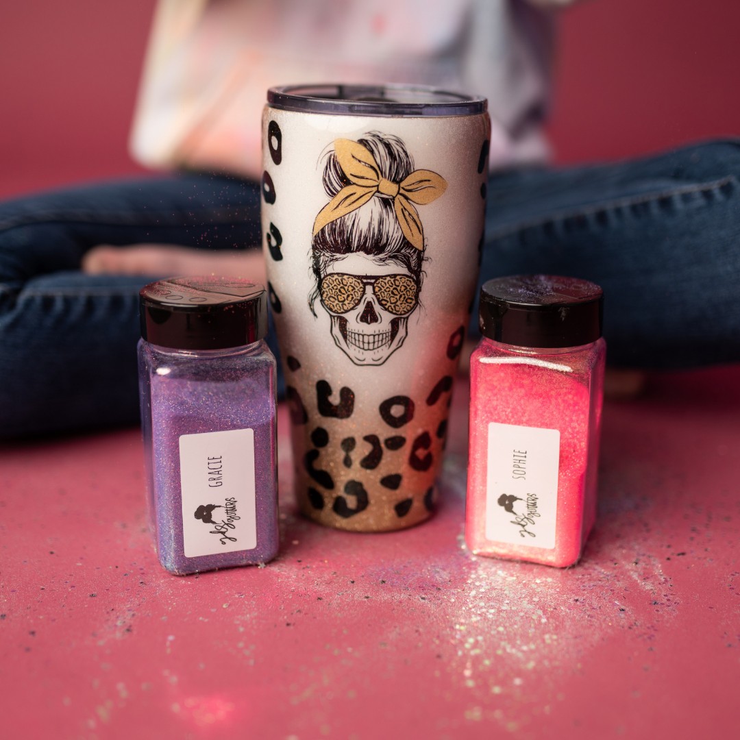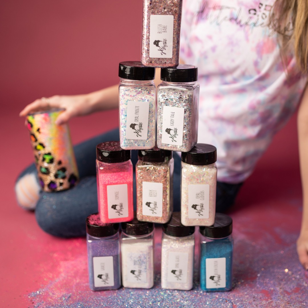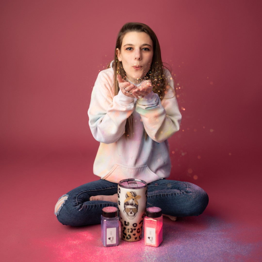 around 2020 i had bounced the idea around of expanding the business and becoming a glitter supplier too. glitter was the root of the entire business. it’s essentially how i began making tumblers to start with. i just love glitter. i went back and forth for awhile with the idea because it was such an expensive investment and to be completely honest i had no idea what i was doing or needed to be done to start. in 2021 after a ton of research and samples from a ton of glitter suppliers i just did it. you know how they say when you know you know, it was kind of like that for the glitter business. i had just gotten another round of samples and something just came over me telling me to stop hesitating and do it. so i did, within the hour i had ordered my start up inventory and said we’re all in now!