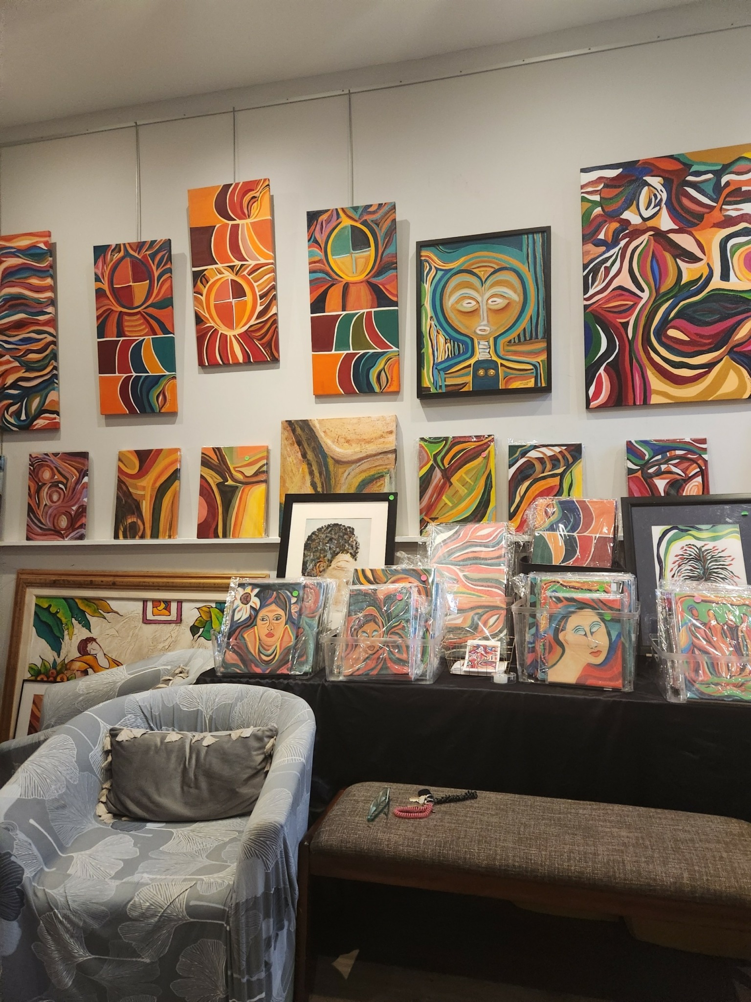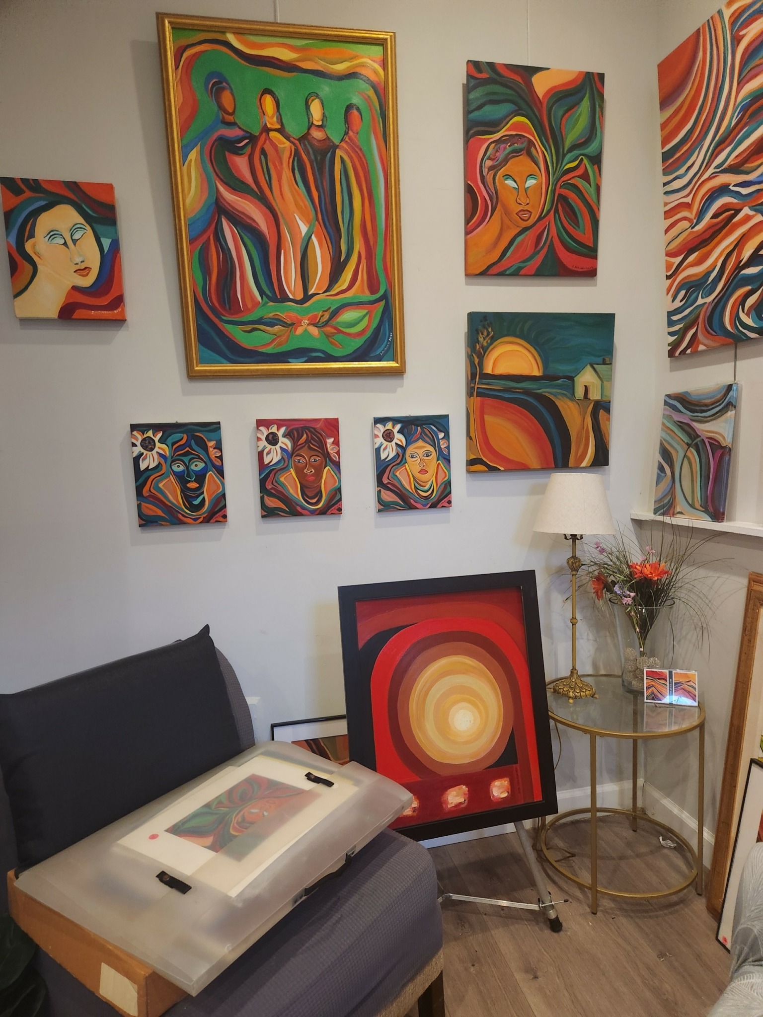 I paint wherever I can—usually in small corners of my home, where canvases stacked up and brushes shared space with everyday life. This is how I work, I get up often in the middle of early mornings to return to a painting. This is a private part of my work and it’s in my home. When I started selling my originals, people would come inside and I would have to make arrangements around the living room. It was not comfortable having people come into my house.