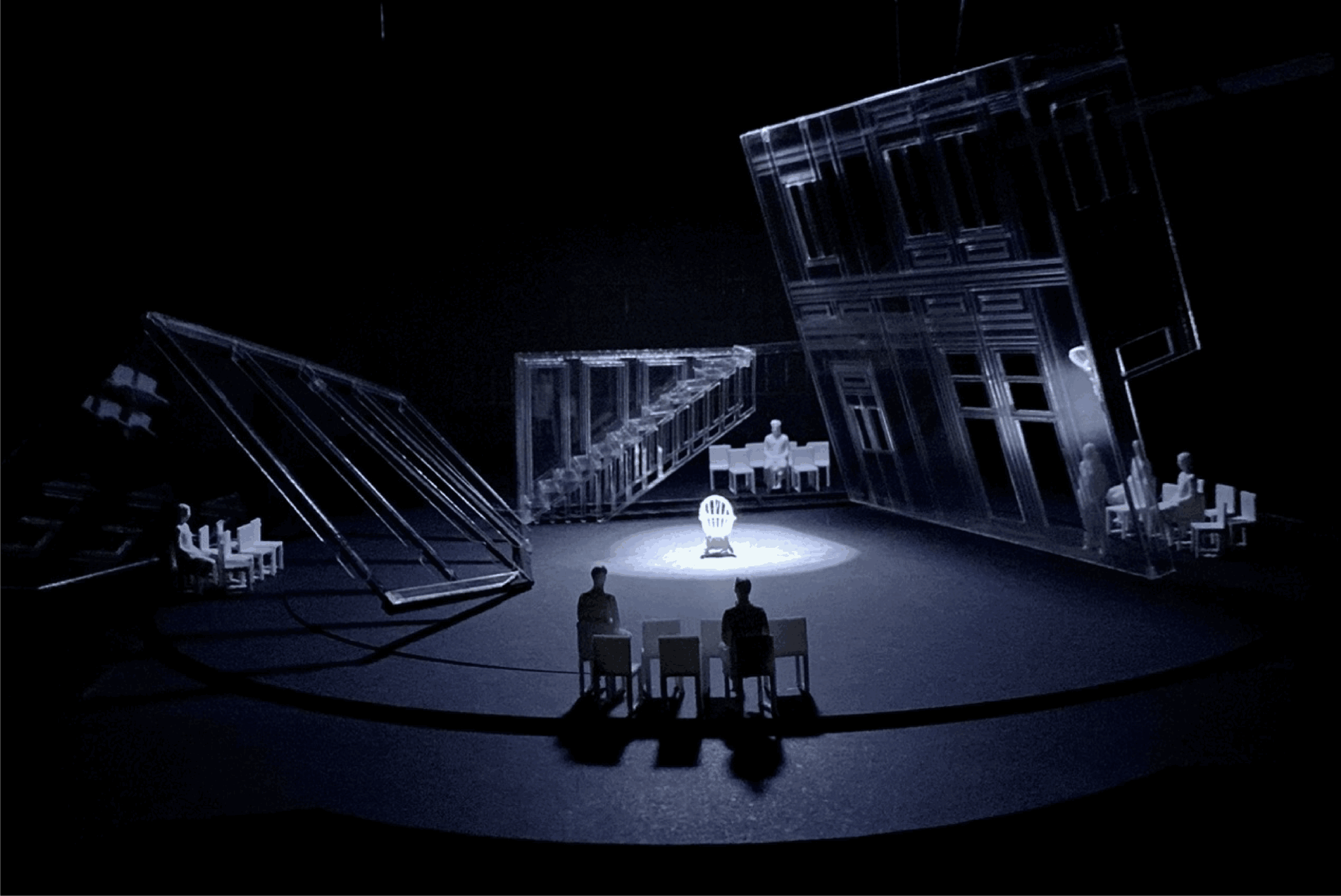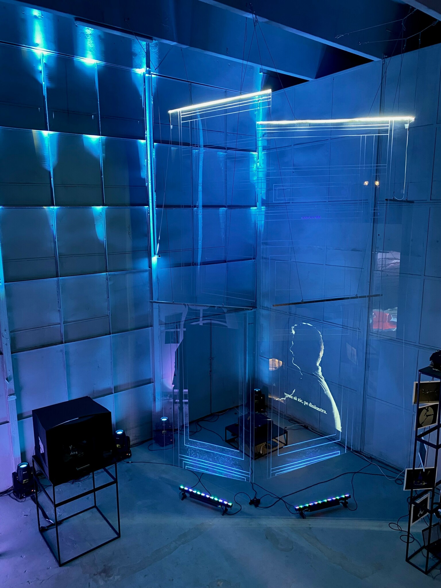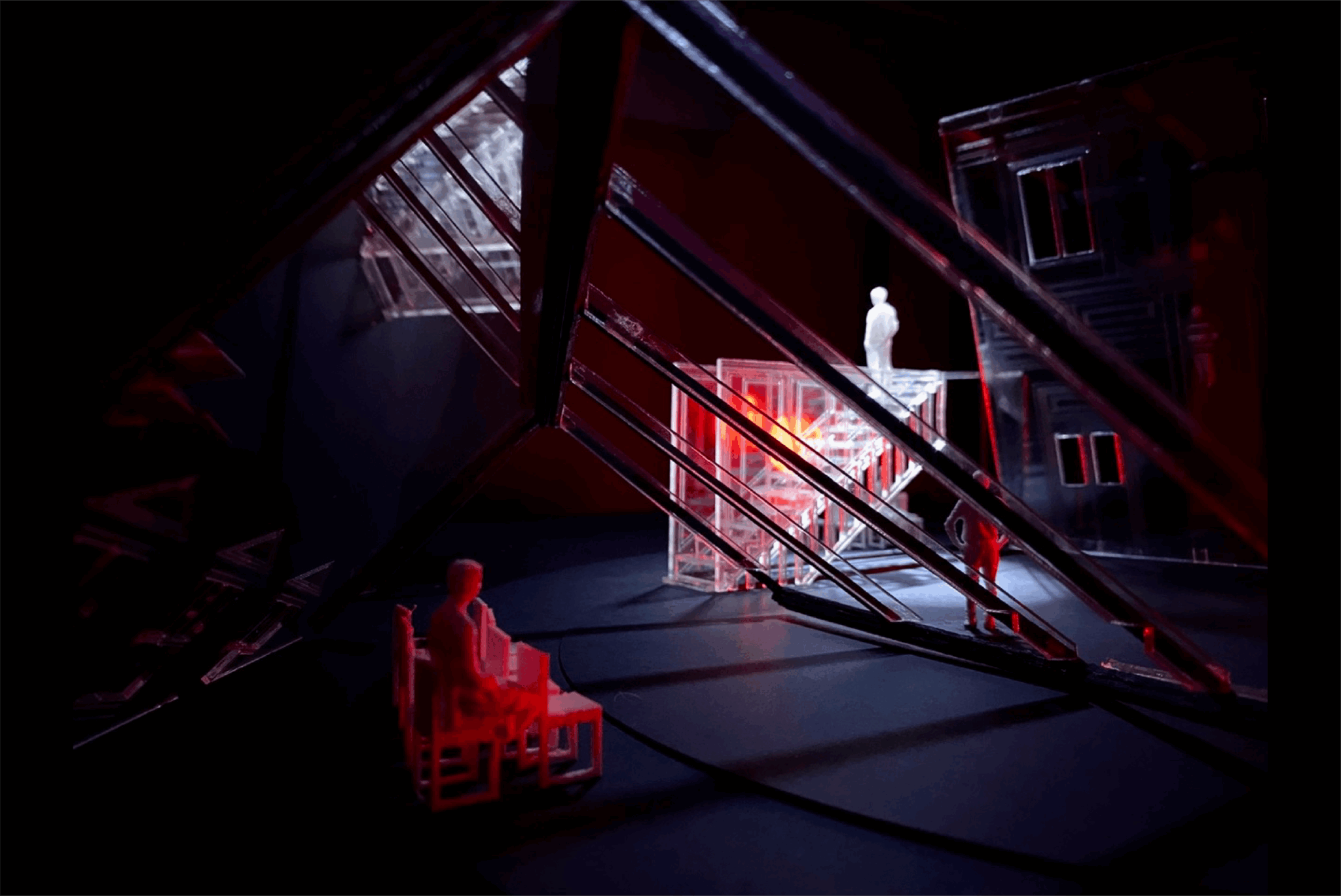 I created an installation based on my scale model and adapted my stage design into an immersive installation that tied together sound, light and space design into a warehouse type facility. I had to build everything from scratch, without a team or workshop. I had some money aside from working as an assistant stage designer and put it all towards creating this piece, A 6m high by 4m wide carved plexiglass panels, suspended on metal wire from the ceiling. I learned a lot and looked for guidance when I was lost, but I was lucky to have supportive parents and a helpful partner that climbed up on the ceiling with me.