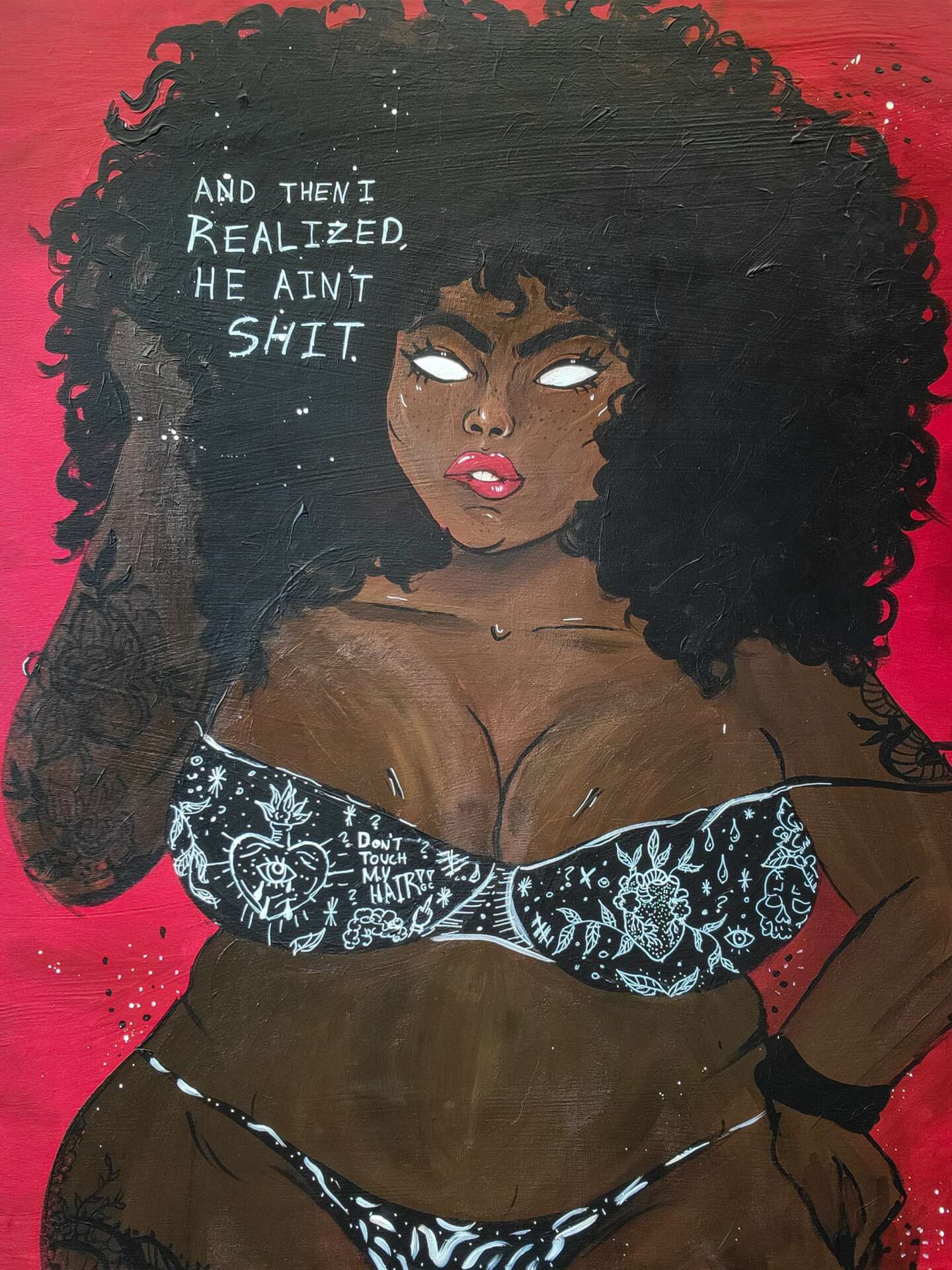 For me the transition I went through in college really shaped who I am as an artist. Growing up Puerto Rican and Dominican with my fairer skinned, straight/ soft curly , haired cousins it was easy to feel like I didn’t belong. My hair was called nappy, my skin was mocked if it absorbed “too much” sun. I rarely saw myself the media I consumed and if I did they were surely never the main character of the focus of an artistic work. Countless hours in art history class, attending live drawing nights, down to the advertising of my favorite products. I had a transformative moment in the rain on the way home from class after being encouraged by my roommates and friends to stop straightening my hair and wear it naturally. I would usually hide from the rain so that it would not make my hair frizzy but finally that day enough was enough. I closed my umbrella and I let the water fall on my hair as I started up clipping my tracks. I felt such a sense of relief and freedom. So much of myself was wrapped up in eurocentric standards of beauty. From that moment on I decided to make art for me and people that looked like me. I remember one professor saying “You can’t just make a design for you and your friends” to which I replied “Why not? No one else is designing with us in mind.”