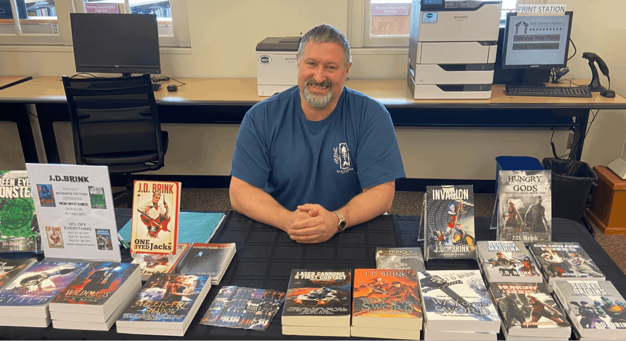 The local library book sale shot was taken with my phone by a fellow author there; I don’t know her name.