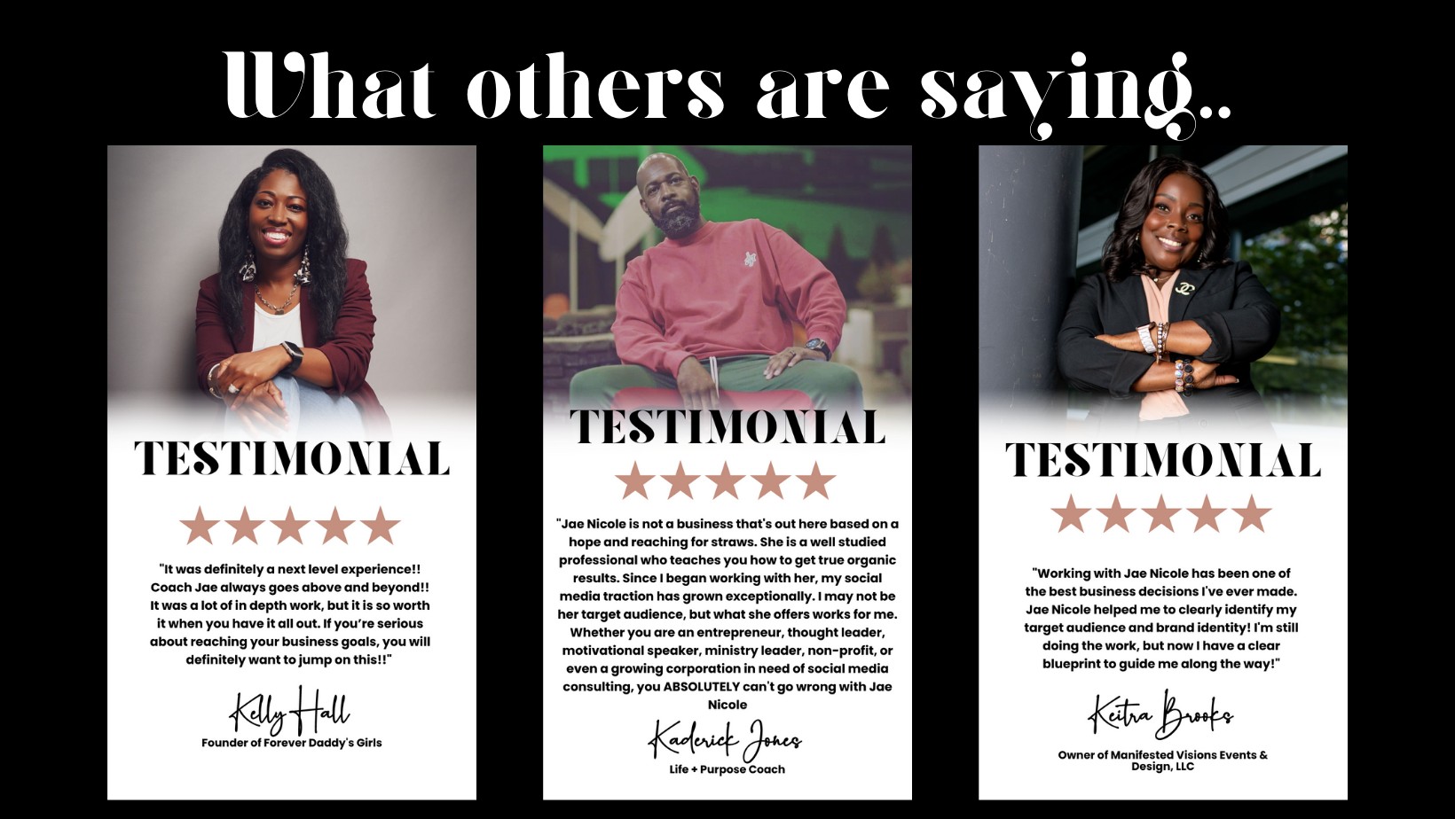 I’m Coach Jae Nicole. I’m a Certified Life + Brand Coach with a passion for helping individuals translate their God-given purpose into their businesses and the marketplace.