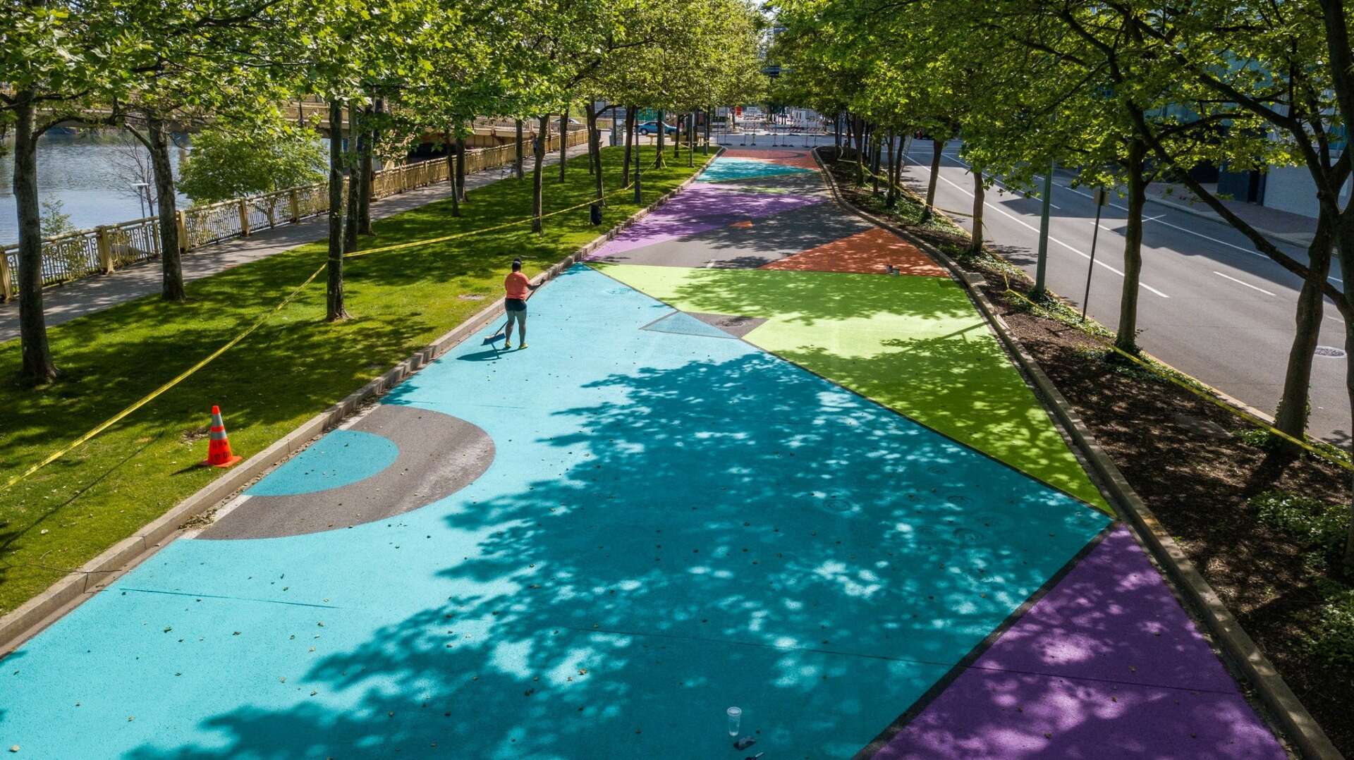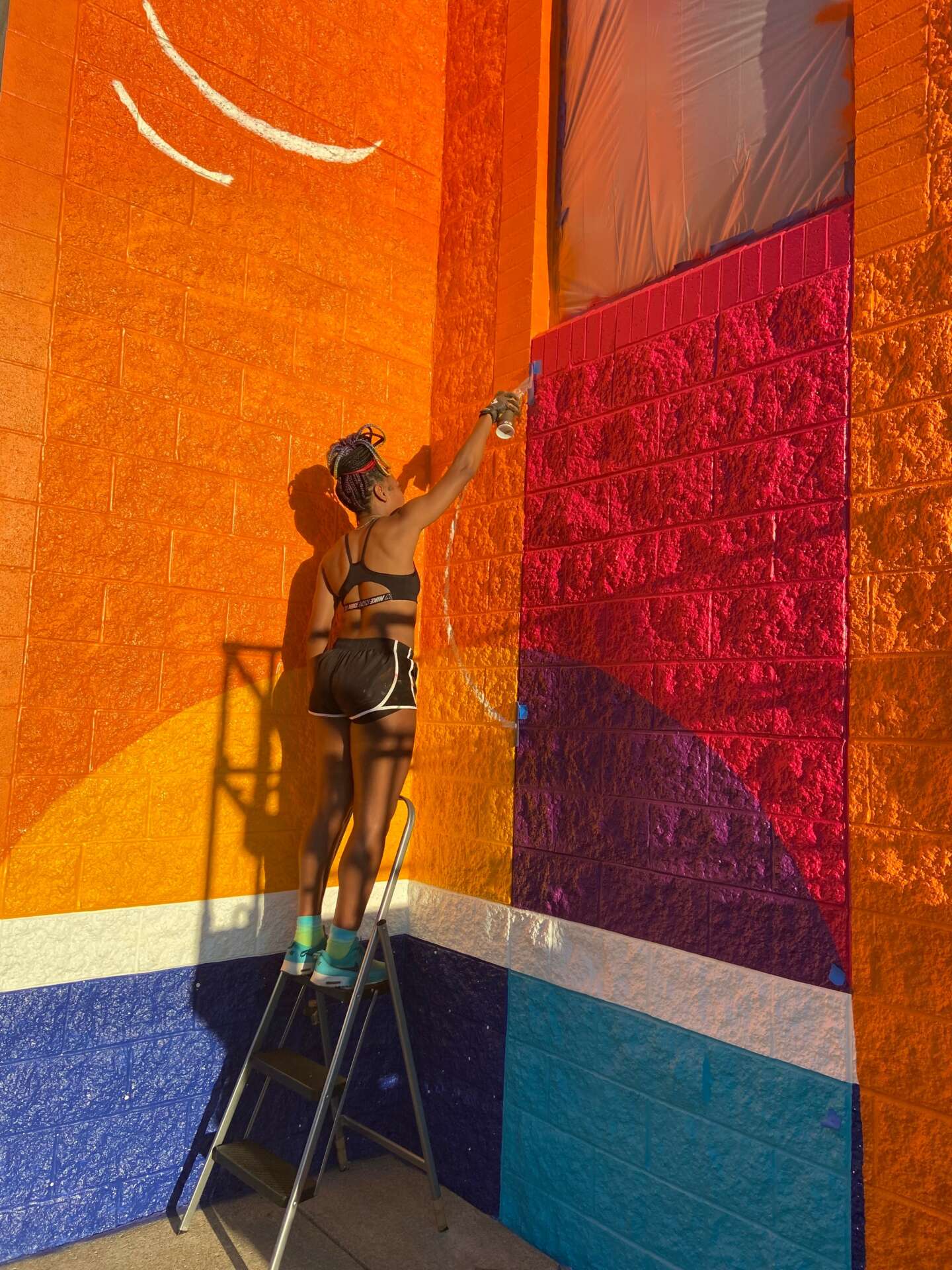 I always come back to the goal of creating from a place of joy. It is a rebellious way of acknowledging myself and taking up deserved space (both physically as public art and metaphorically as a Black artist). While our (painful) histories are important to name, I often ask “What would it look like if we created from a place of joy instead?” I enjoy exploring the abstract worlds of bold colors, shapes and lines that have become symbolic of vivid joy, community and connectedness. I think there is so much power in sharing these things that are intentionally overshadowed.